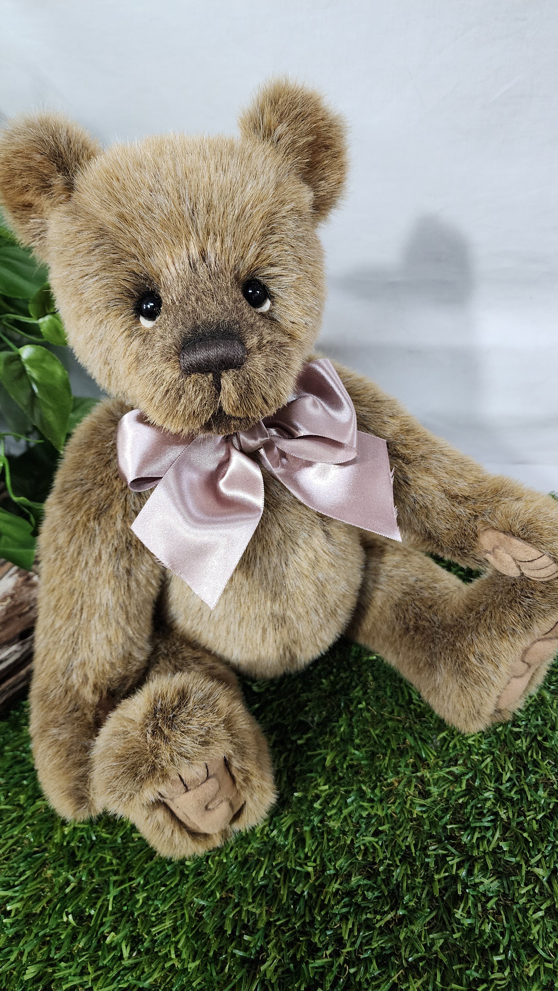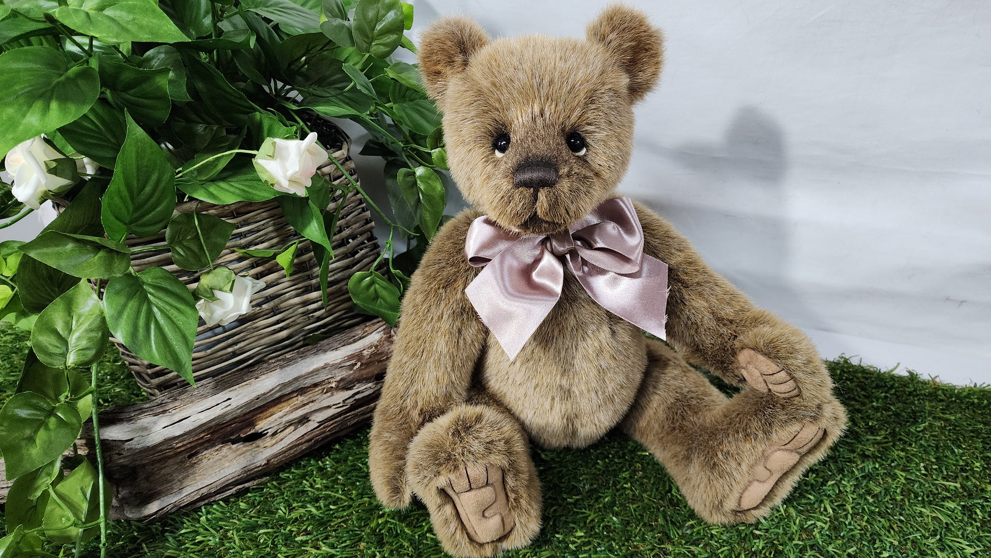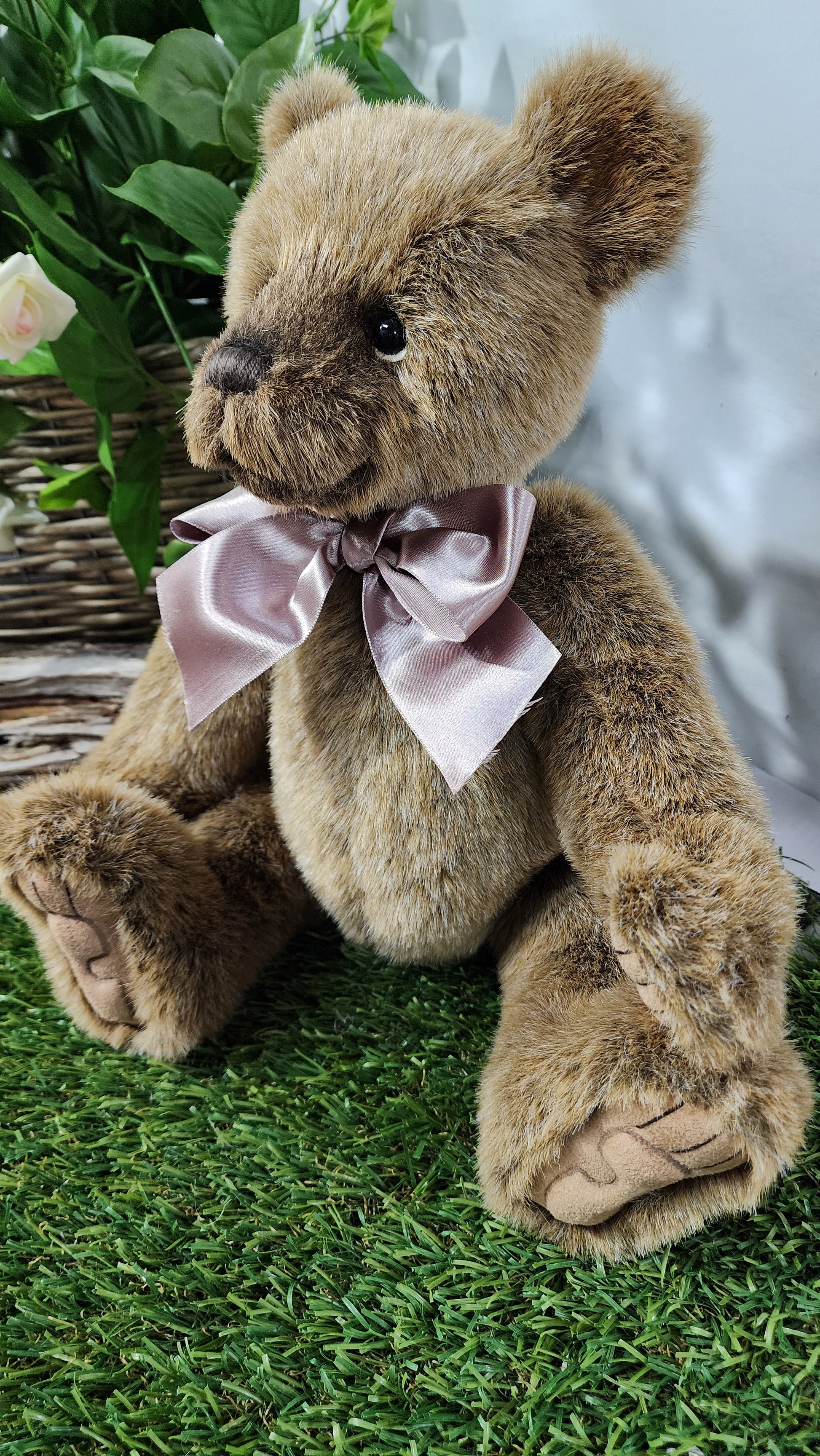 Isabelle Lee designed a traditional, timeless bear featuring a large belly and ticklish toes, rendered in brown palette and accented with a pewter satin bow.