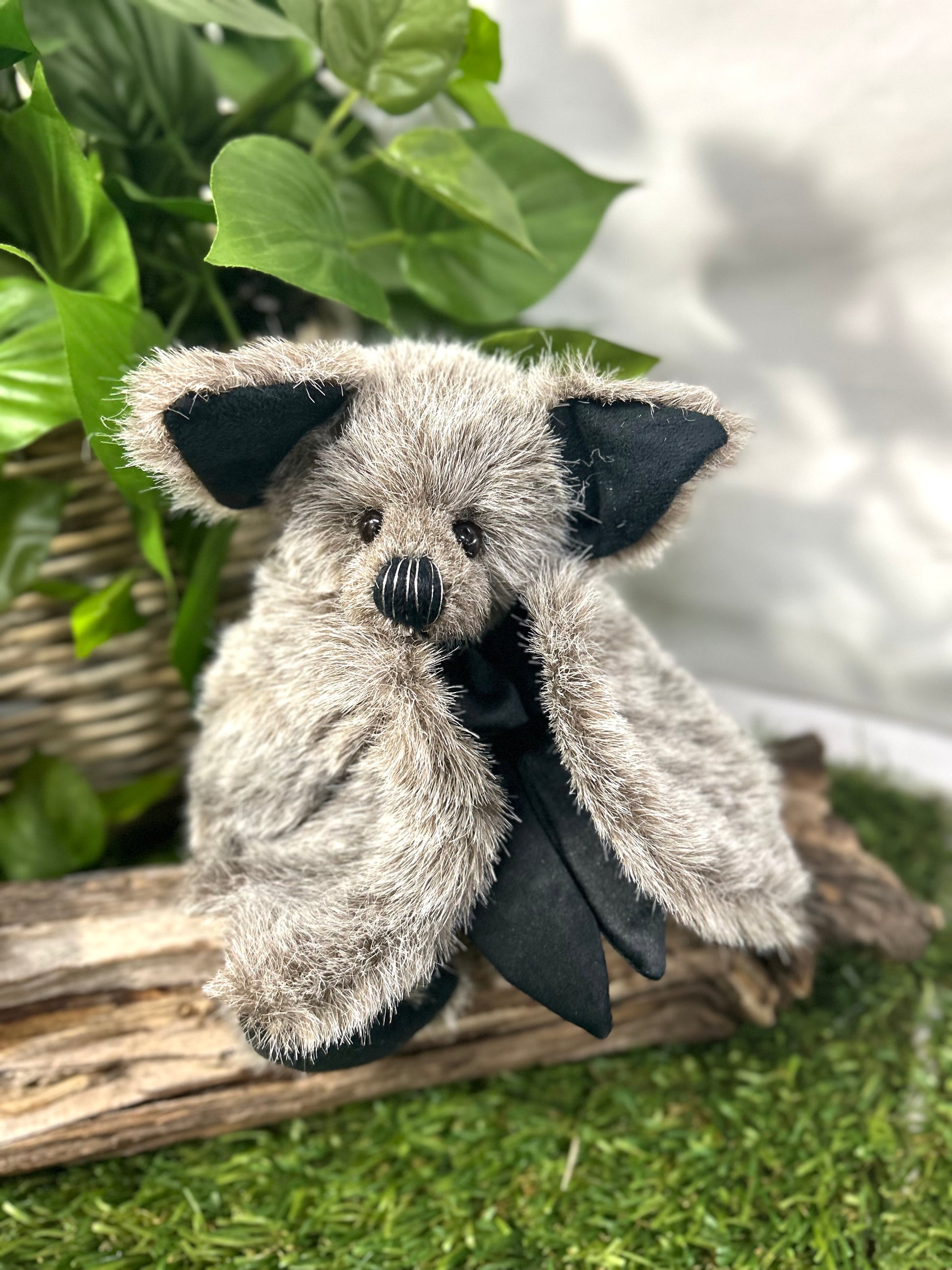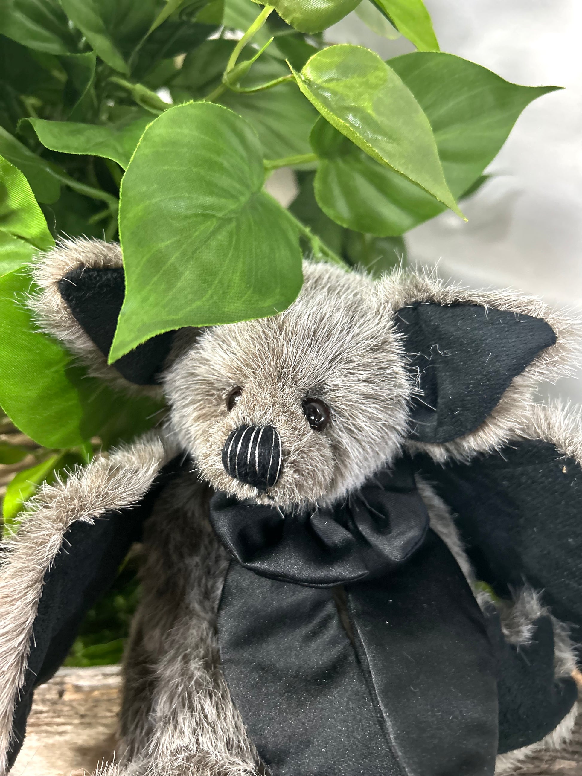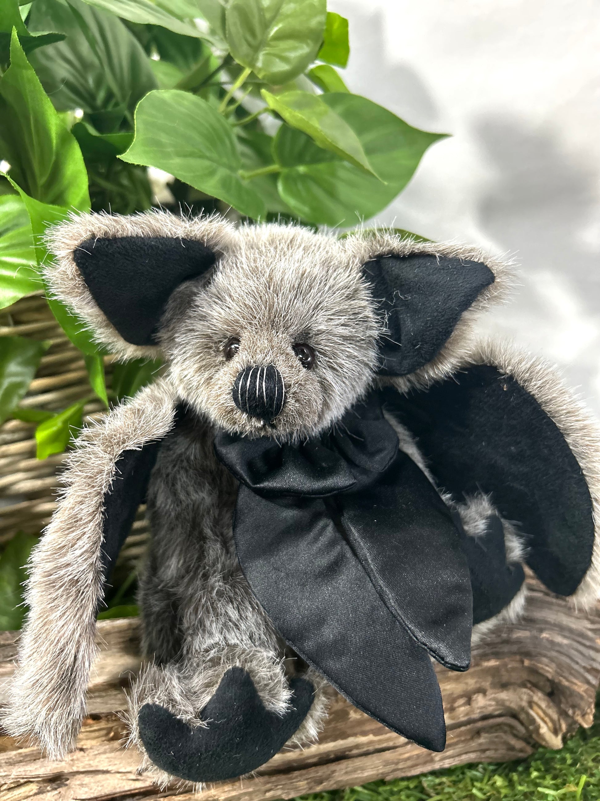 Charlie Bears presents a design featuring a bat, characterised by short, grey fur and a black satin bow. The design emphasizes the bats roosting together with the addition of Pippy Strell