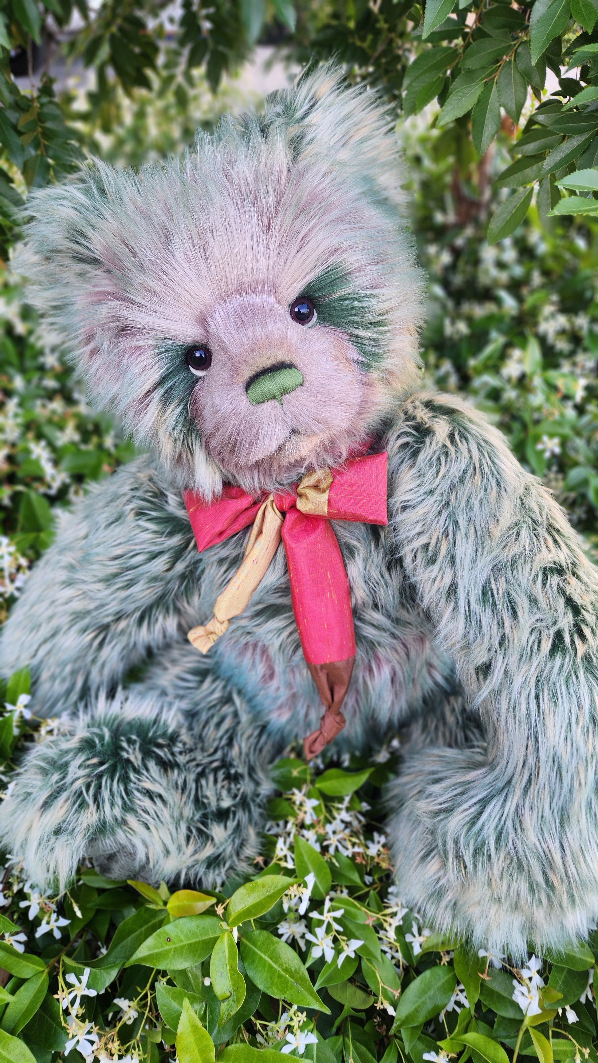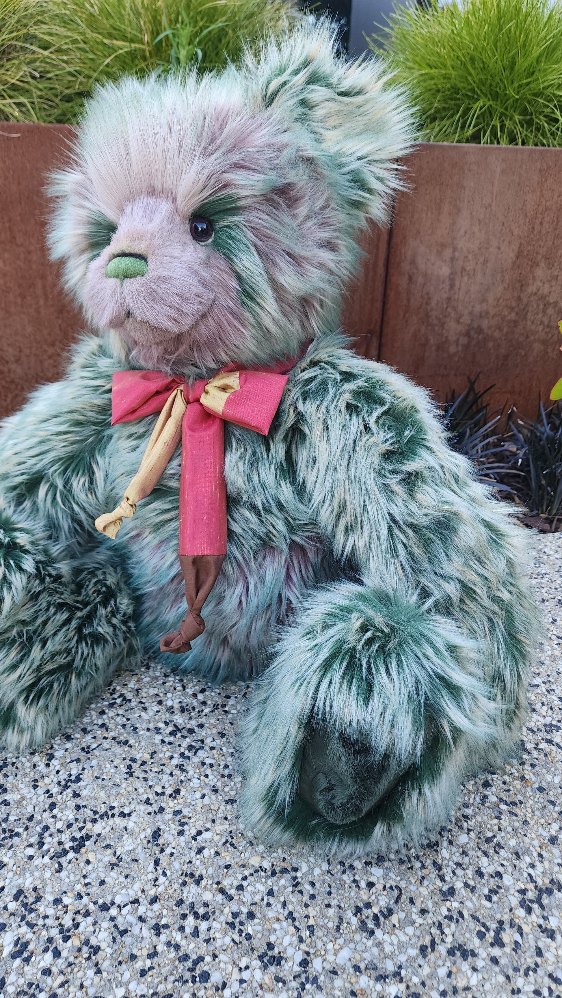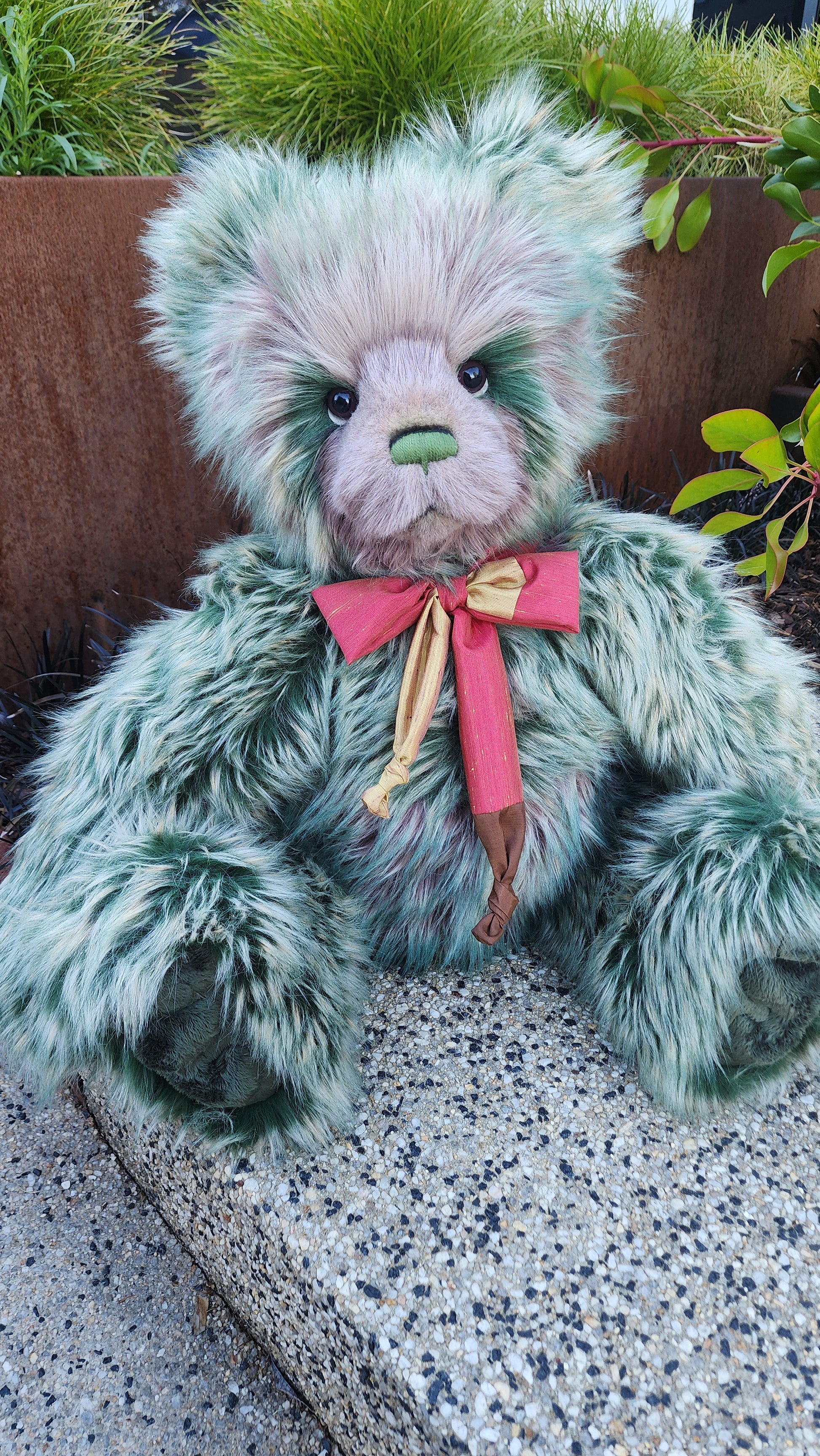 Isabelle Lee designed the "Bigger Bear" series. The large, panda faced bear, with a knitted scarf, long minty coloured fur, is gorgeous addition to your hug.