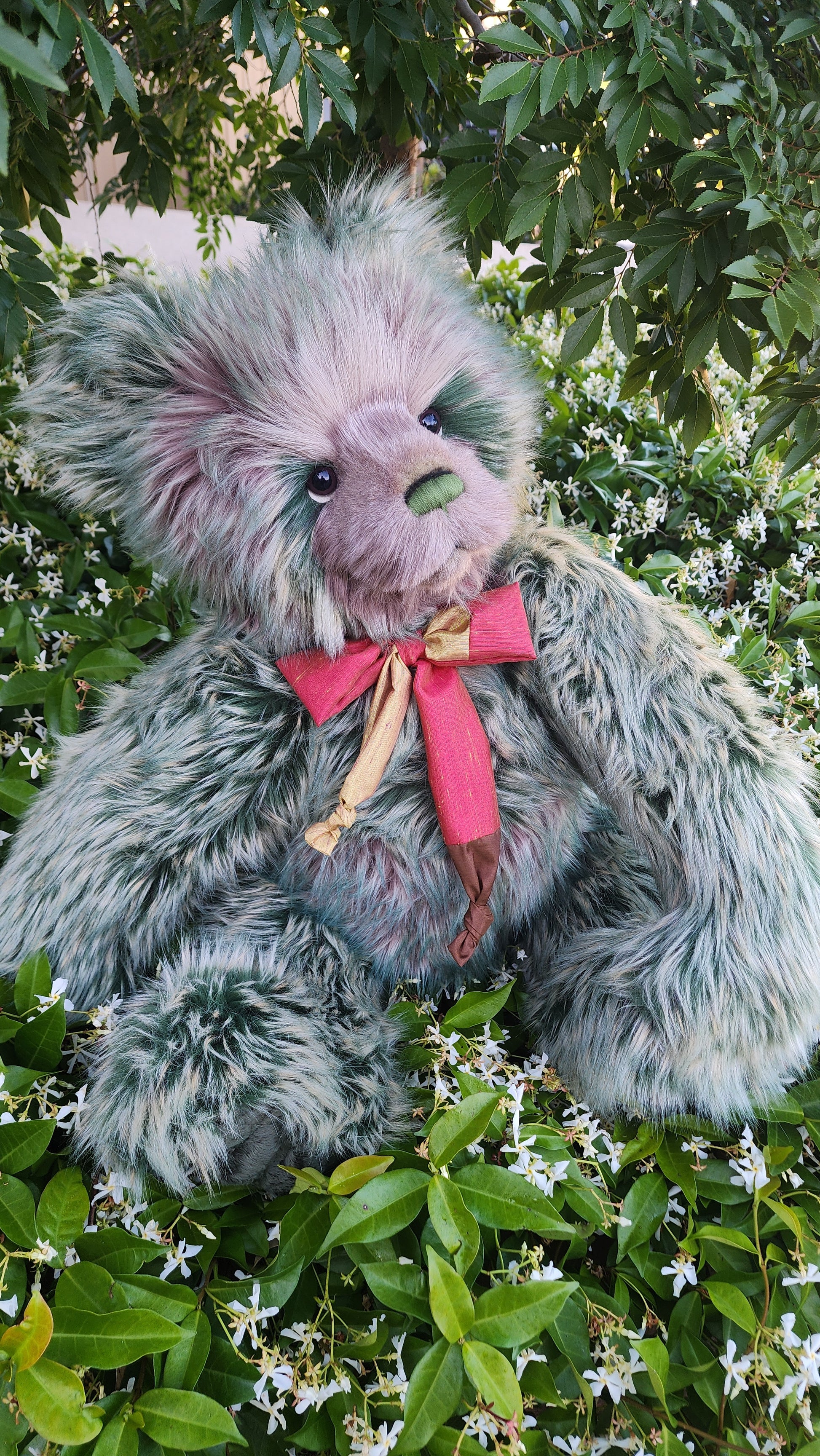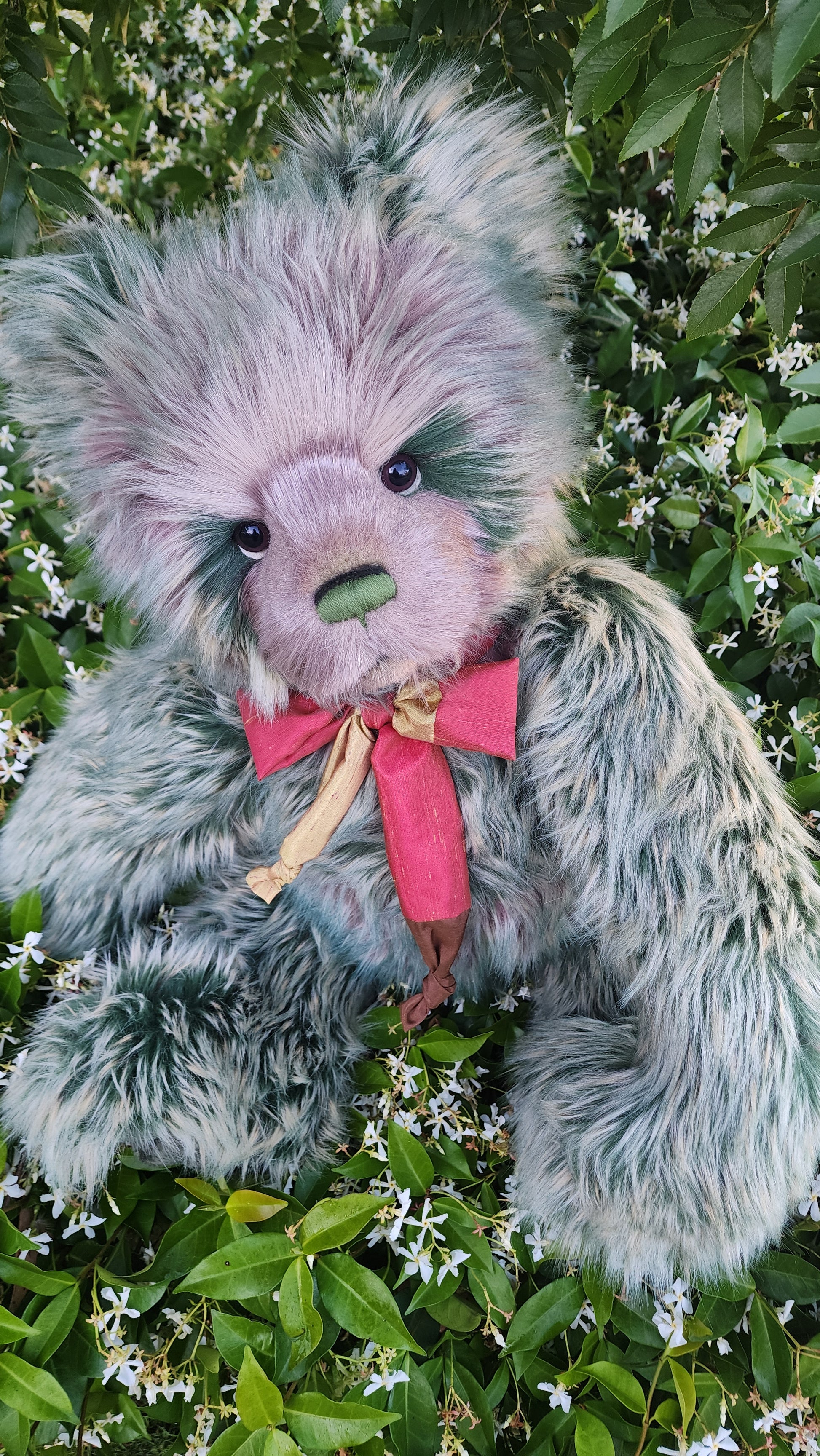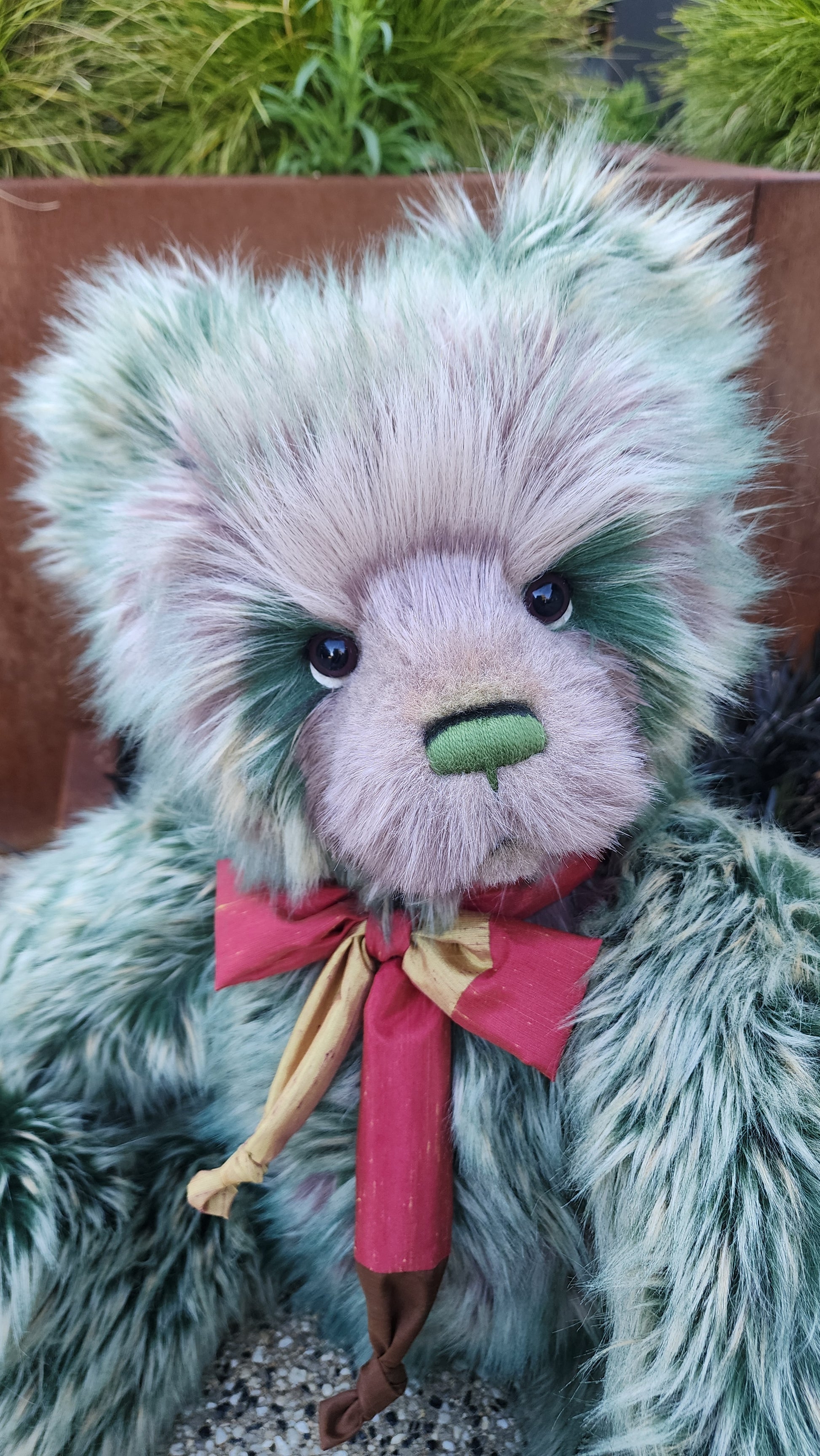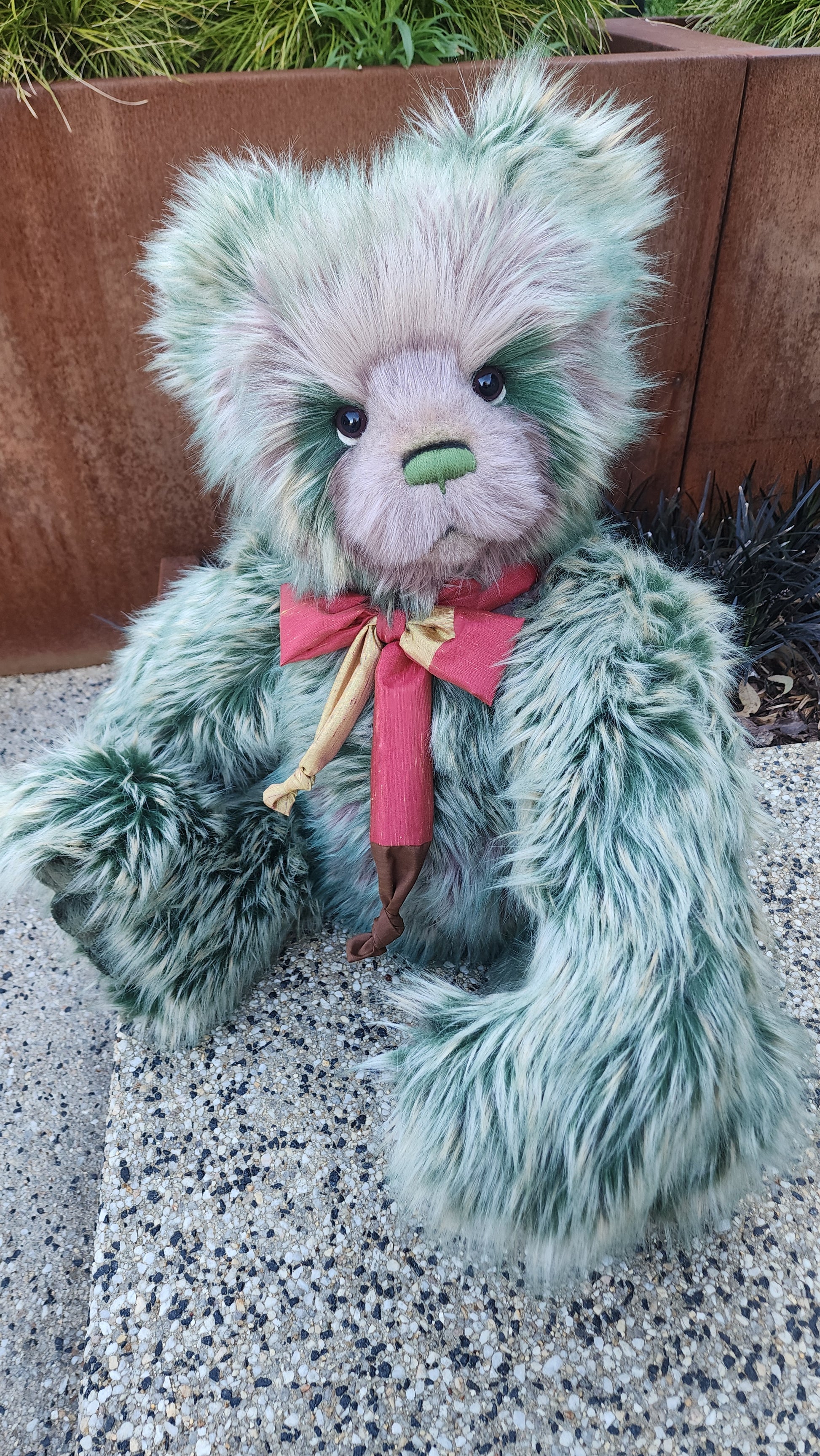 Isabelle Lee designed the "Bigger Bear" series. The large, panda faced bear, with a knitted scarf, long minty coloured fur, is gorgeous addition to your hug.