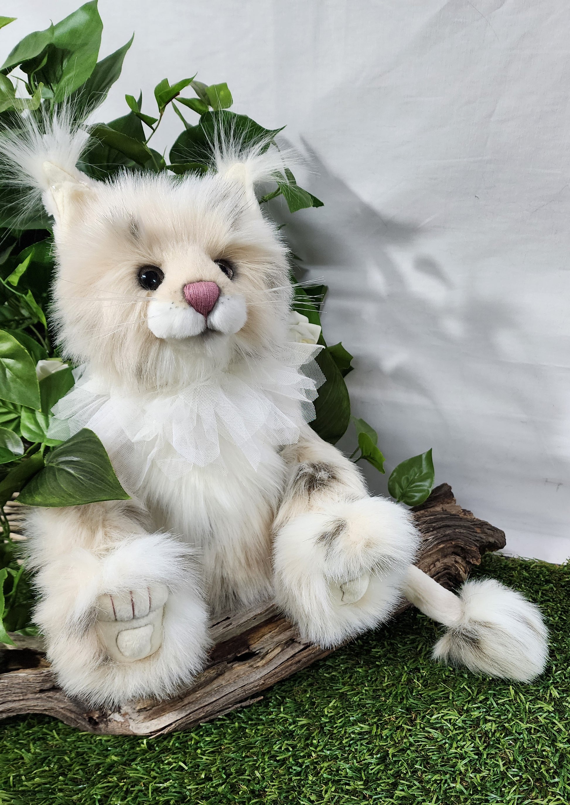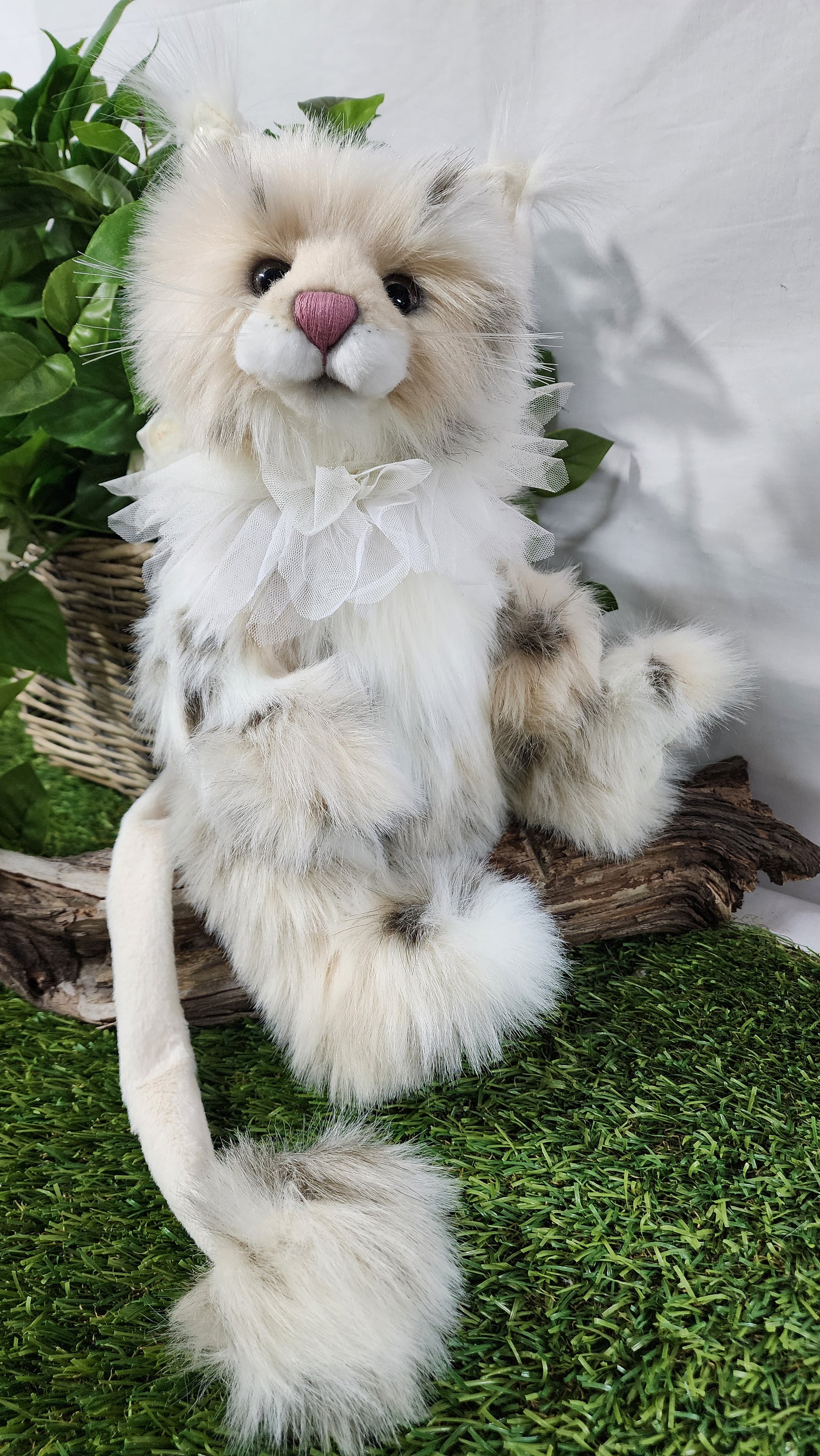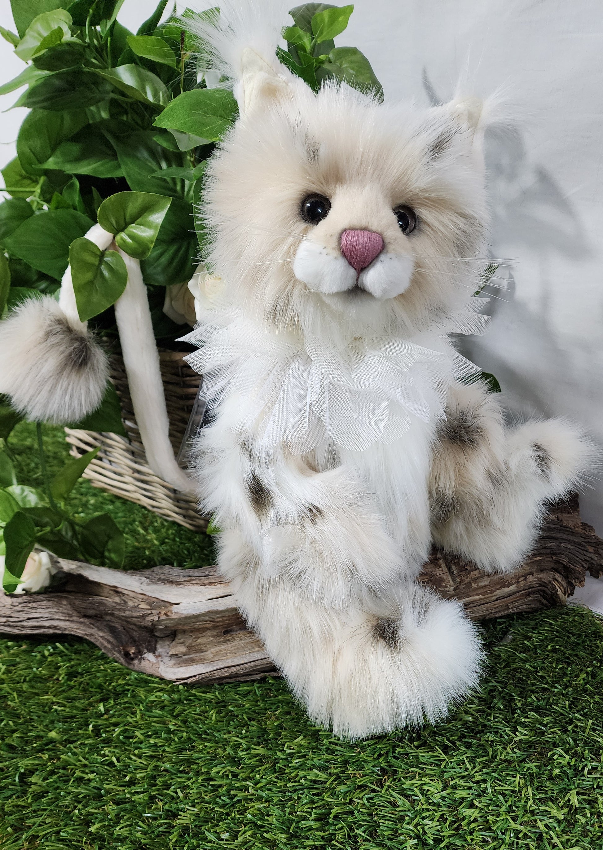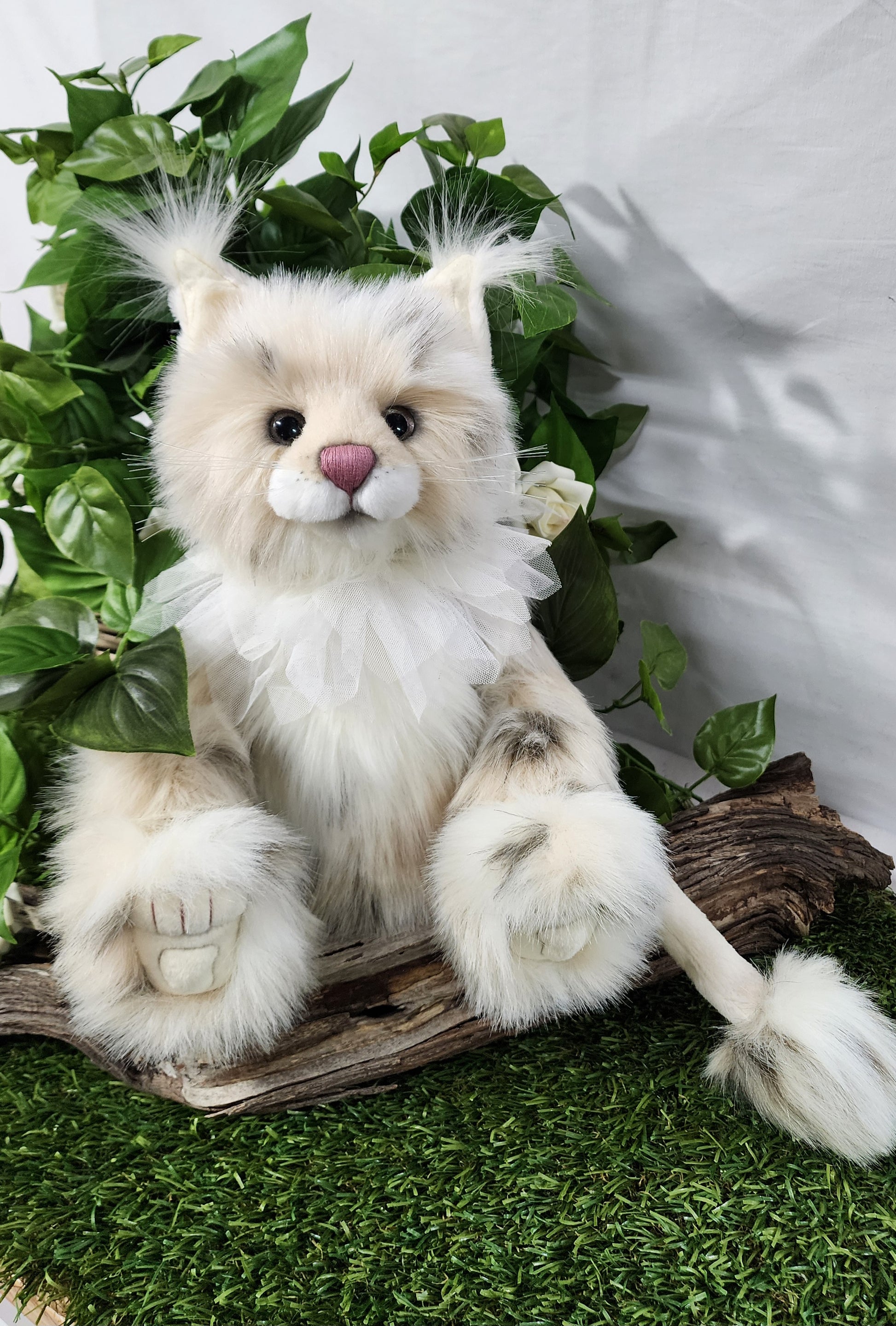 She has a hand stitched nose, mouth and toe detailing upon her superbly sculptured paws. She is wearing a beautiful lace collar around her neck which is glistening with glitter. This amazing cat also features glitter in her eyes and inner ears and has the most magnificent tail complete with a pompom on the end.