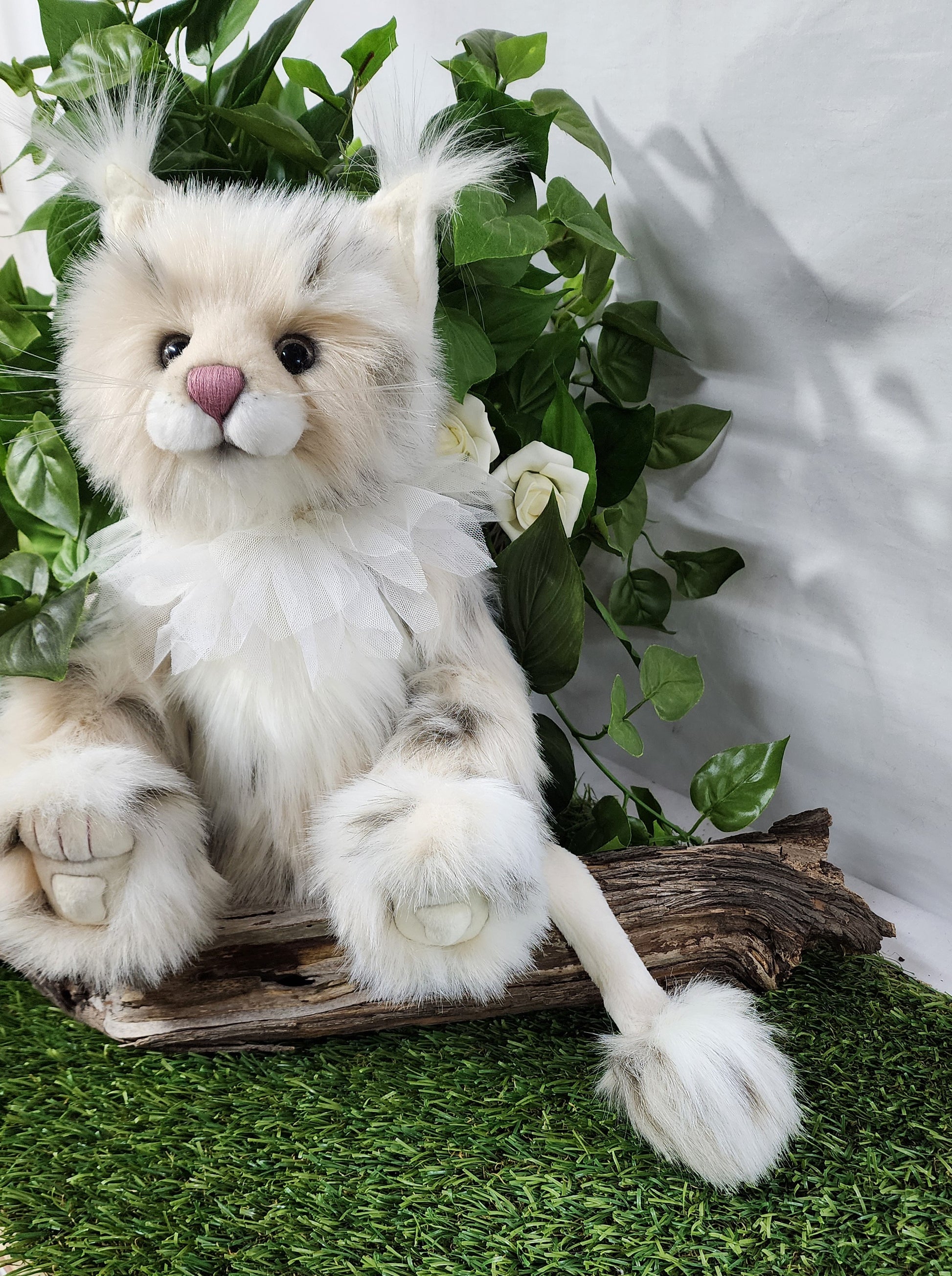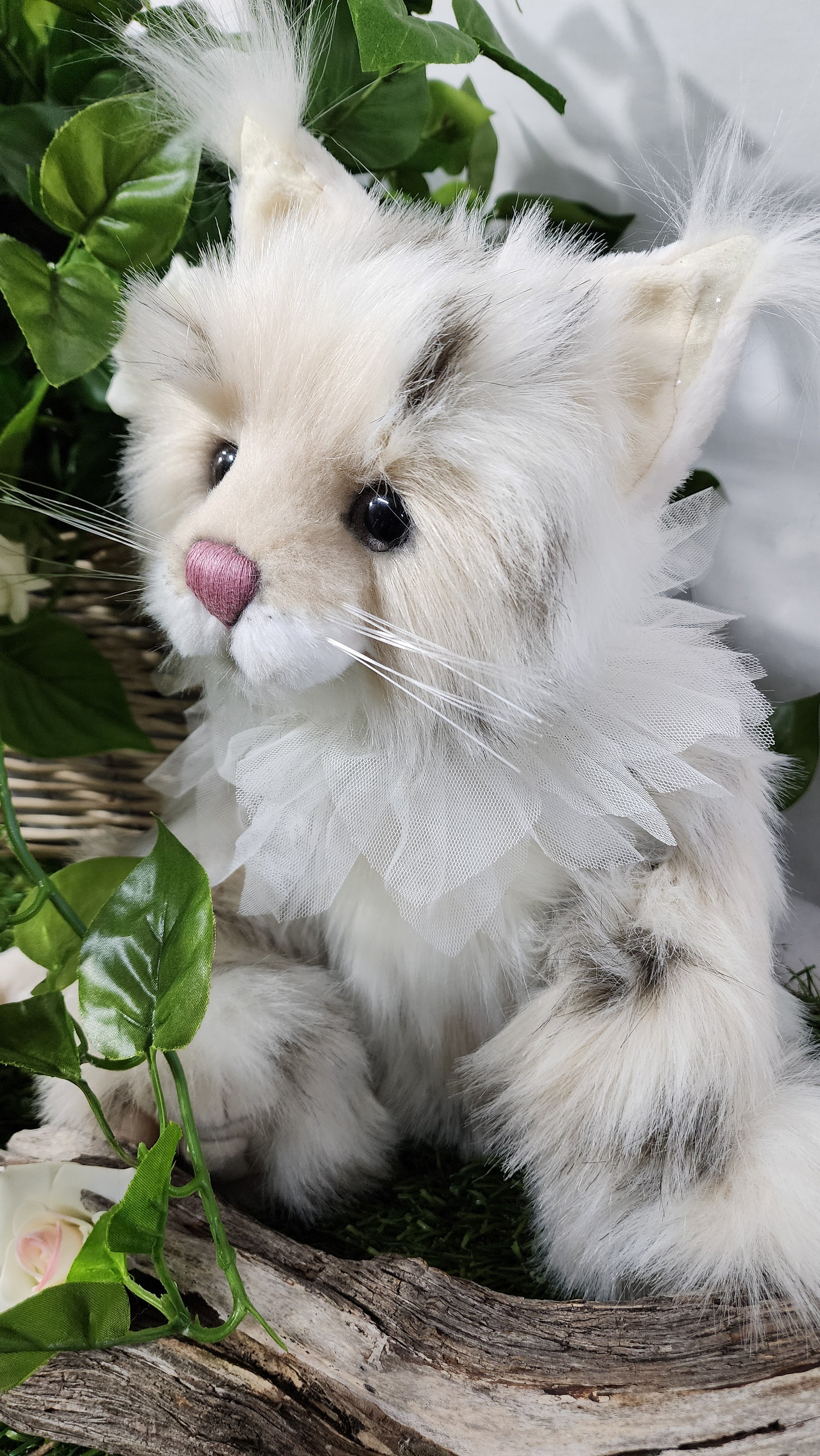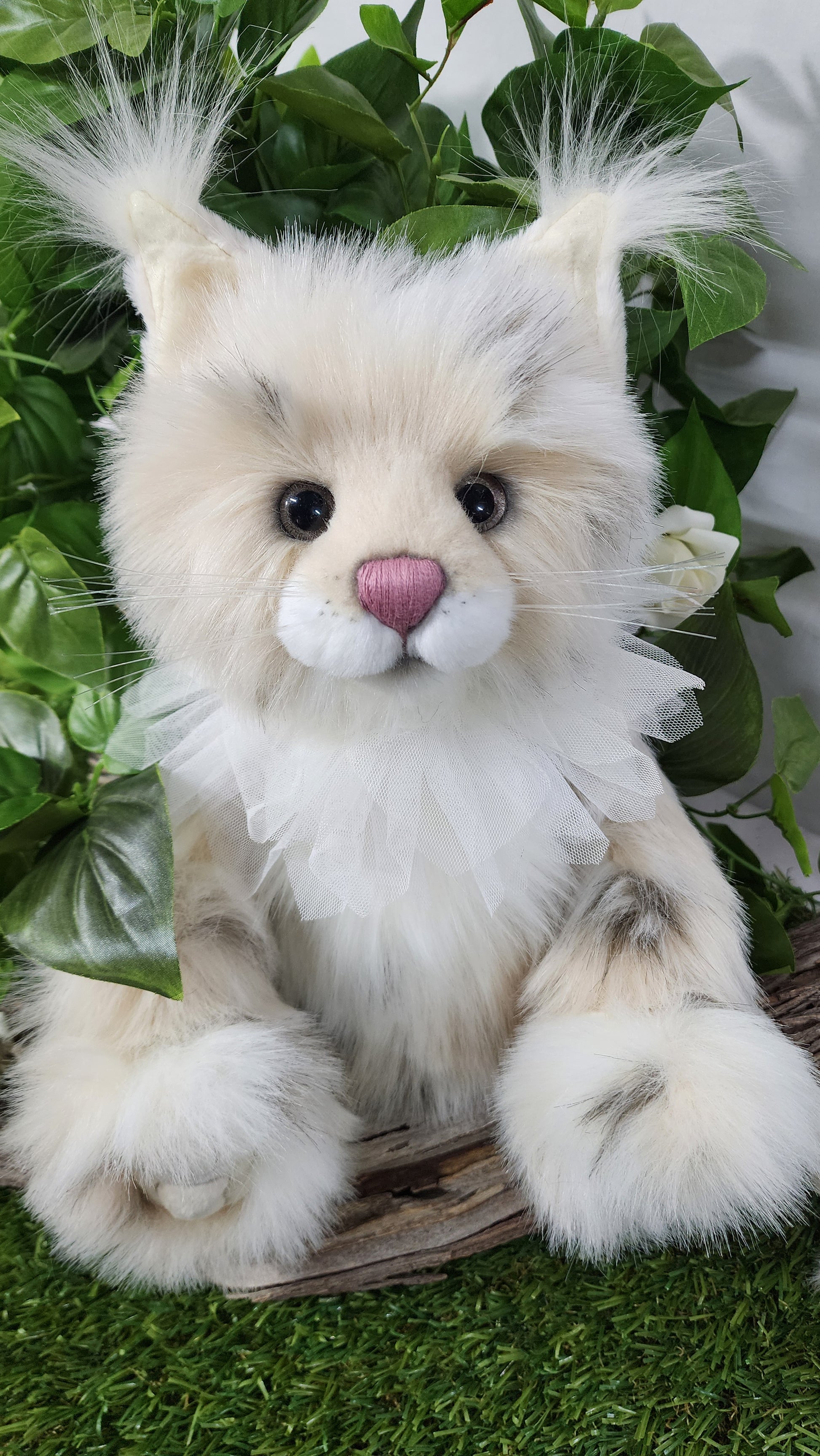 She has a hand stitched nose, mouth and toe detailing upon her superbly sculptured paws. She is wearing a beautiful lace collar around her neck which is glistening with glitter. This amazing cat also features glitter in her eyes and inner ears and has the most magnificent tail complete with a pompom on the end.
