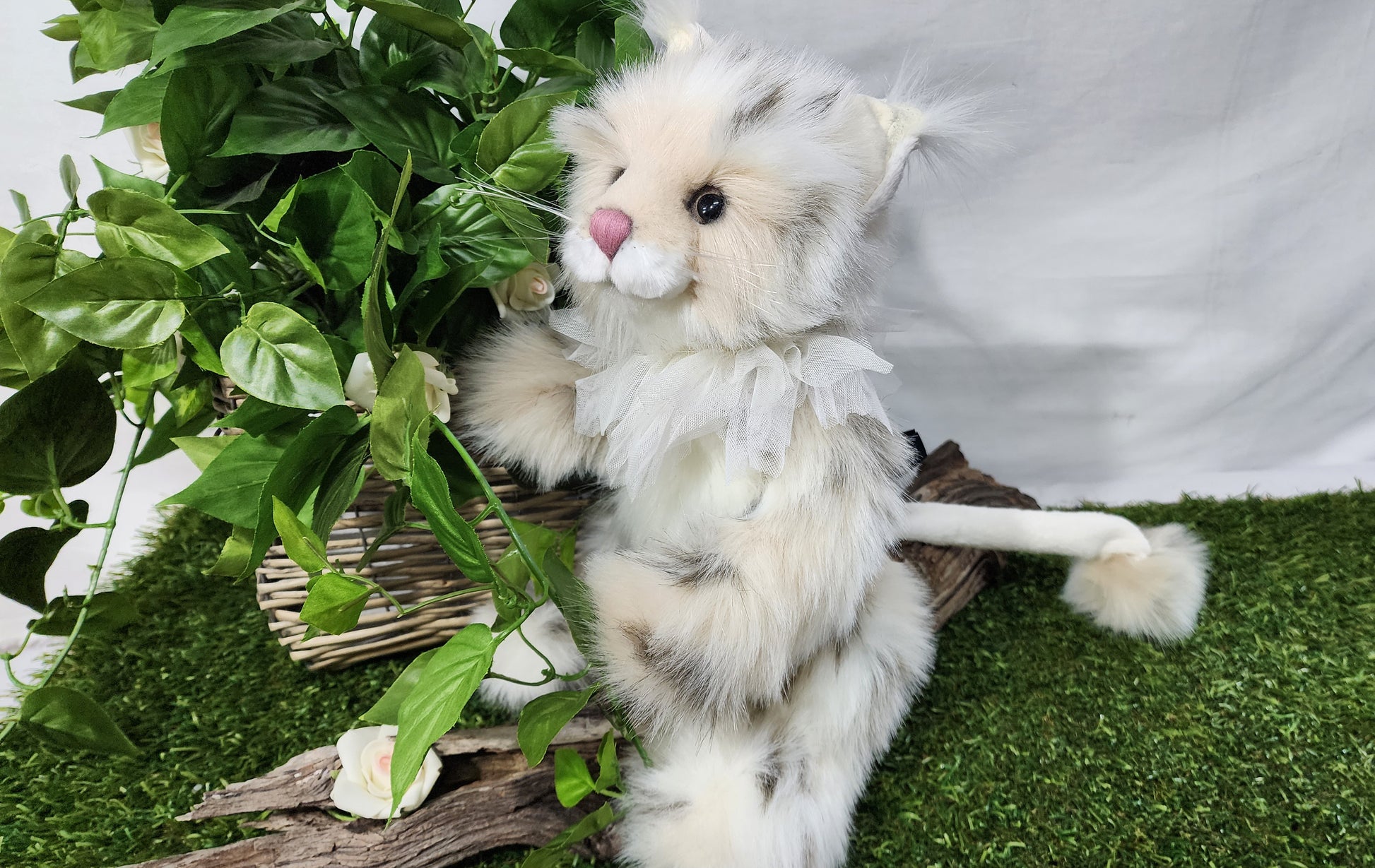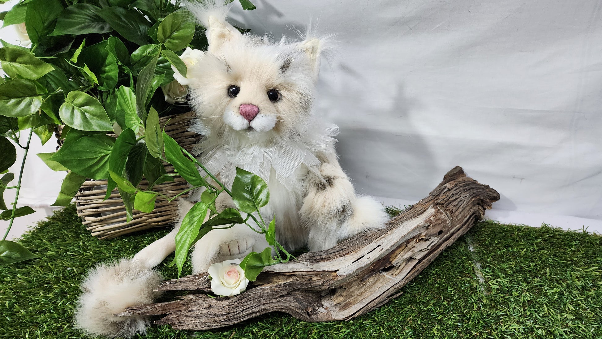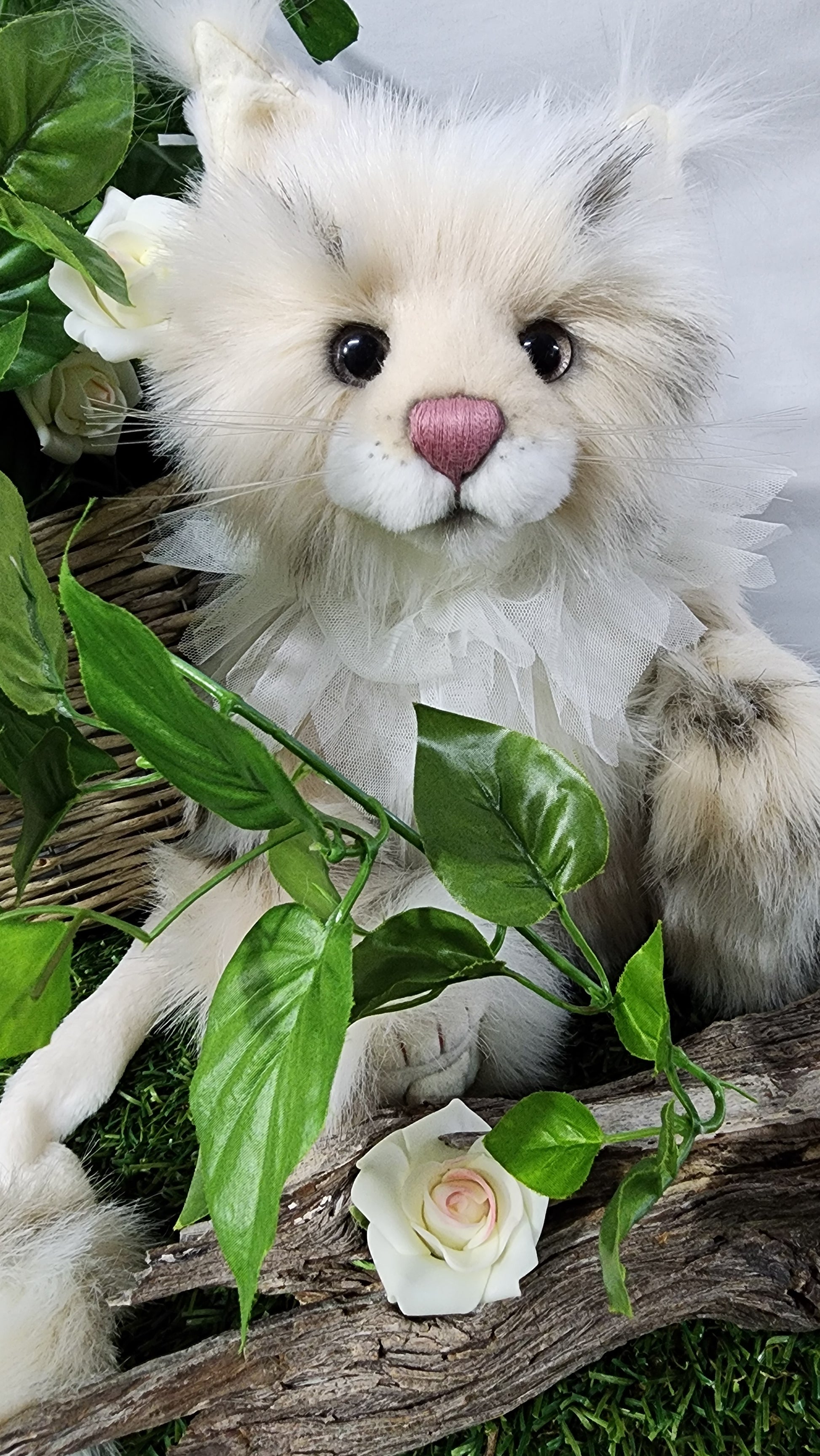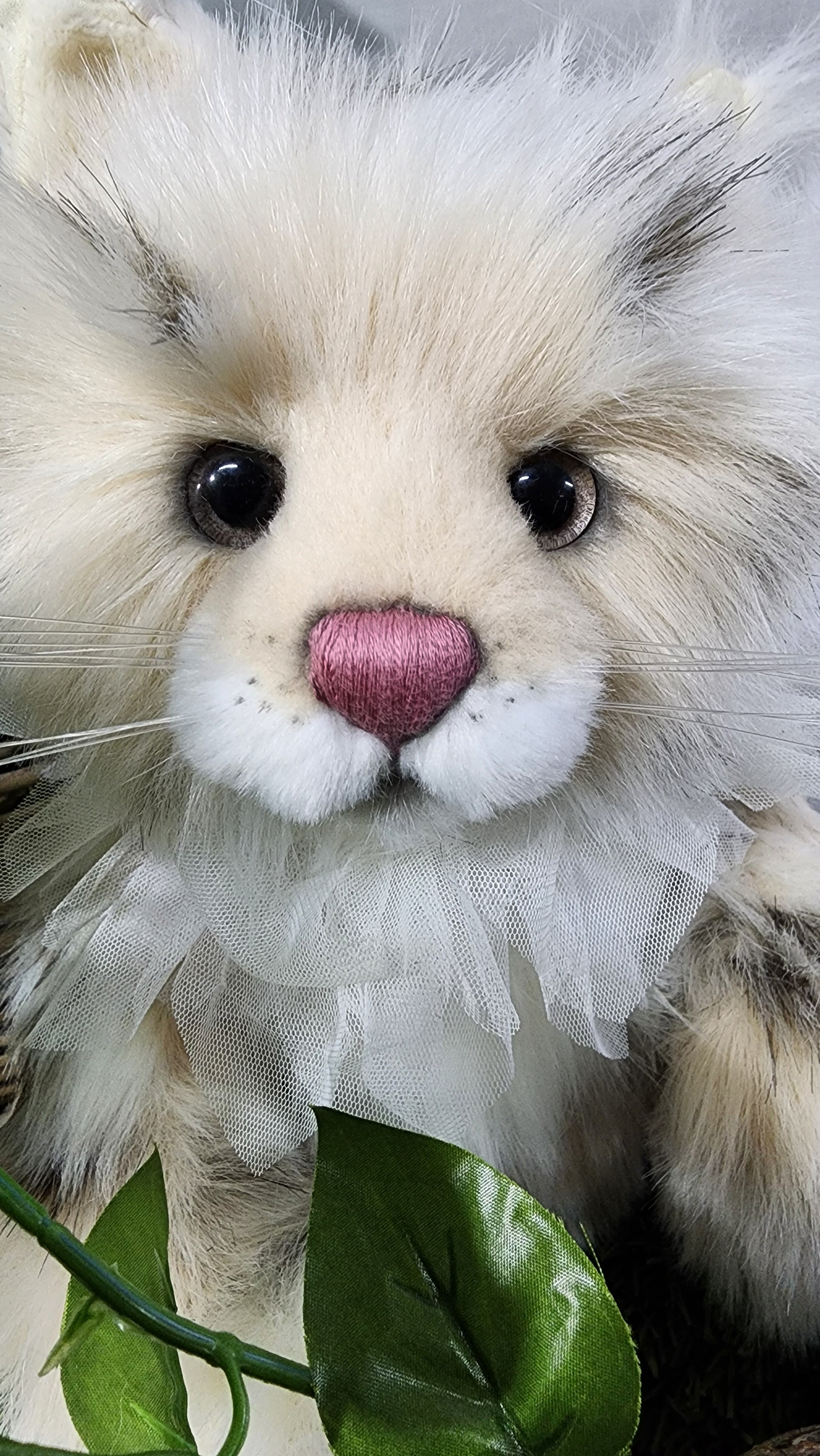 She has a hand stitched nose, mouth and toe detailing upon her superbly sculptured paws. She is wearing a beautiful lace collar around her neck which is glistening with glitter. This amazing cat also features glitter in her eyes and inner ears and has the most magnificent tail complete with a pompom on the end.