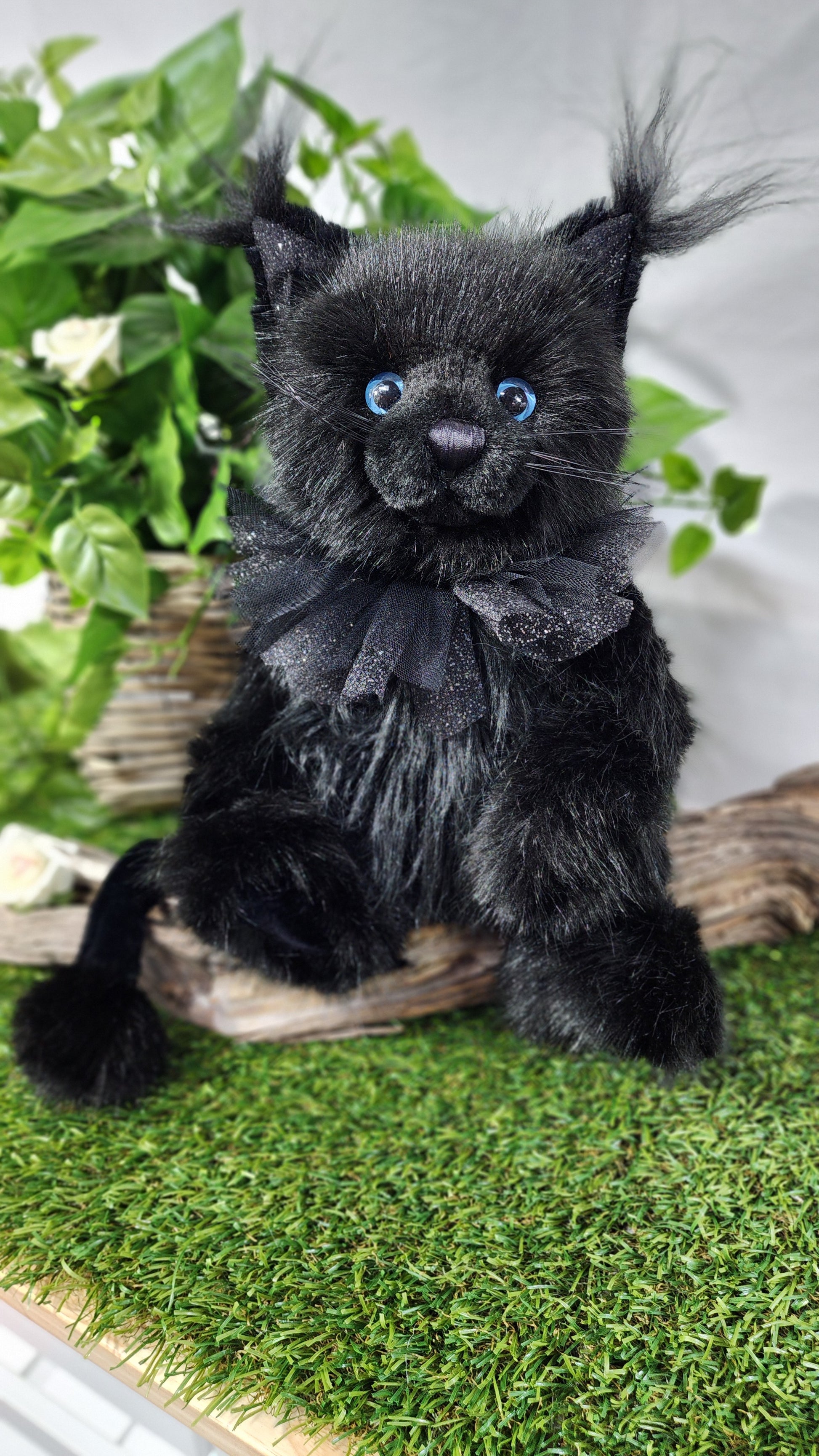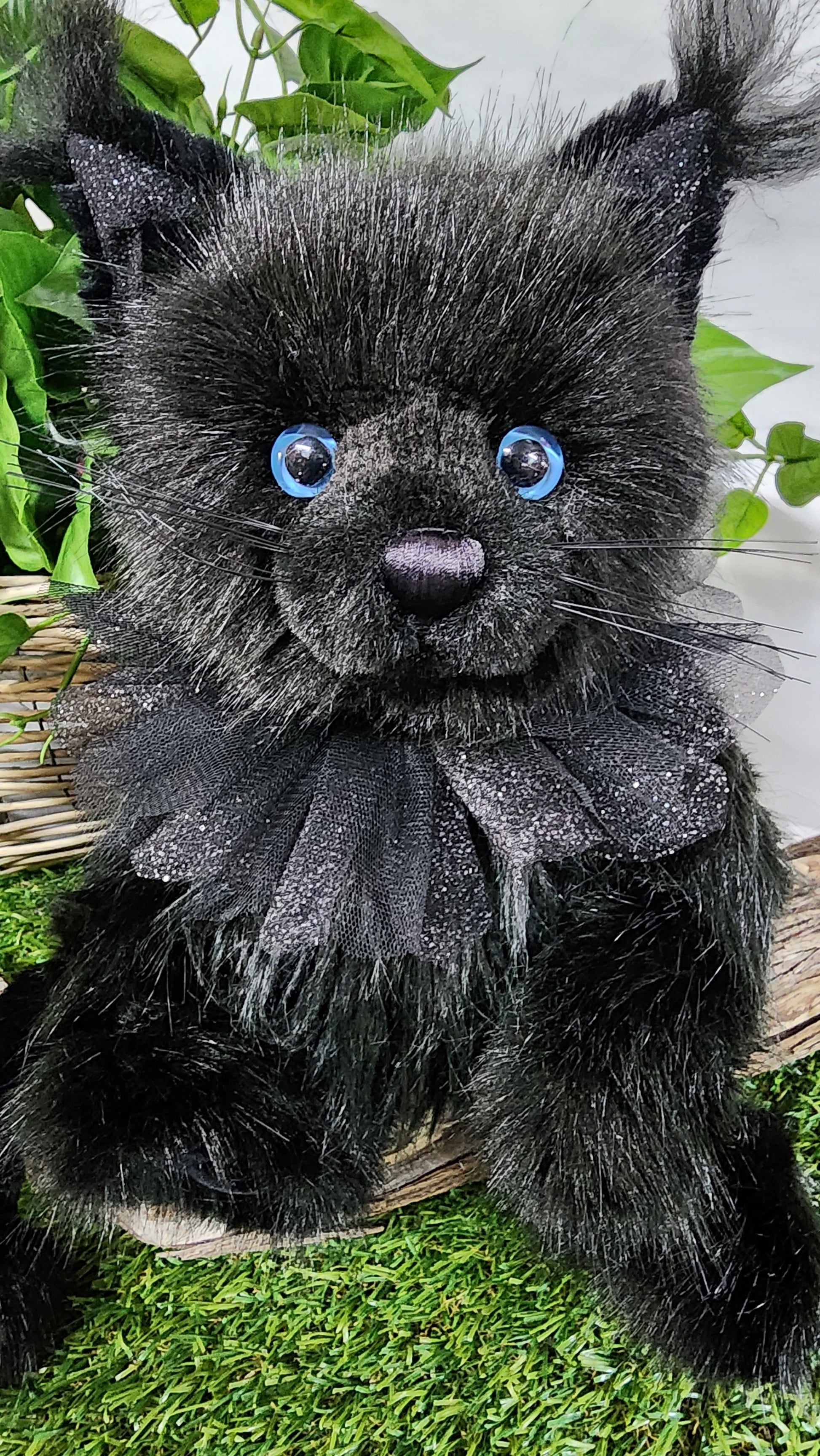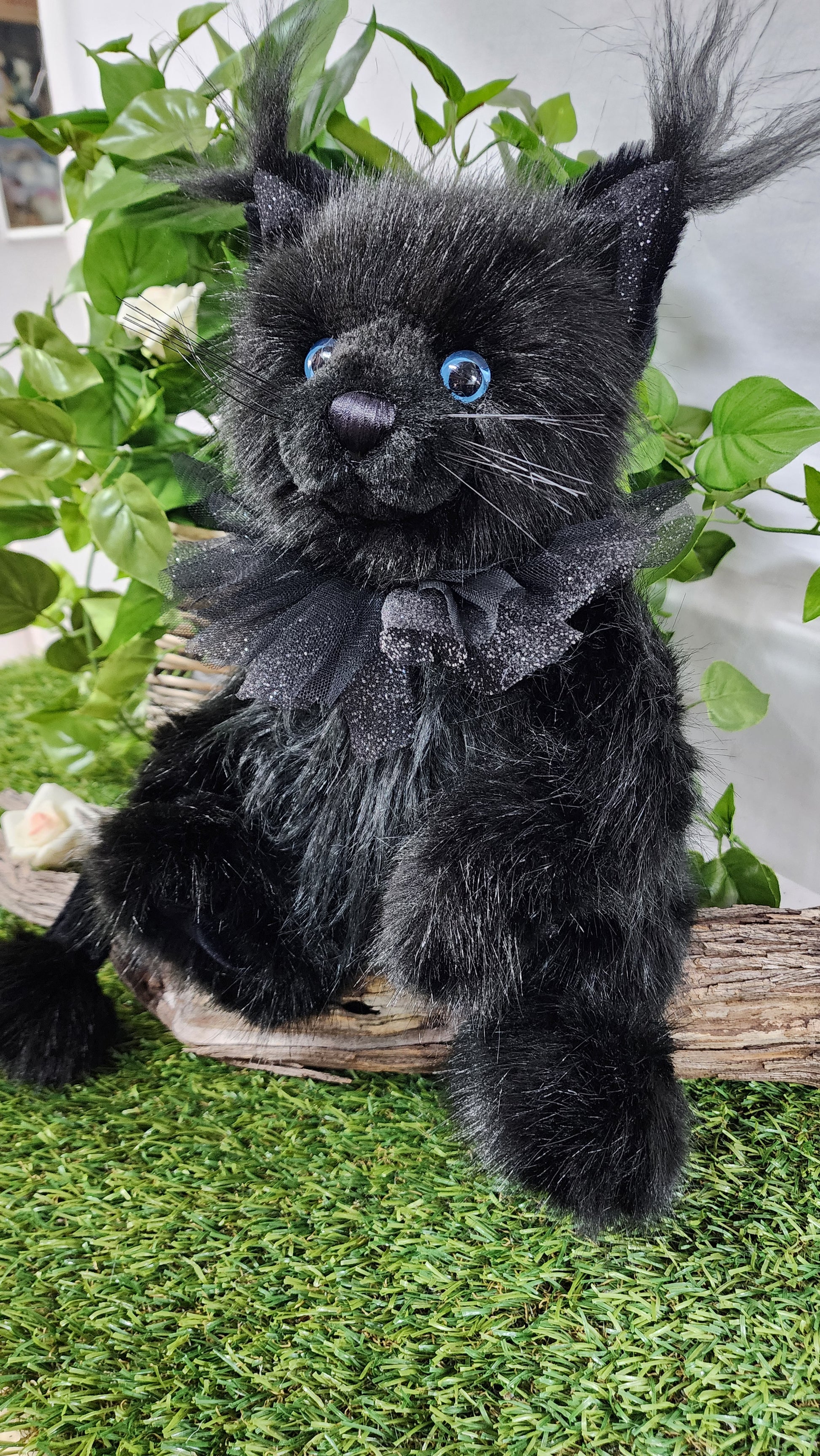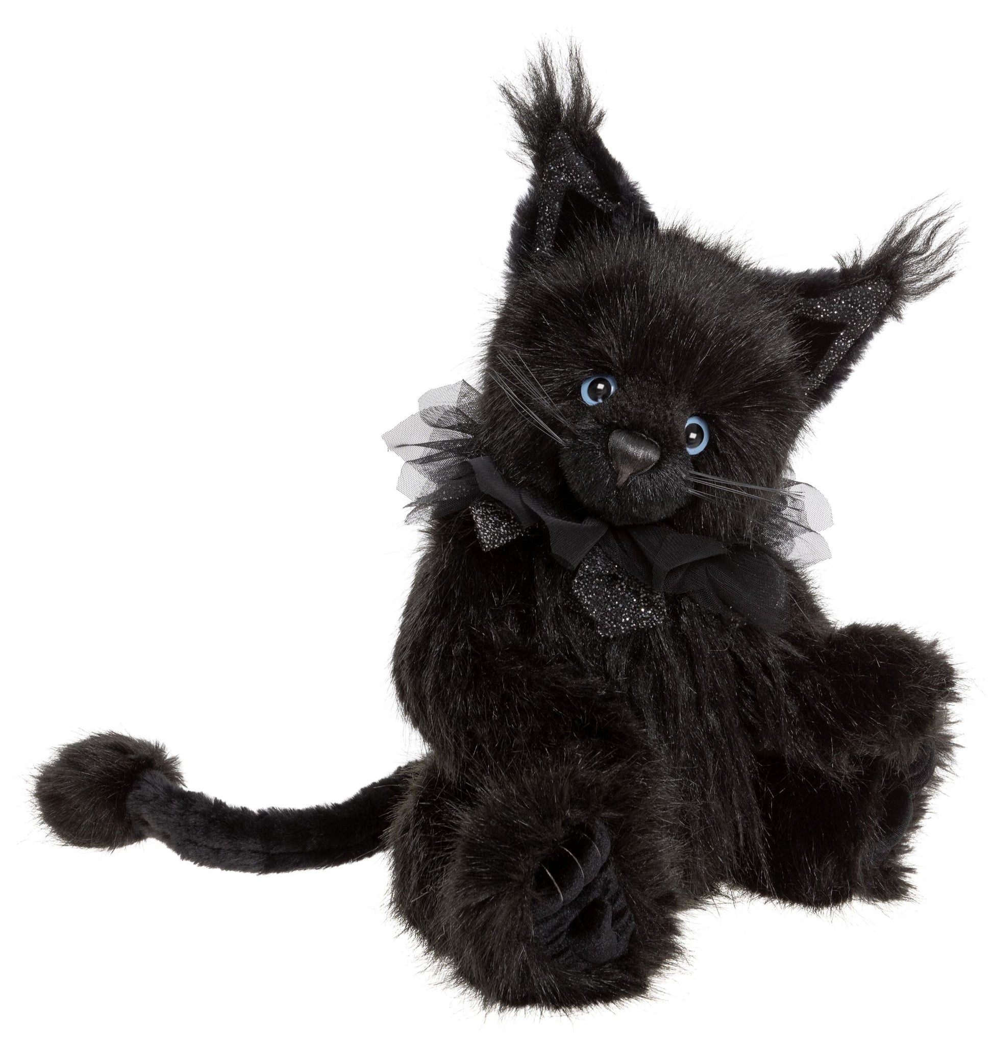It is a rare to see a fully jet black Charlie Bear and Miyaka the incredibly striking cat is sleek and chic, a reflection of Julien's fashion! With a layered neckpiece finished with glitter details in the bow and pointed ears, and bright blue eyes, Miyaka is a unique and highly sought after piece for 2025.