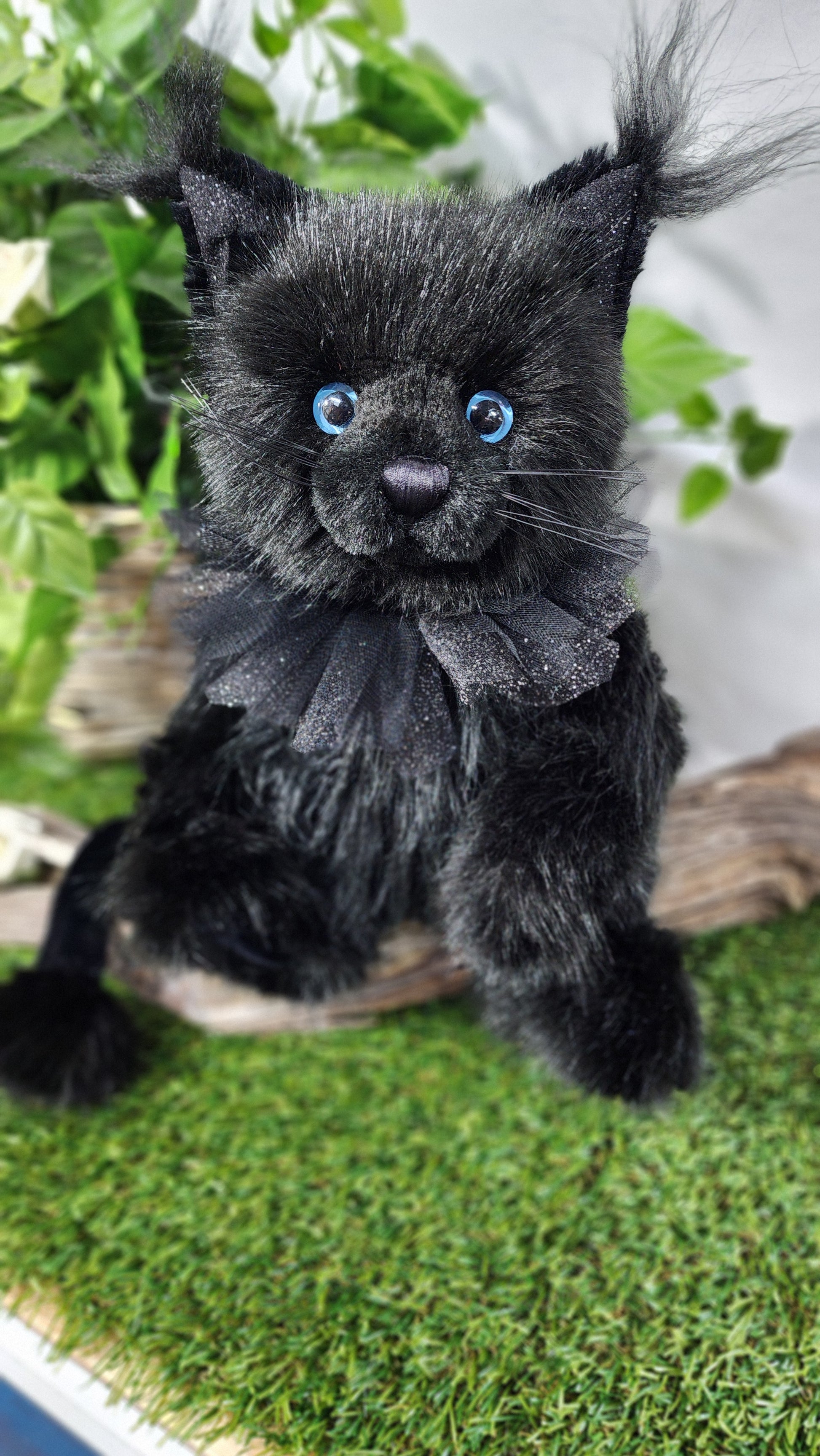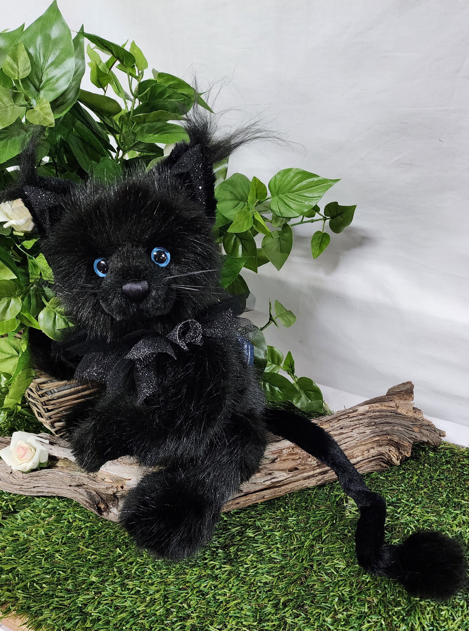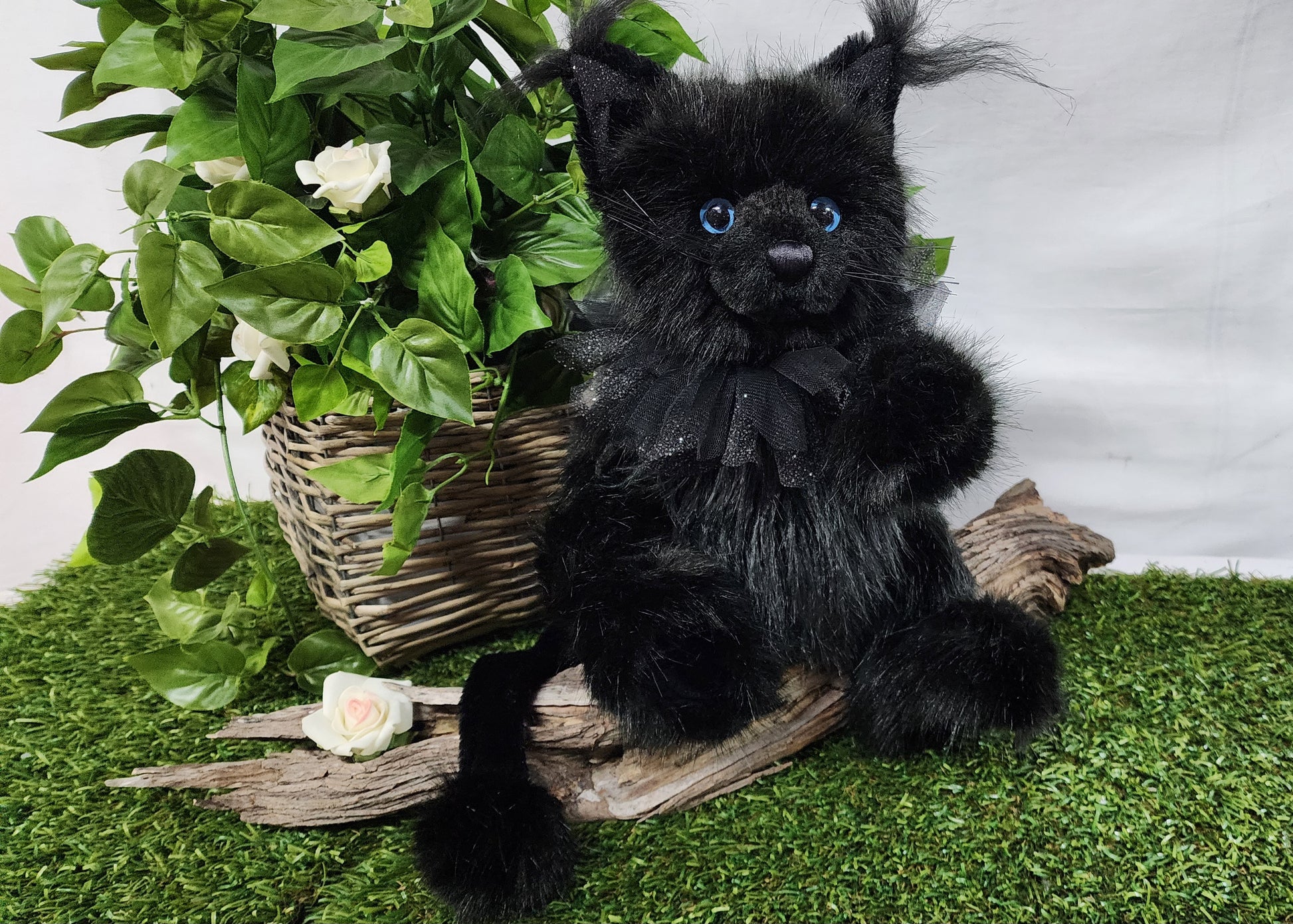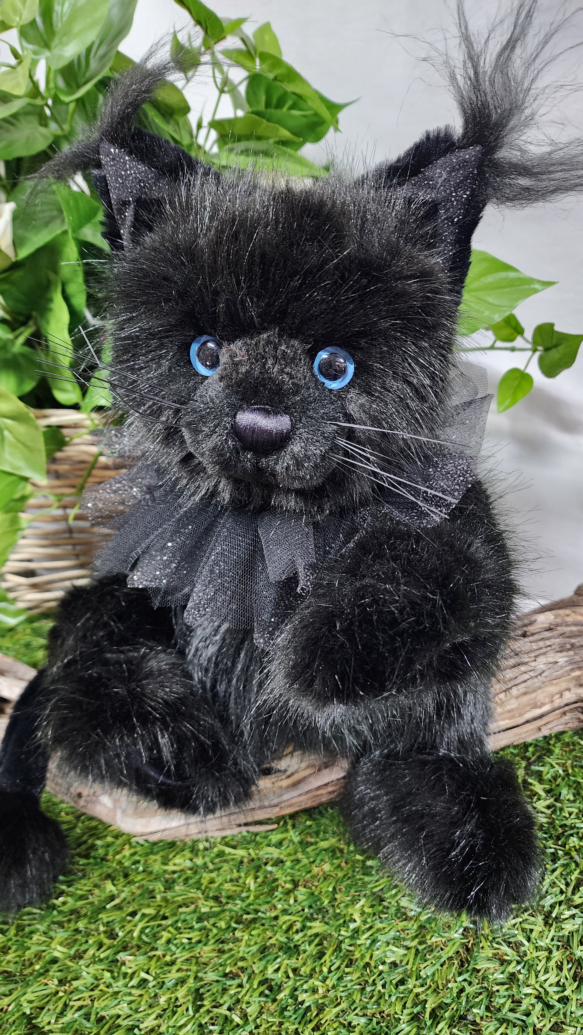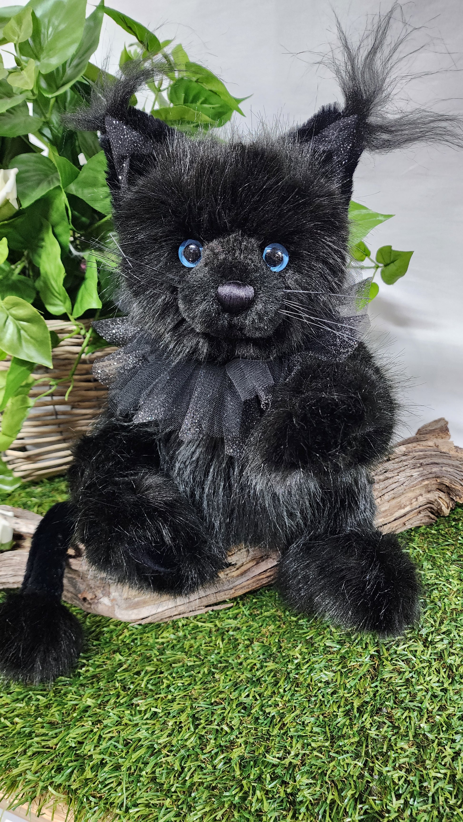 It is a rare to see a fully jet black Charlie Bear and Miyaka the incredibly striking cat is sleek and chic, a reflection of Julien's fashion! With a layered neckpiece finished with glitter details in the bow and pointed ears, and bright blue eyes, Miyaka is a unique and highly sought after piece for 2025.