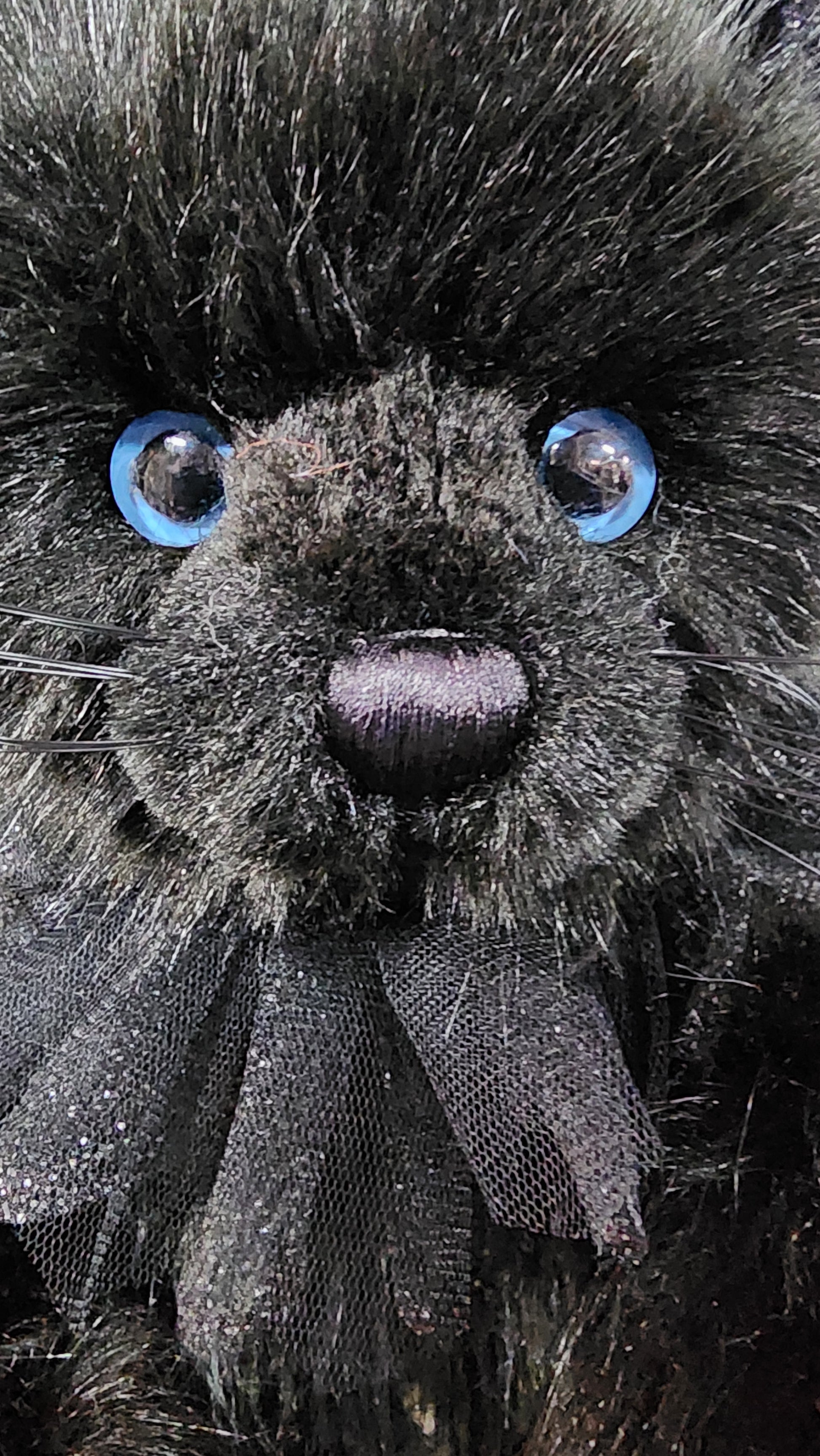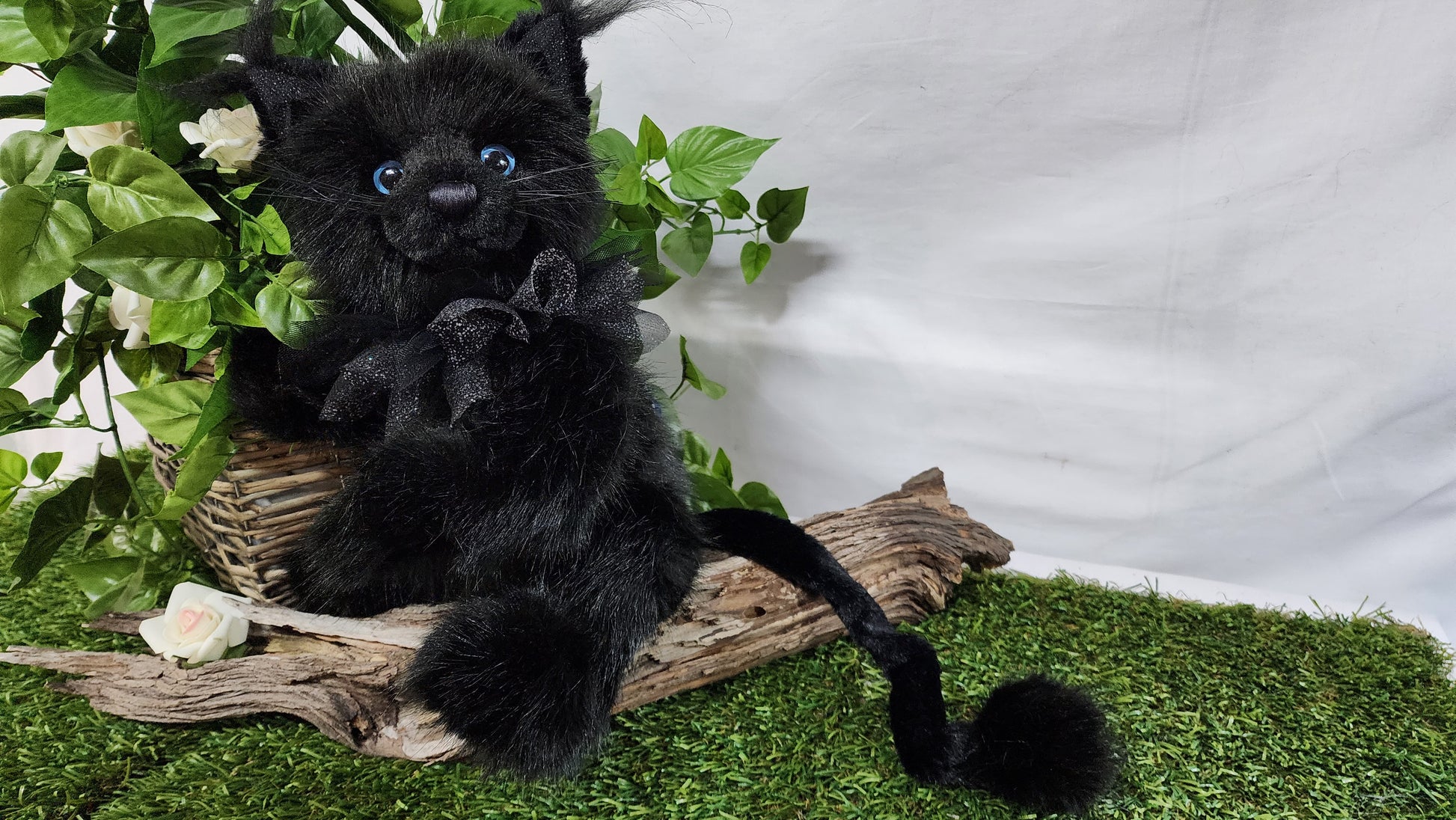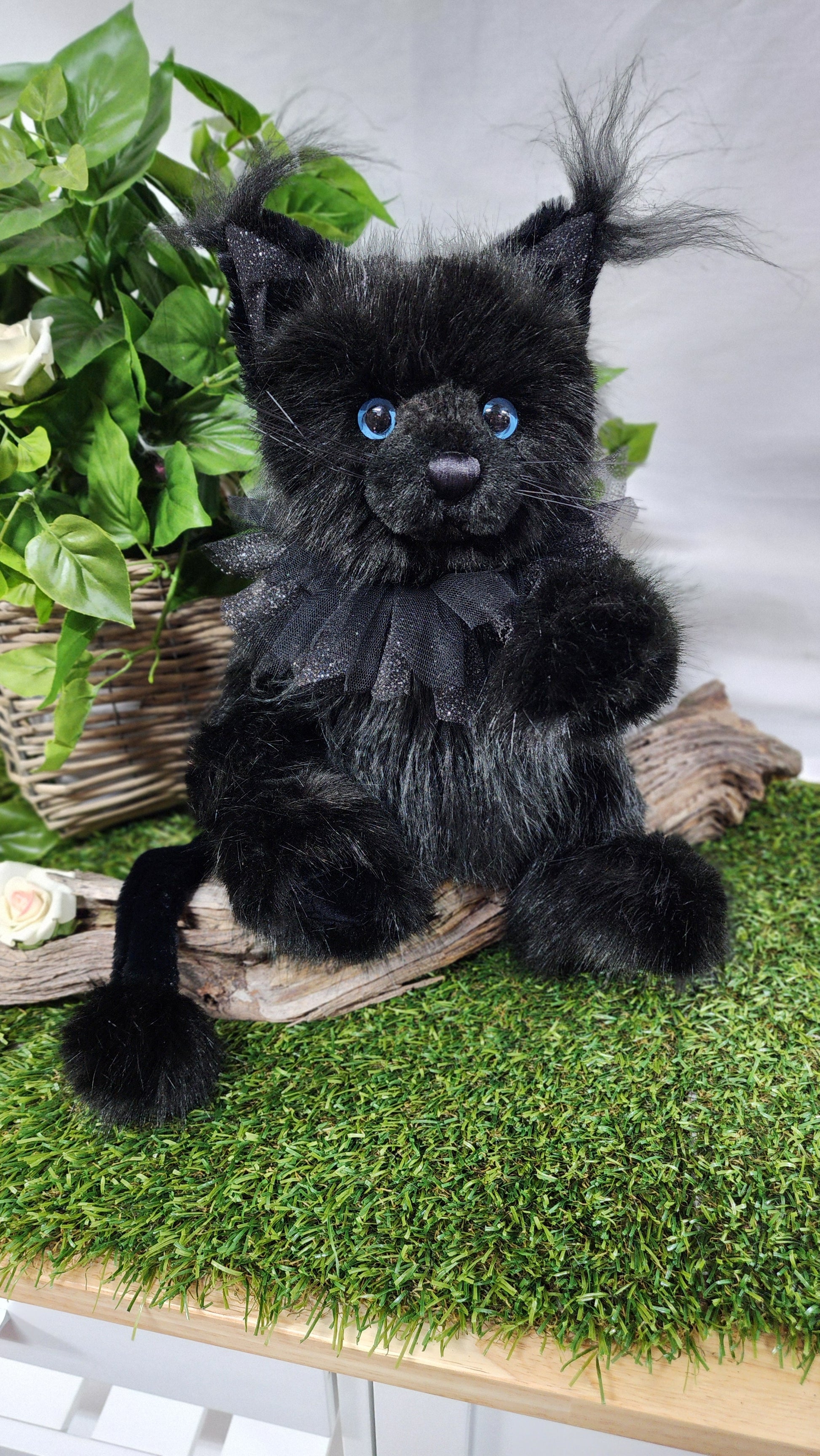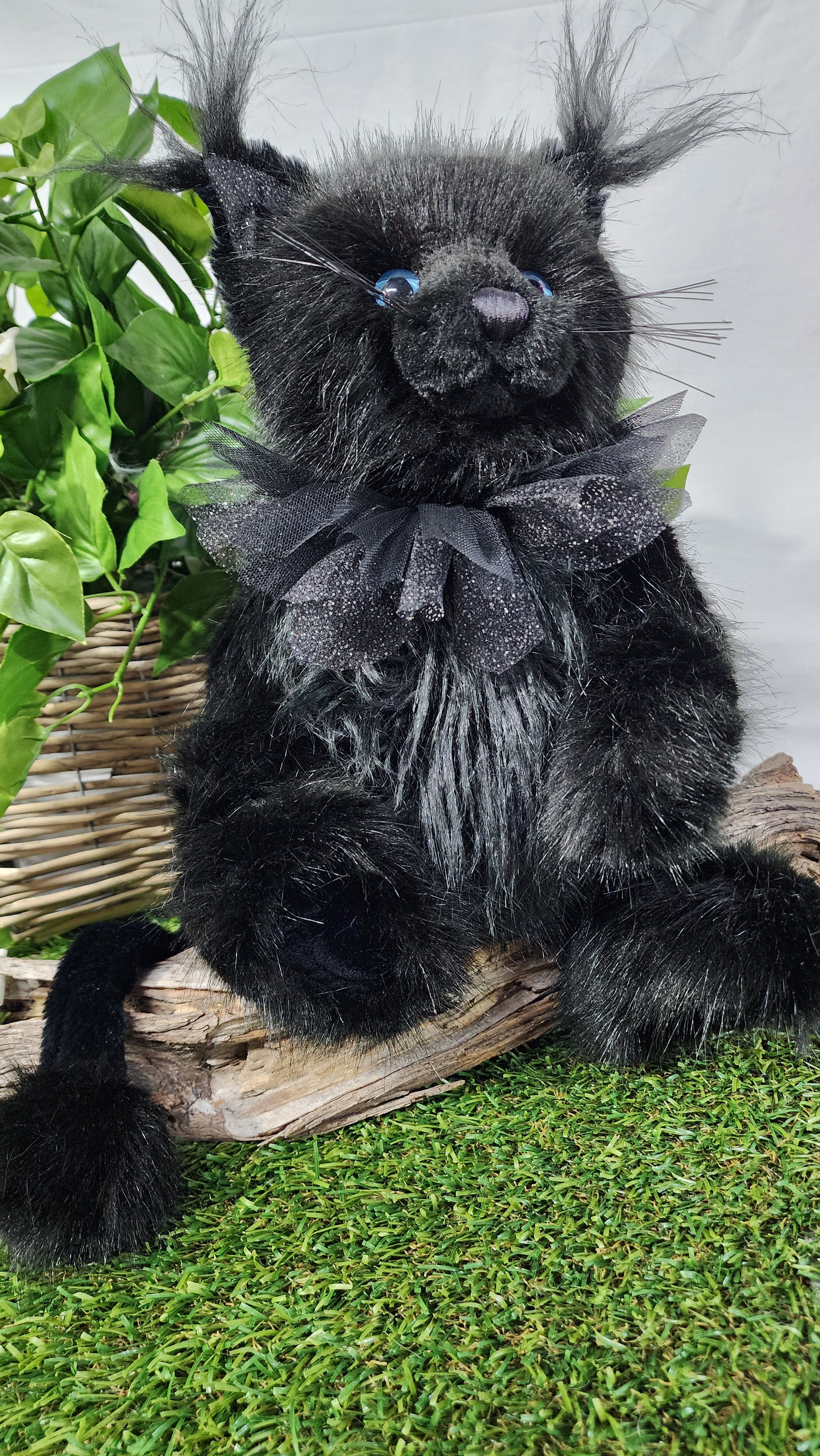 It is a rare to see a fully jet black Charlie Bear and Miyaka the incredibly striking cat is sleek and chic, a reflection of Julien's fashion! With a layered neckpiece finished with glitter details in the bow and pointed ears, and bright blue eyes, Miyaka is a unique and highly sought after piece for 2025.