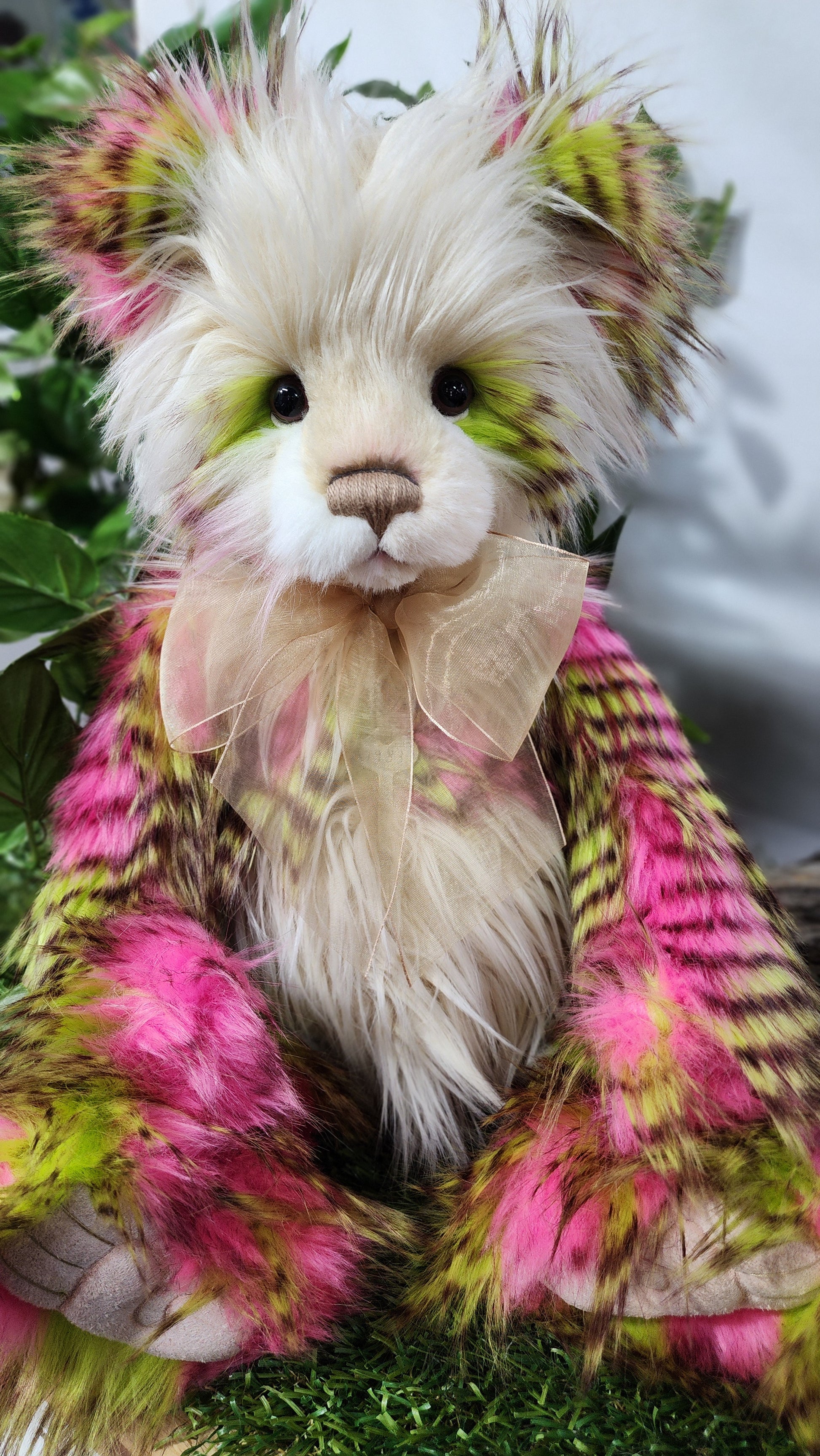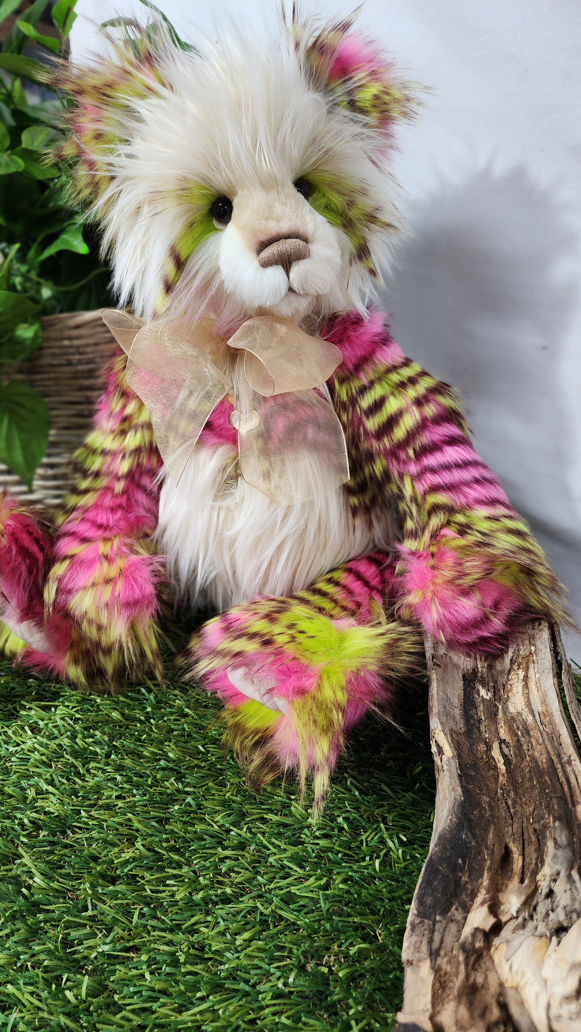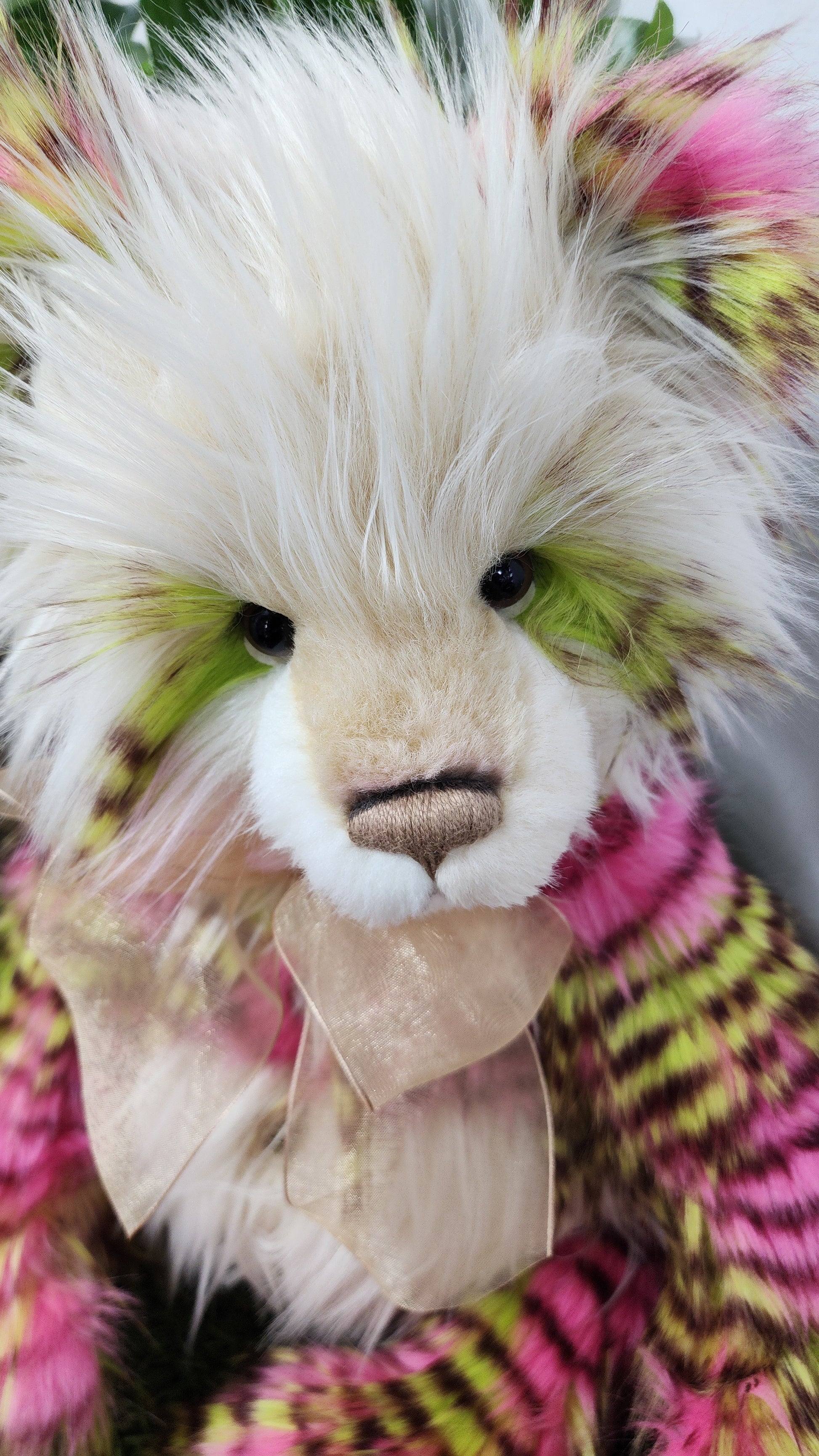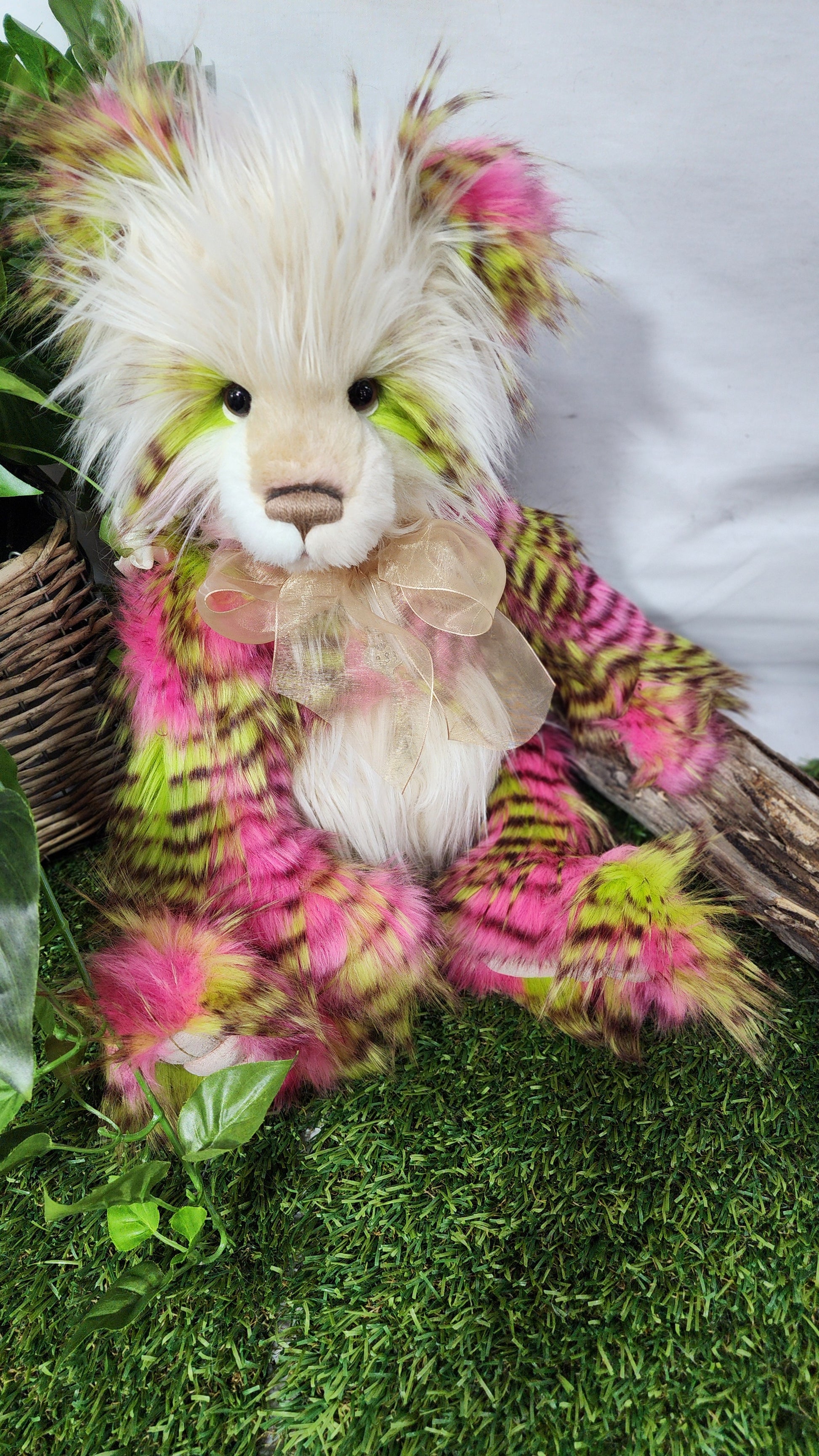 Isabelle Lee's panda bear design incorporates long, plush fur and ticklish toes, utilising a vibrant colour palette of hot pink and neon lime, subtly softened by a chiffon bow.