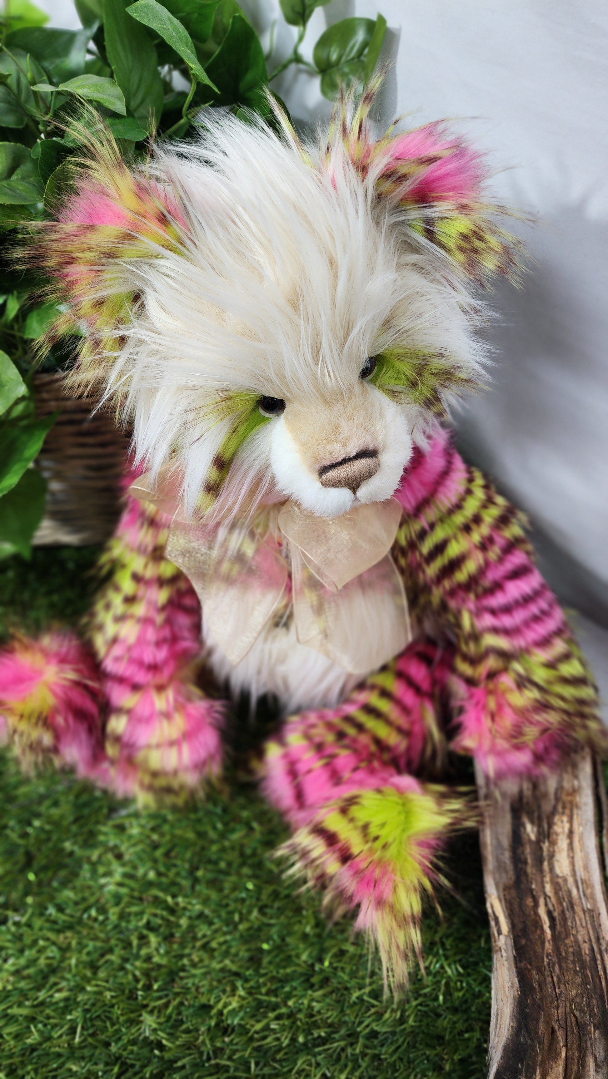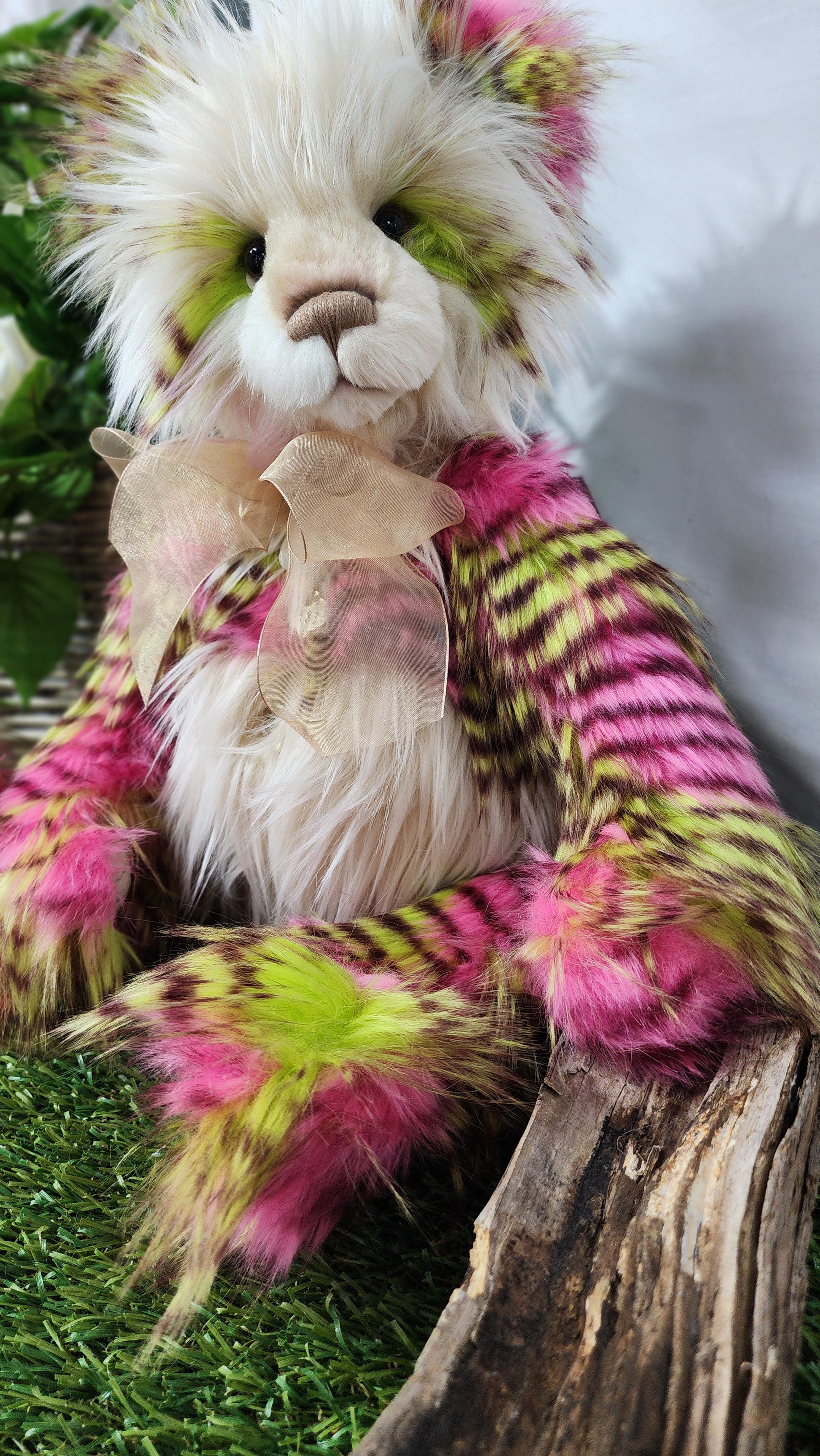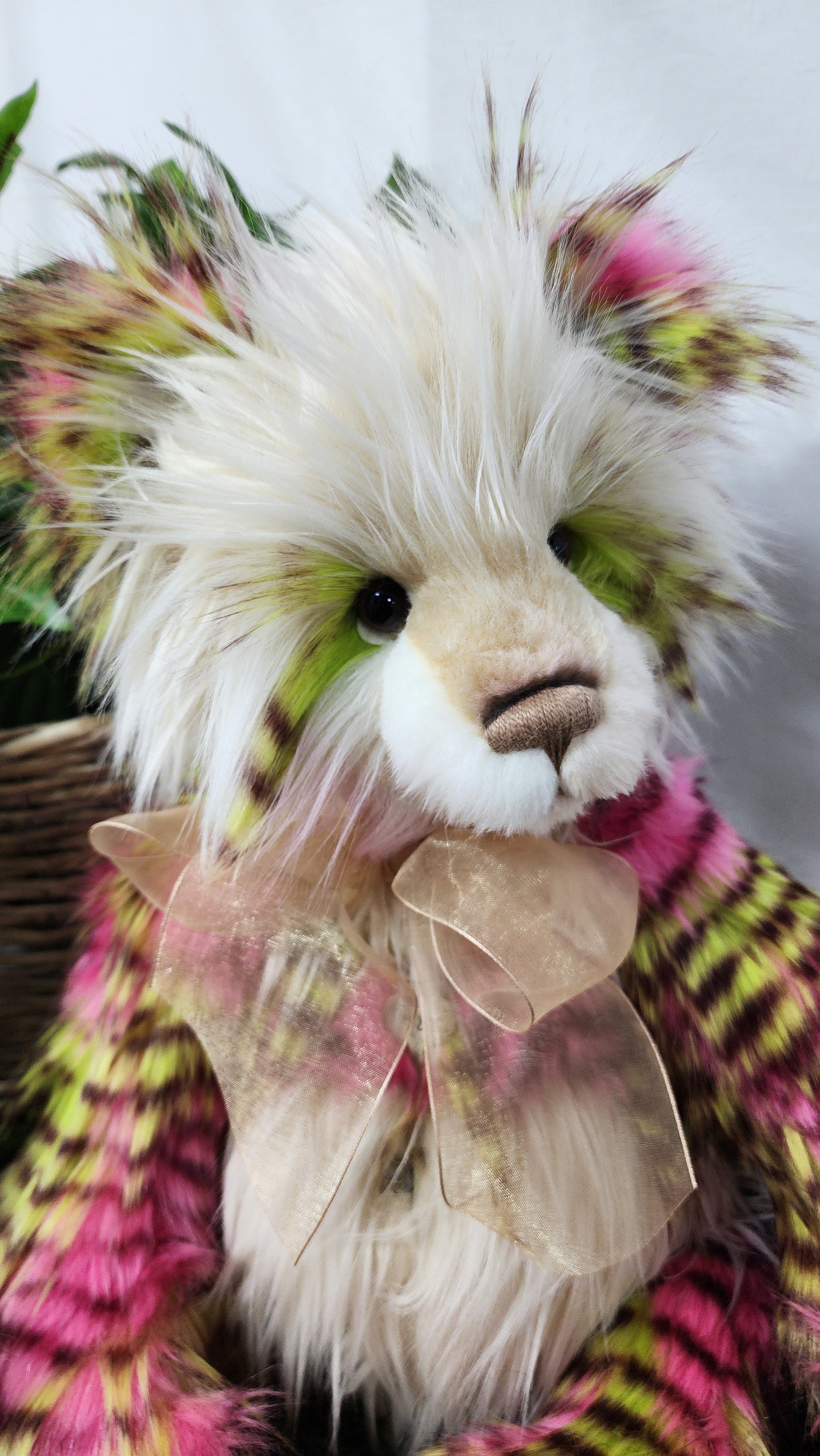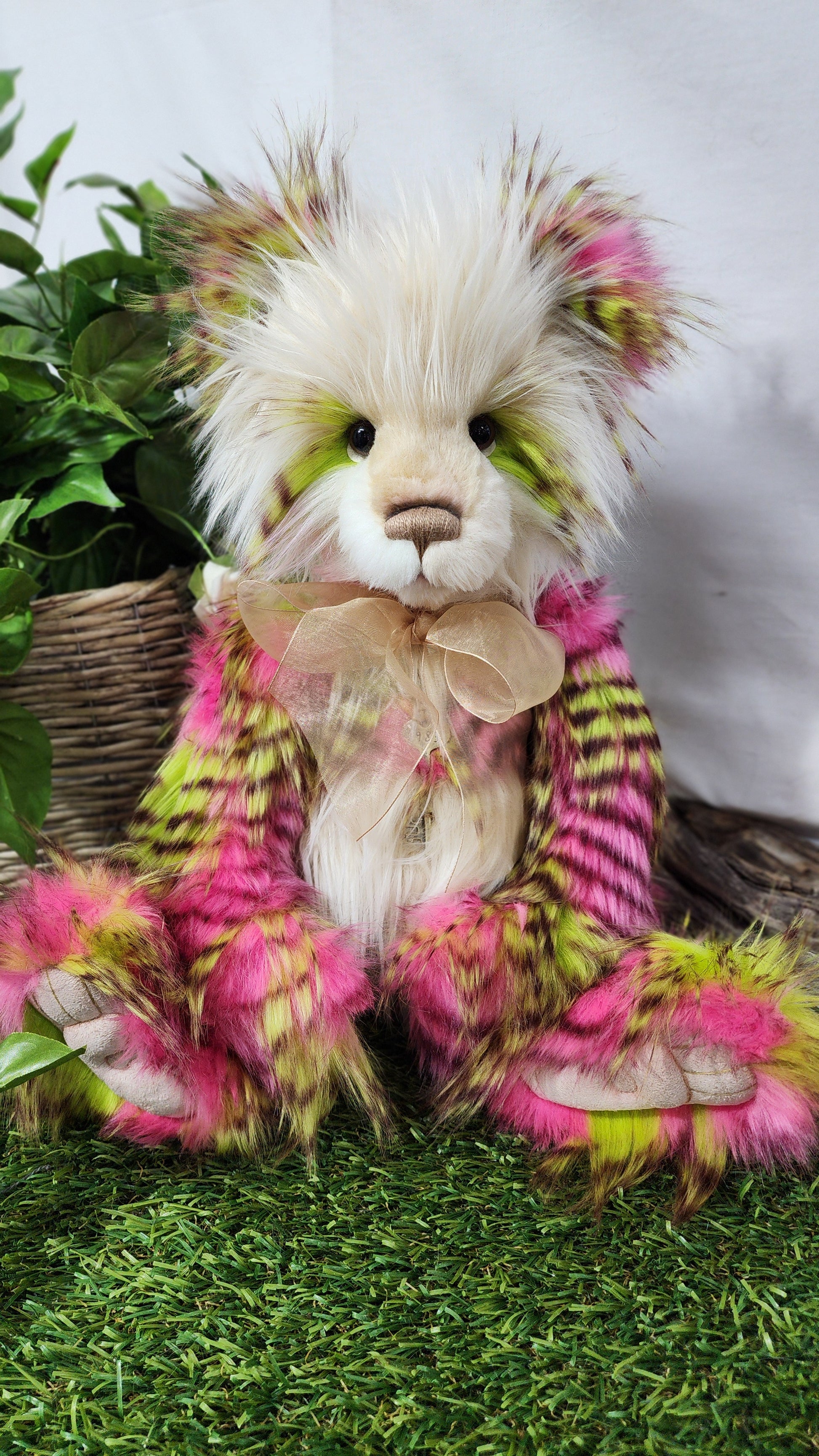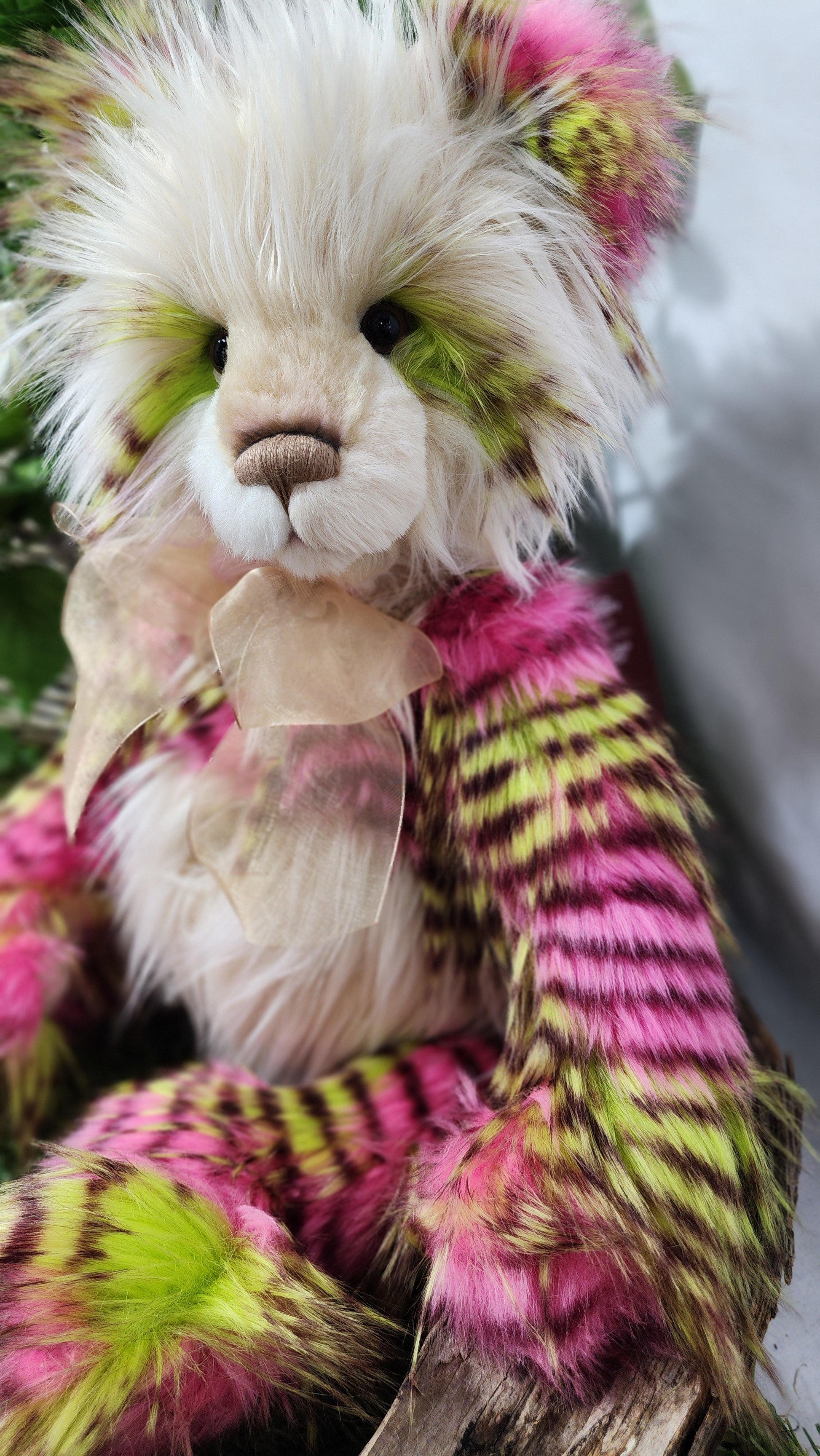 Isabelle Lee's panda bear design incorporates long, plush fur and ticklish toes, utilising a vibrant colour palette of hot pink and neon lime, subtly softened by a chiffon bow.