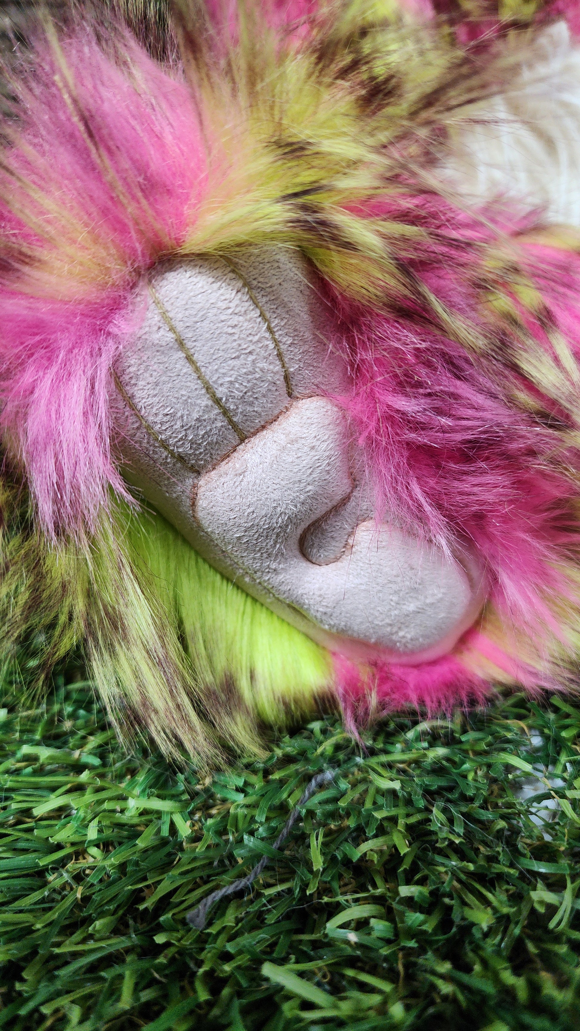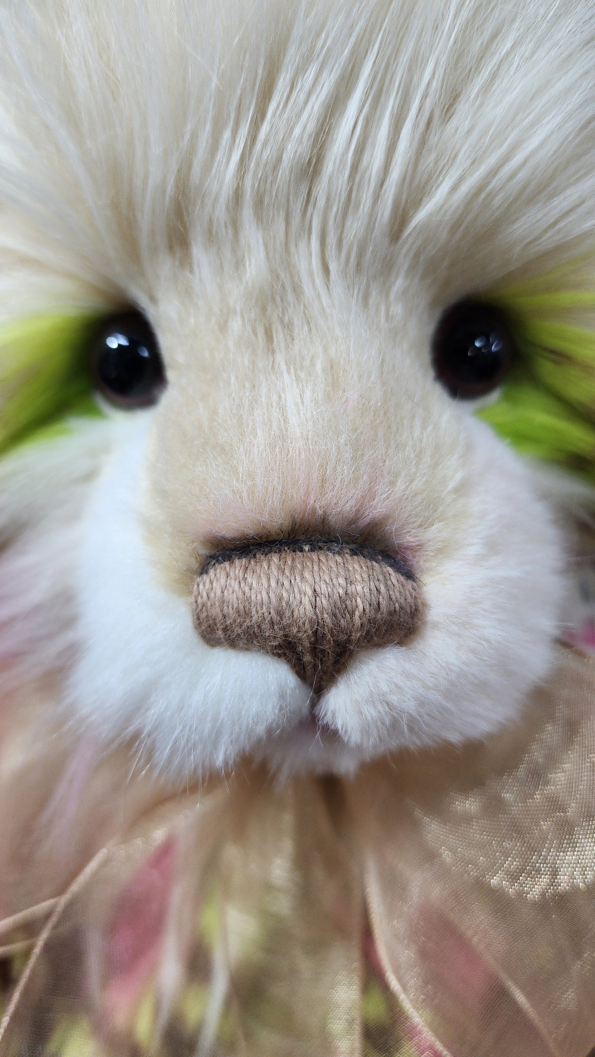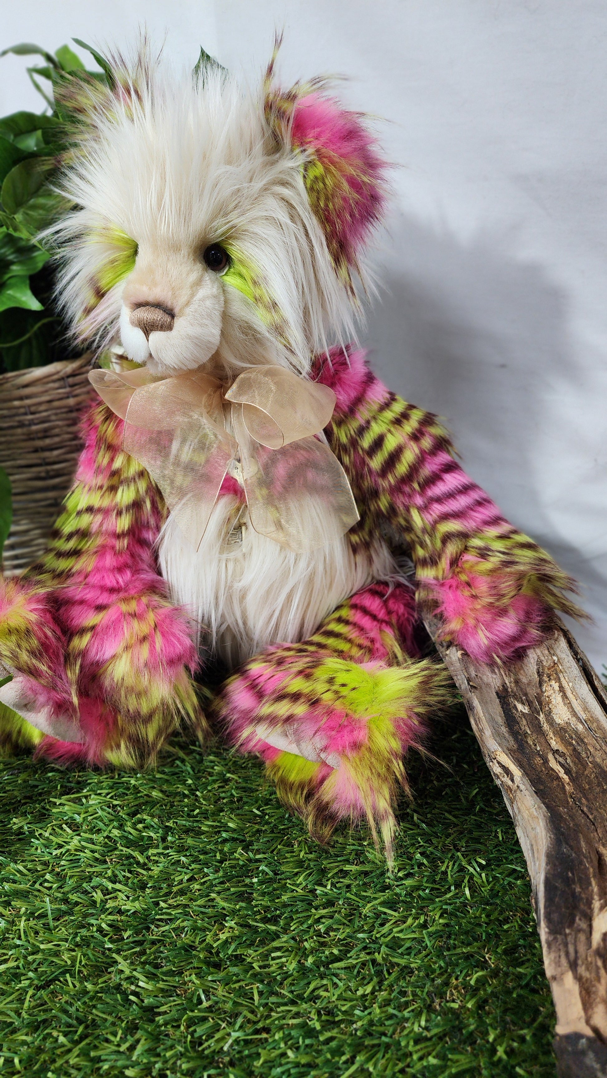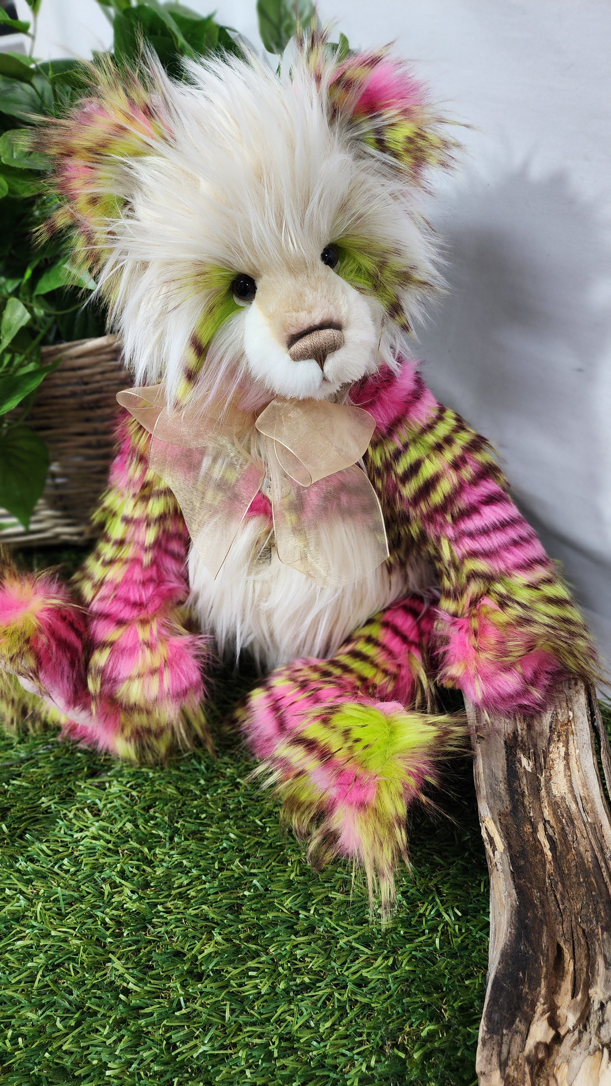 Isabelle Lee's panda bear design incorporates long, plush fur and ticklish toes, utilising a vibrant colour palette of hot pink and neon lime, subtly softened by a chiffon bow.