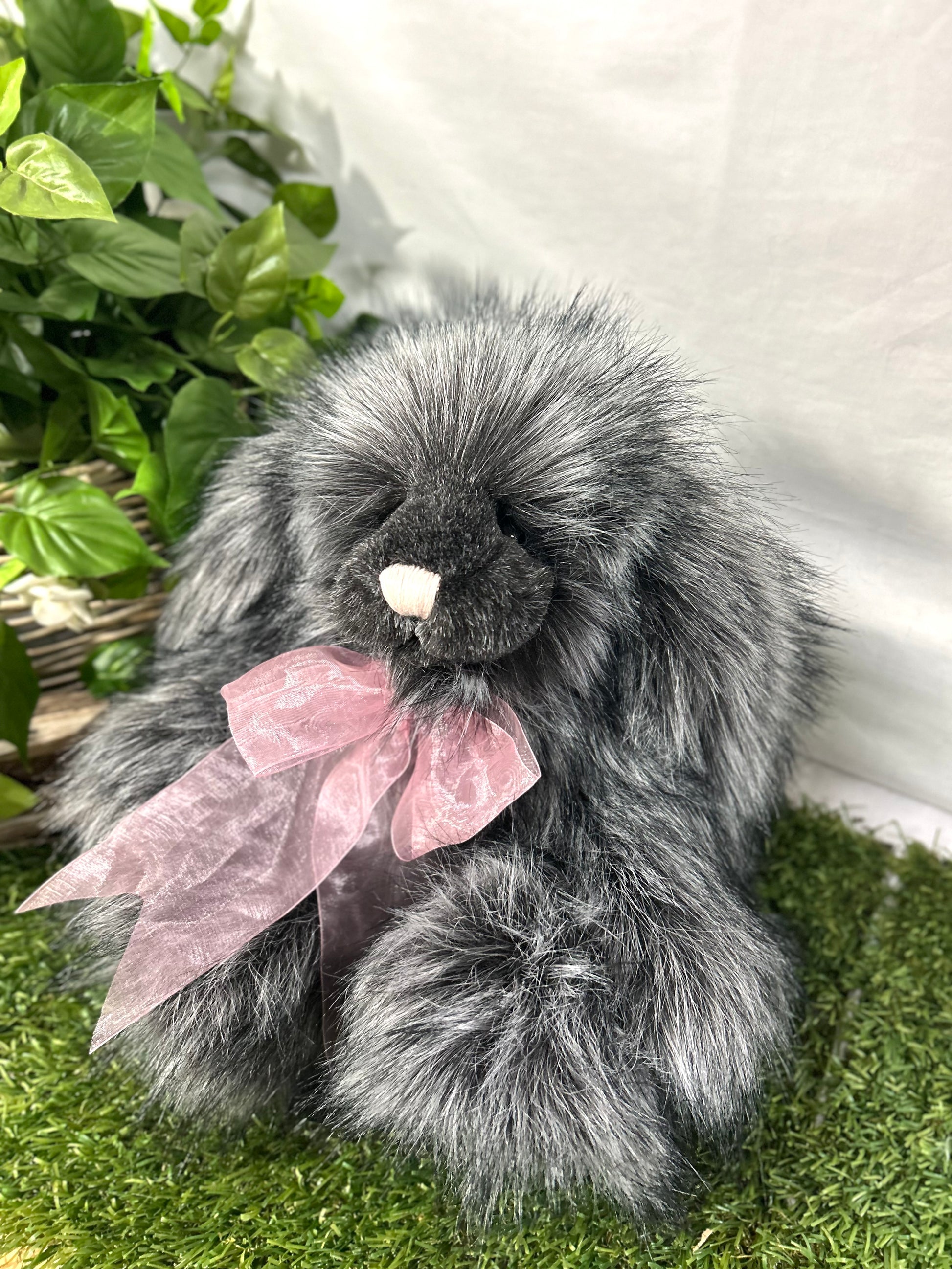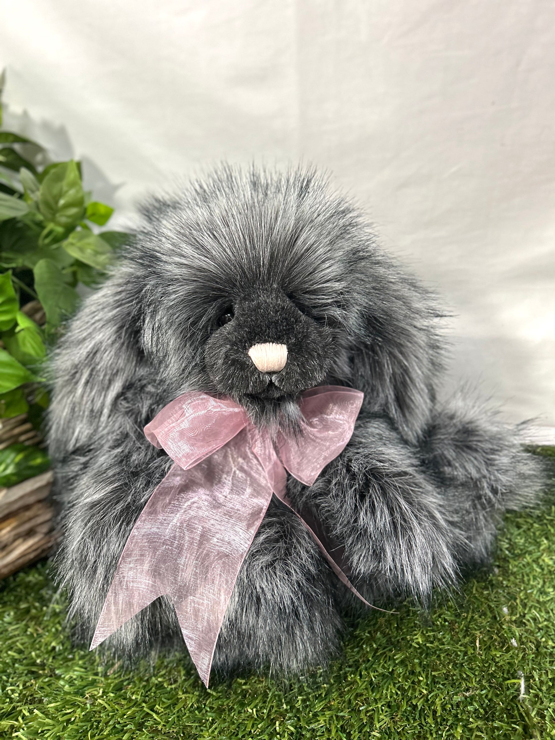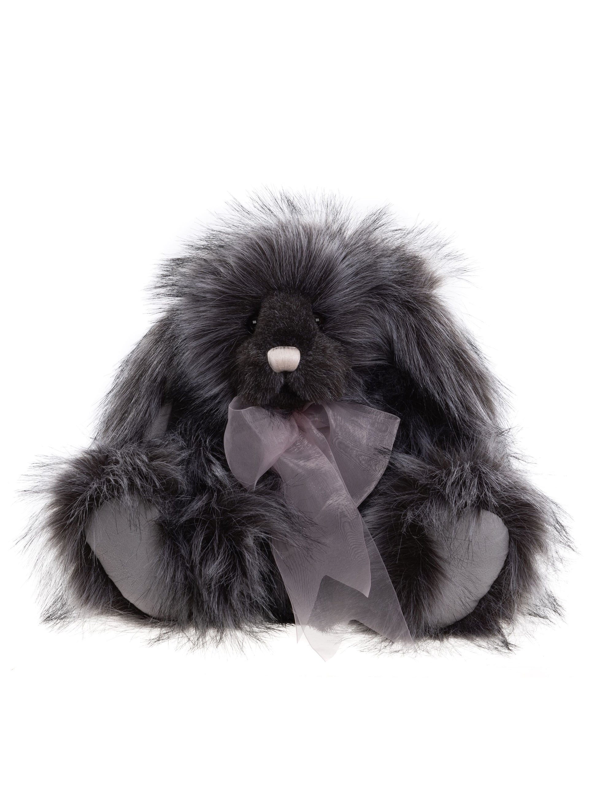 Charlie Bears traditional rabbit design with long floppy ears, long fur in smoke grey tones,