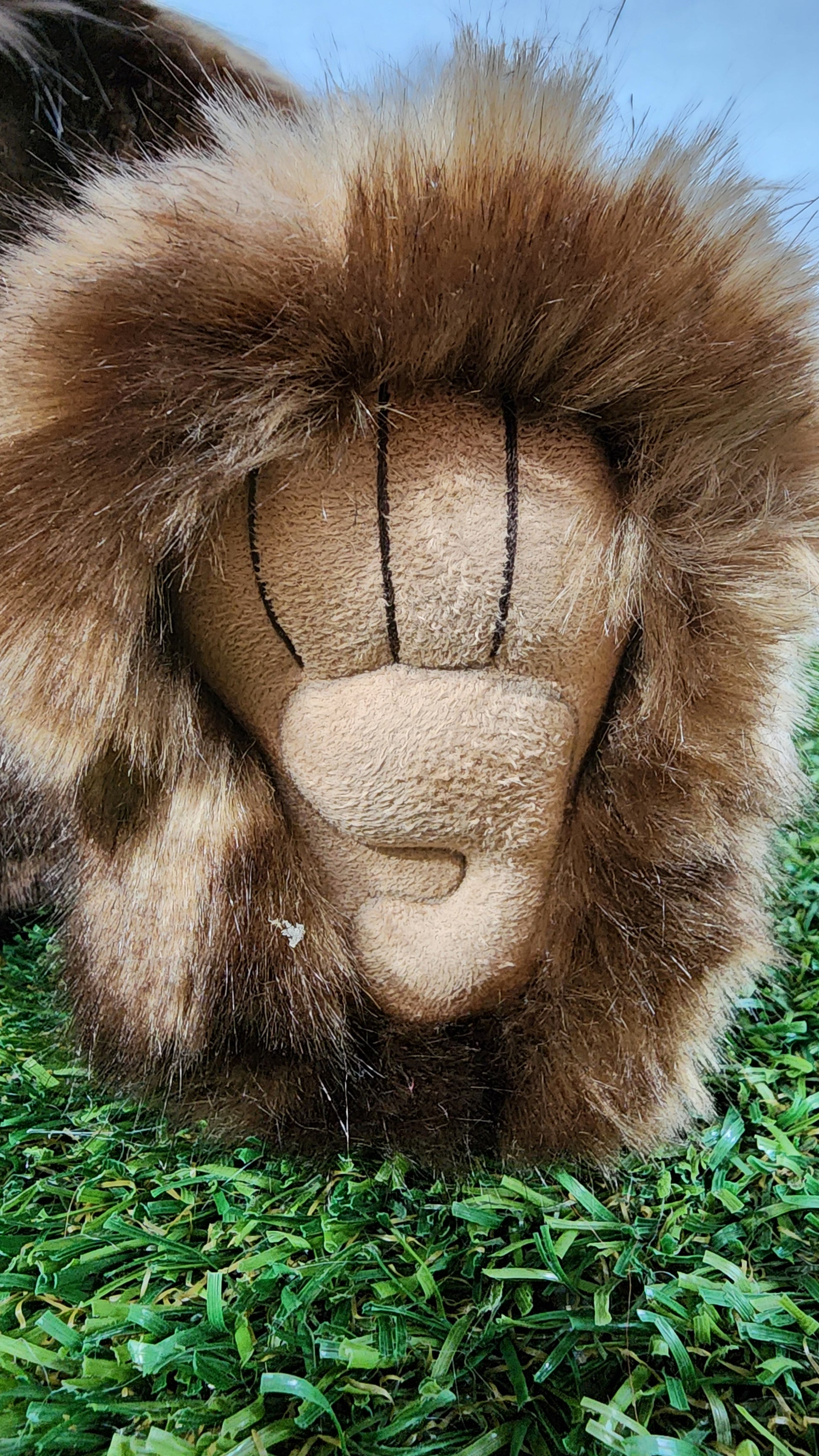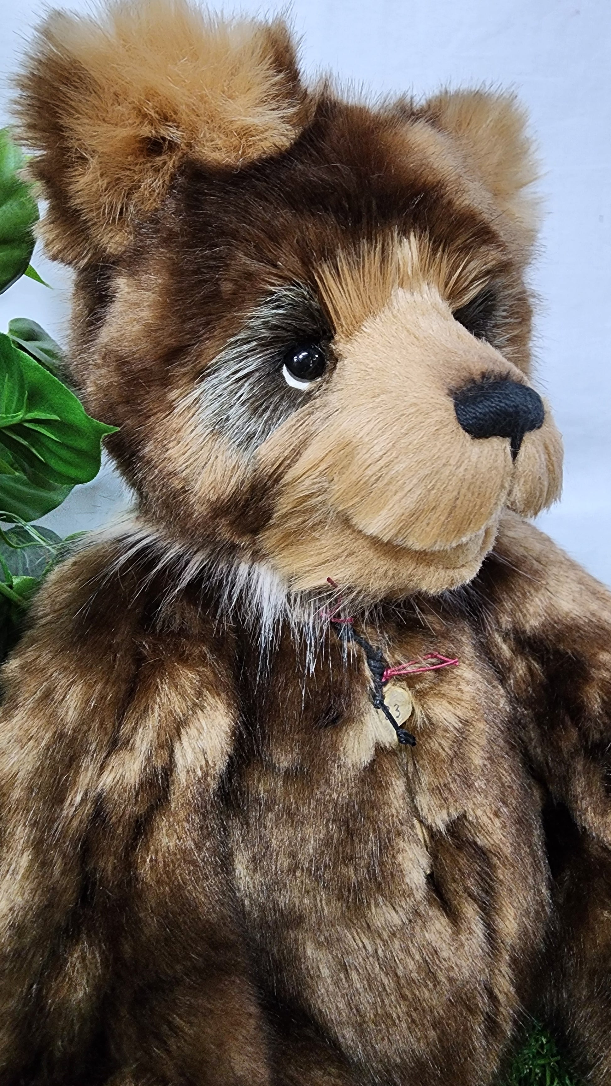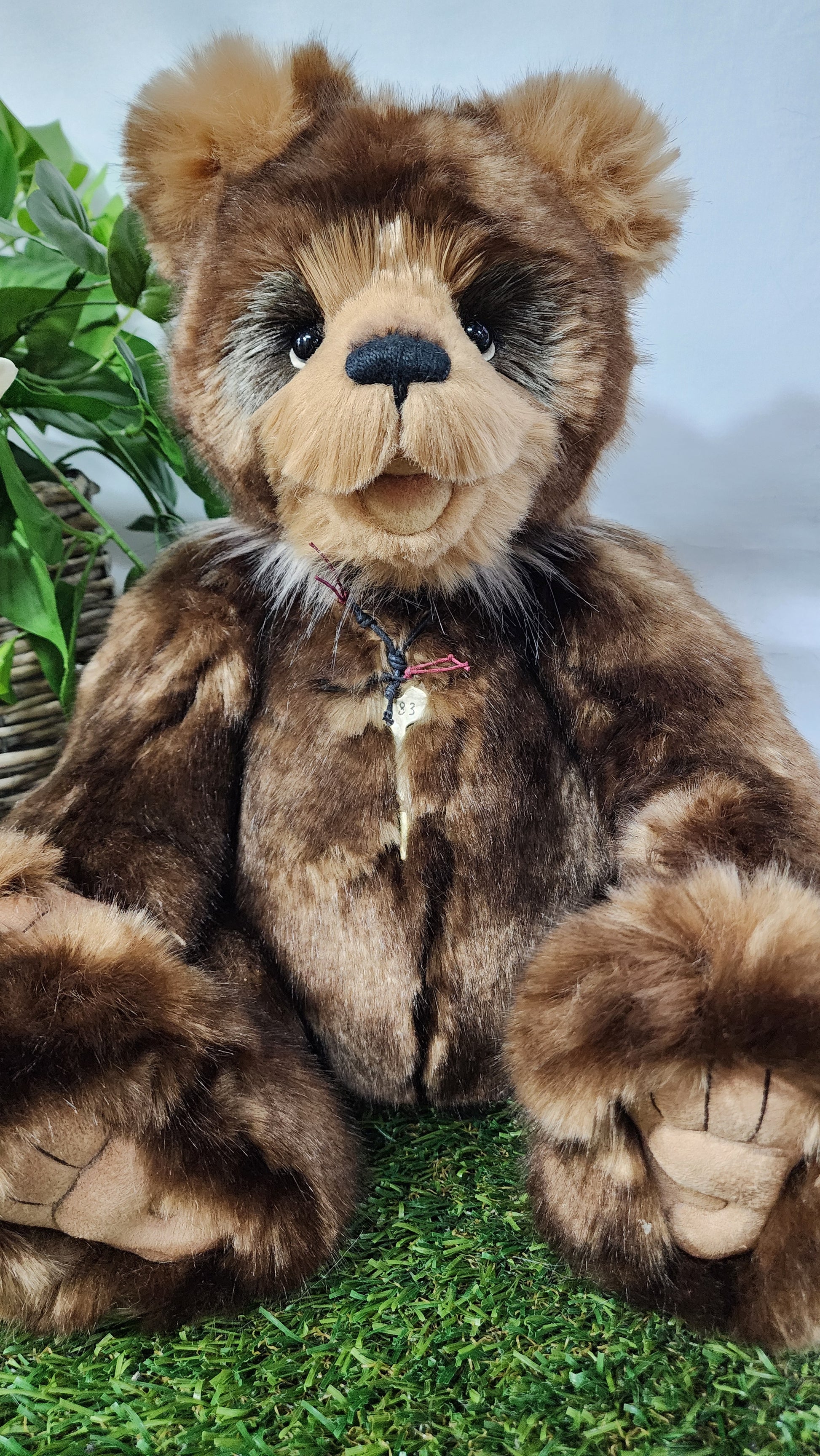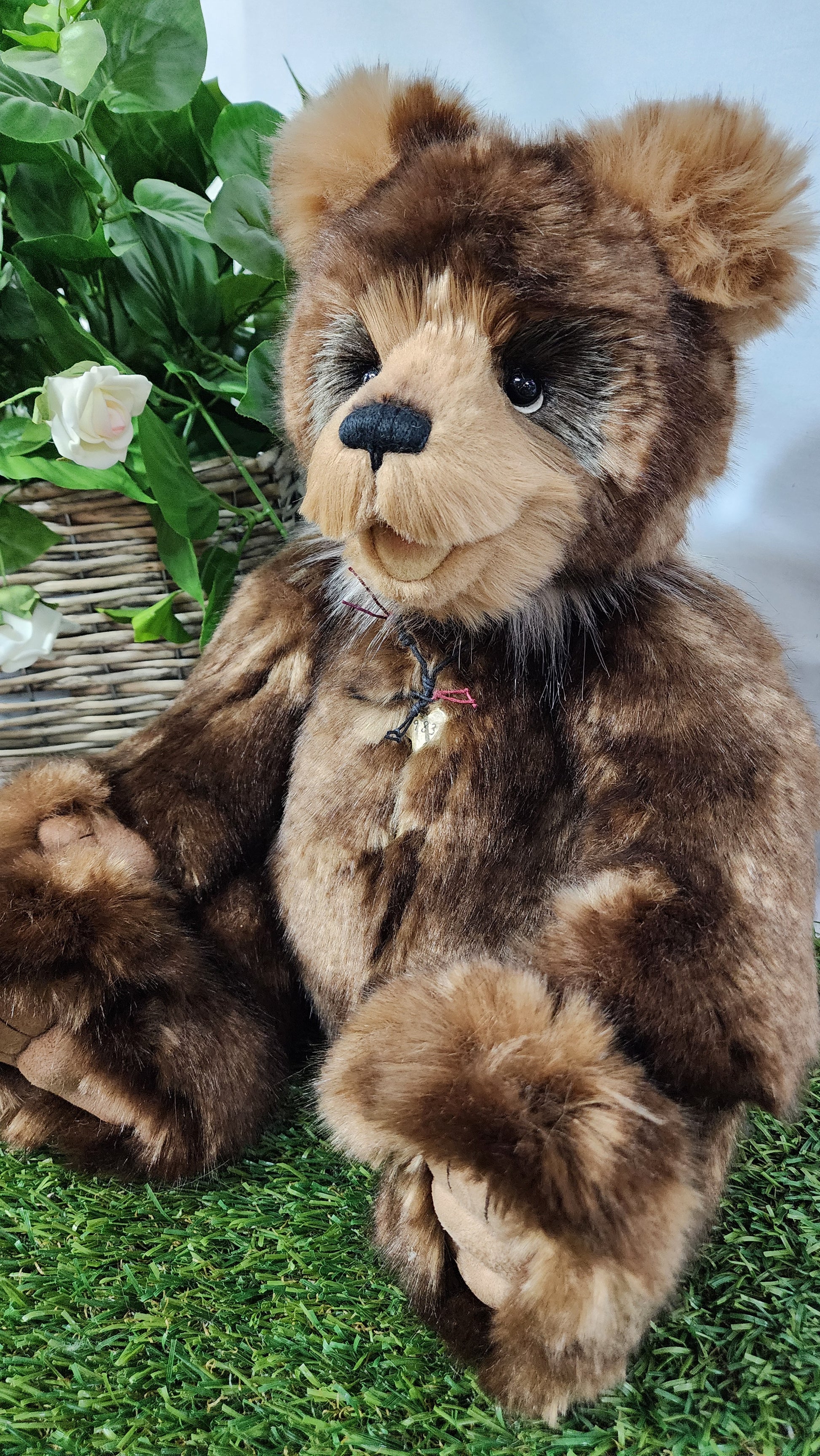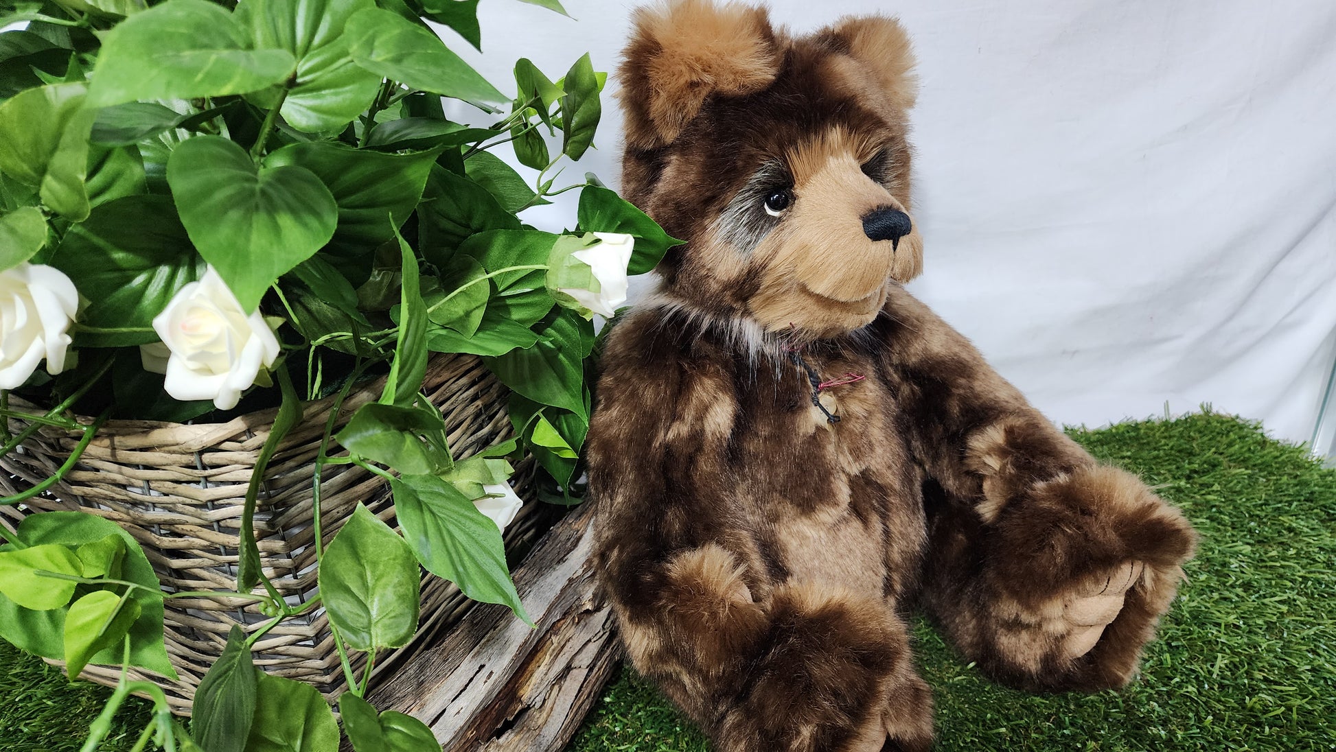 Isabelle Lee has designed a playful bear with an open mouth, creating a cheerful expression. The bear features thick, luxurious fur and sculpted toes, with a brown and cream palette; long wispy cream fur serves as a collar.