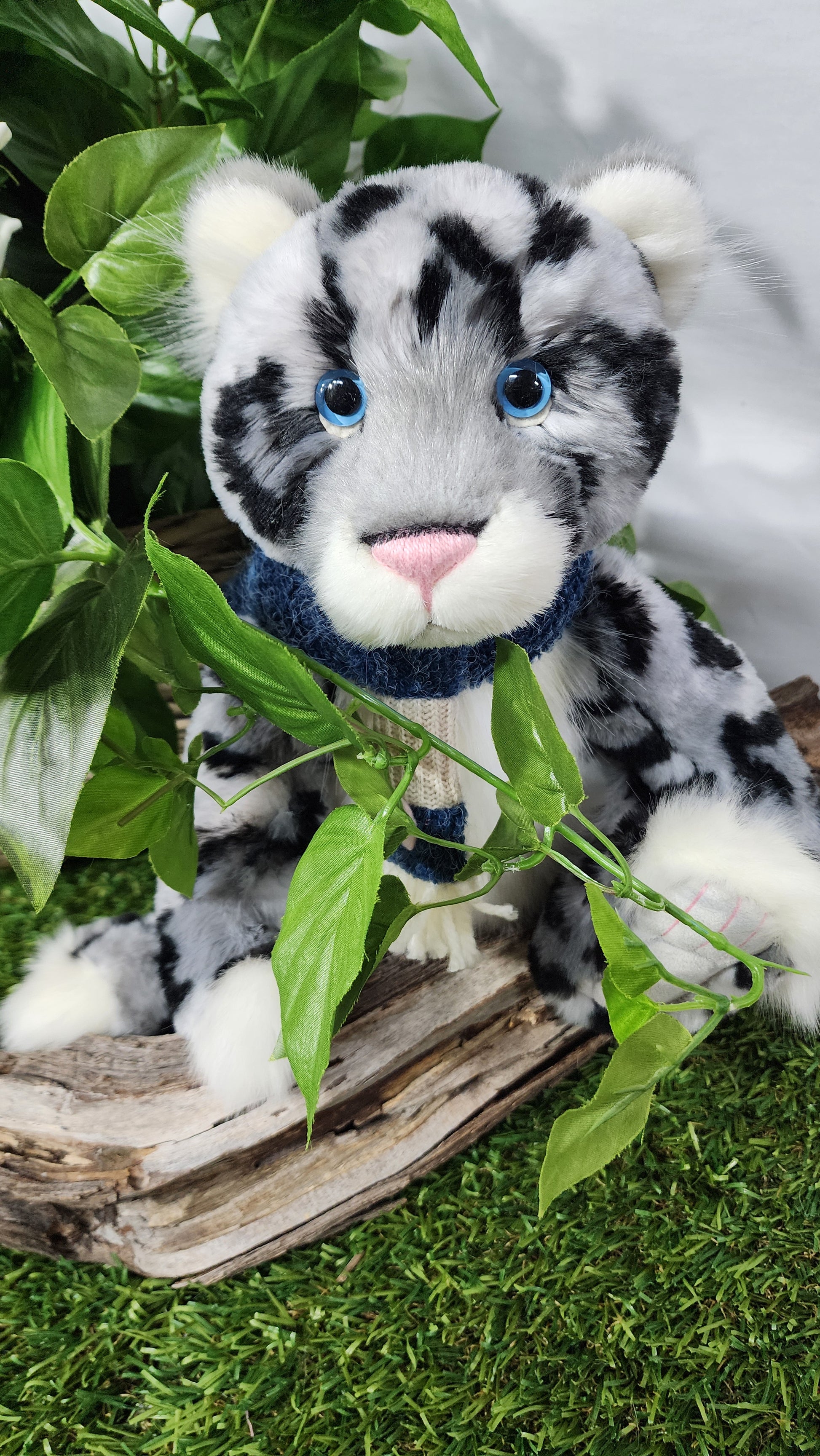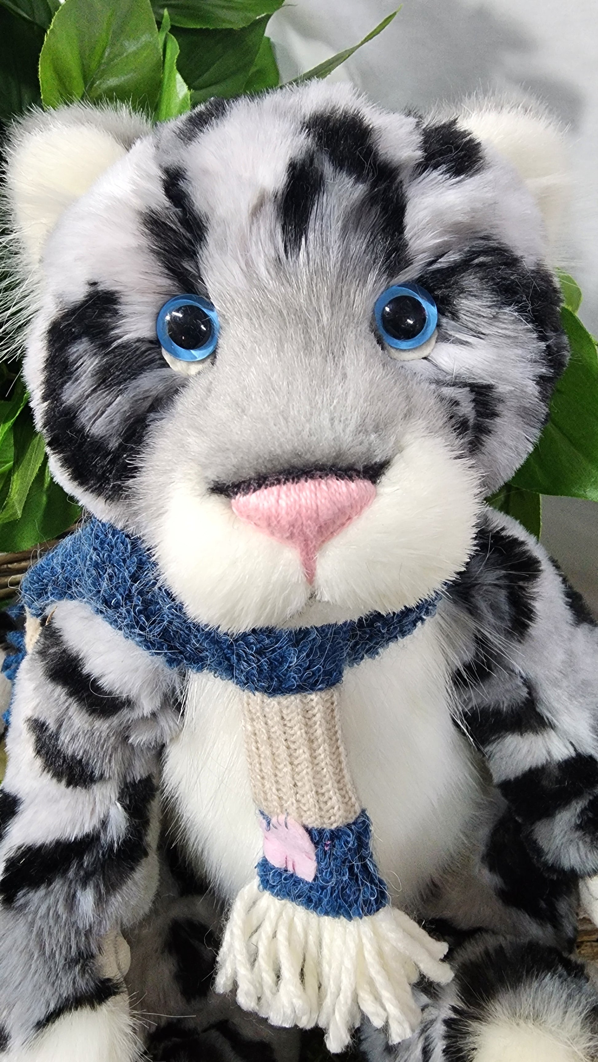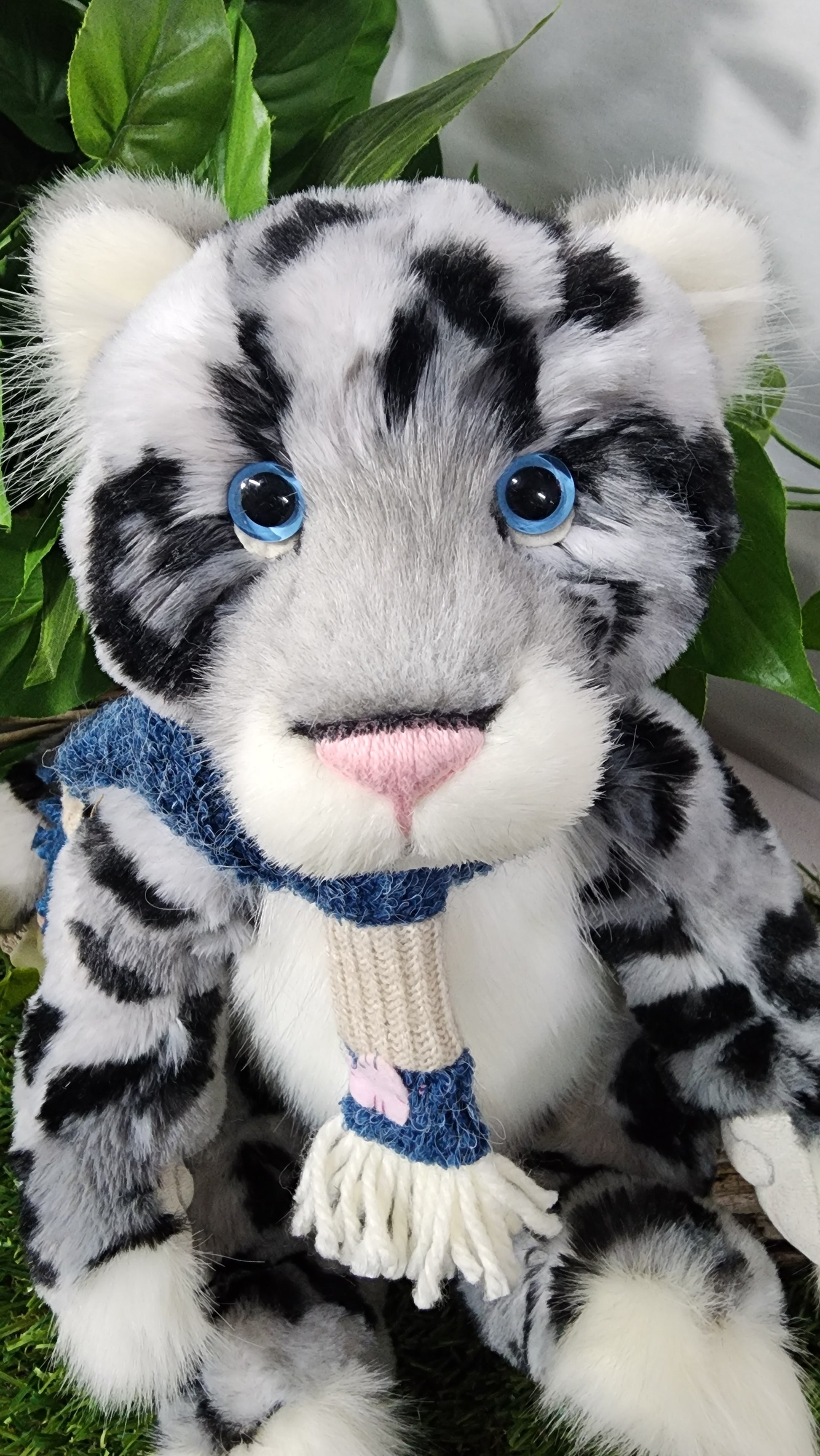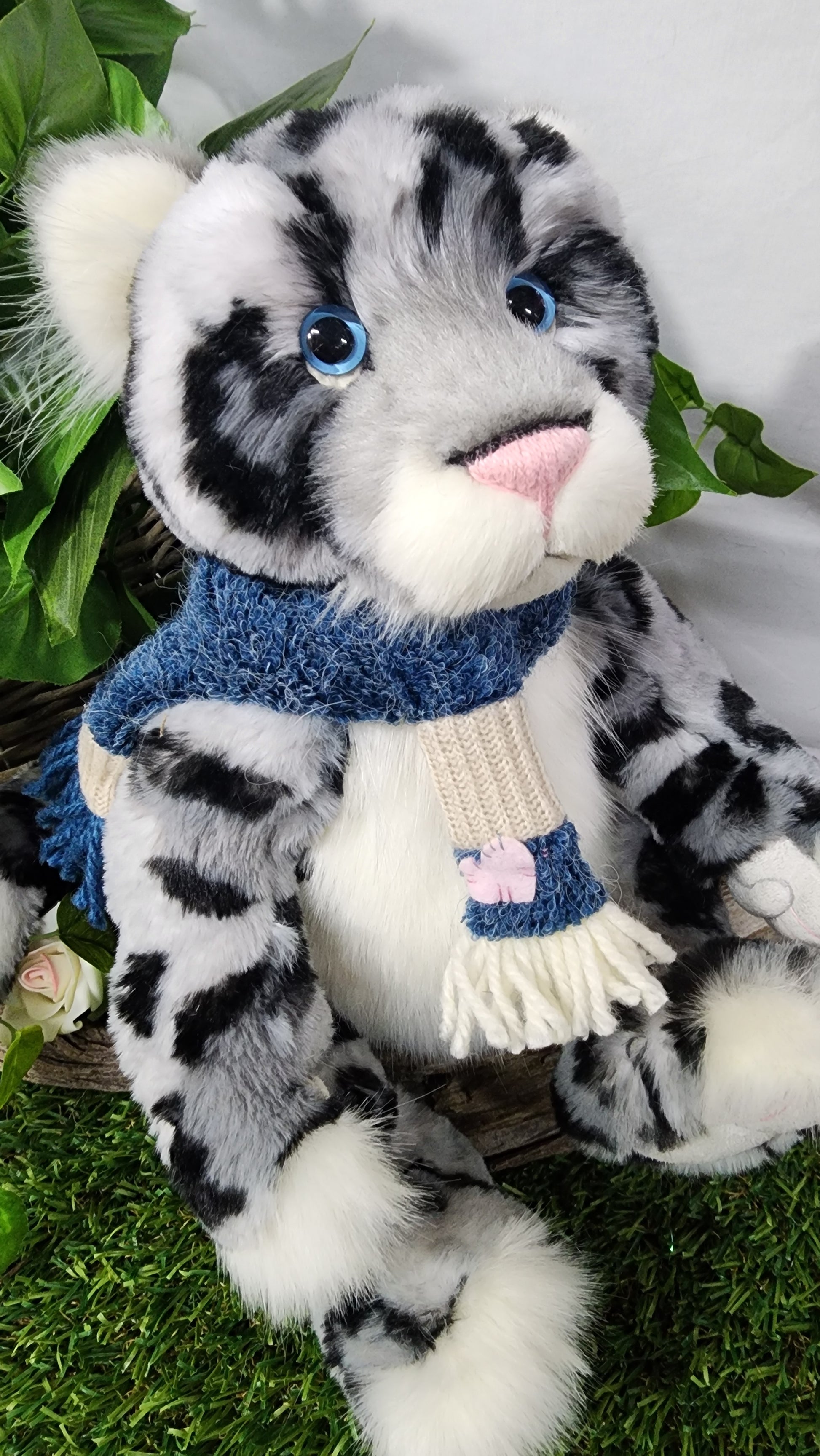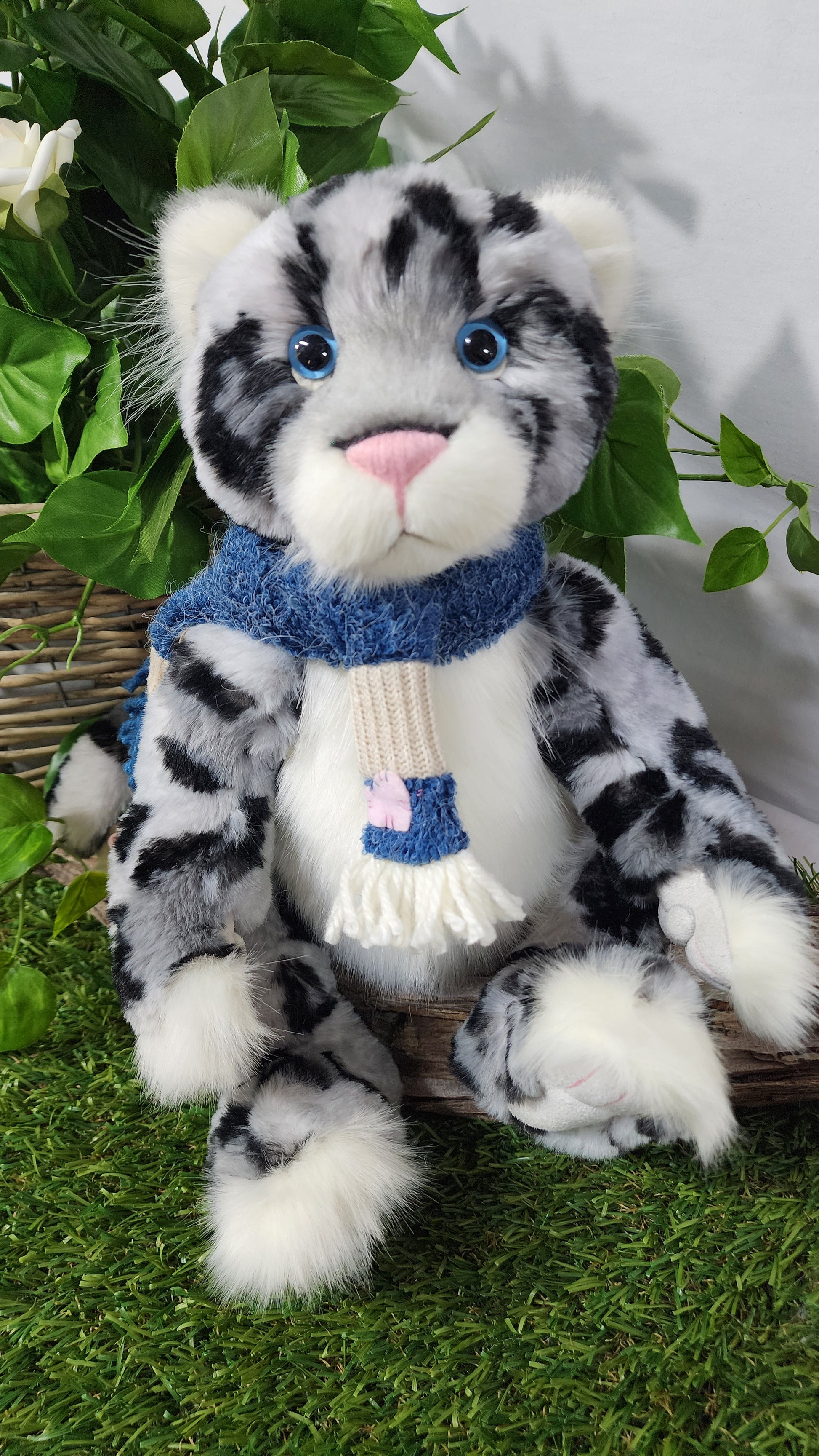 Meet Babbledy, a Paw Store Exclusive leopard. With his colours of silvery grey, cream and black his pattern and palette are that of the graceful and stunning Snow Leopards. To keep him warm in the snow he features a knitted scarf with a very sweet heart detail. His swishy tail, bright blue eyes and fluffy sculpted toes showcase Charlie Bears fine attention to detail and live up to their phrase, 'bears with personality'.