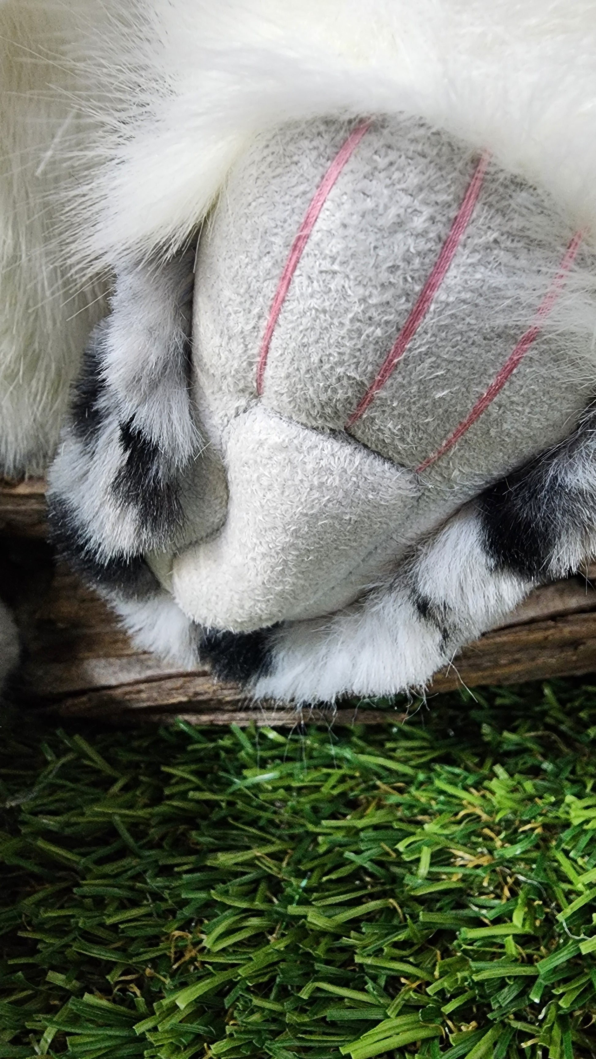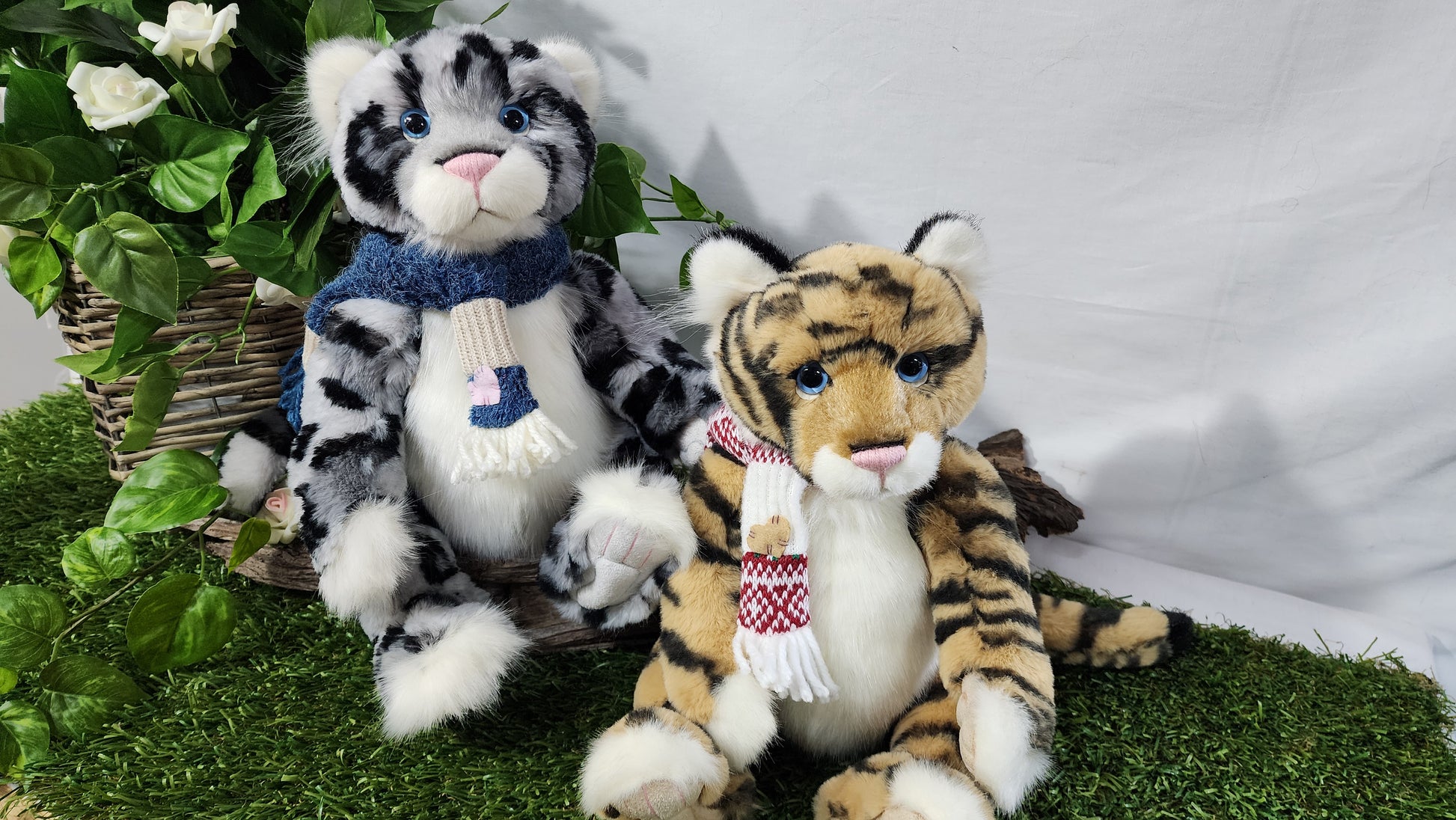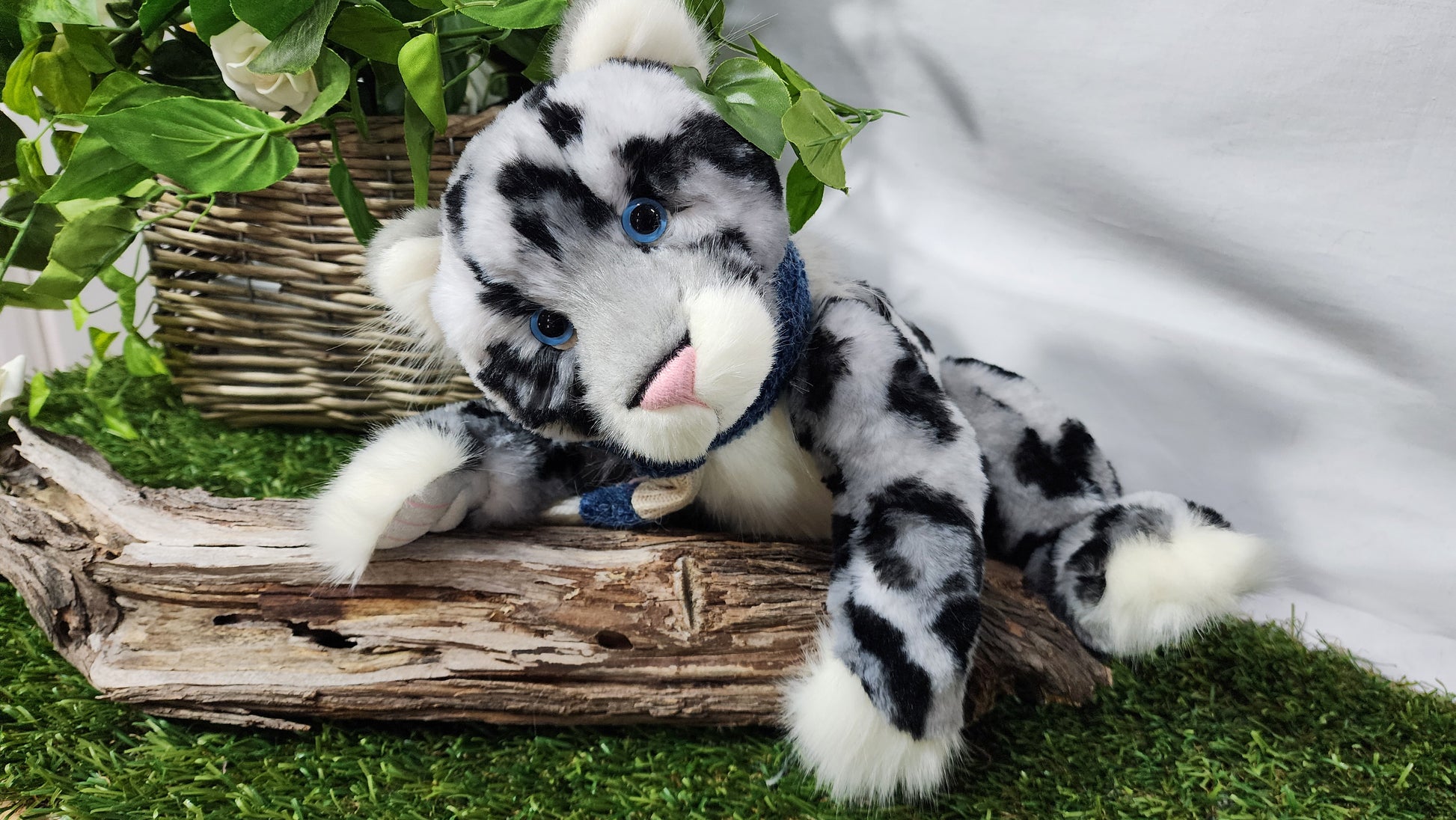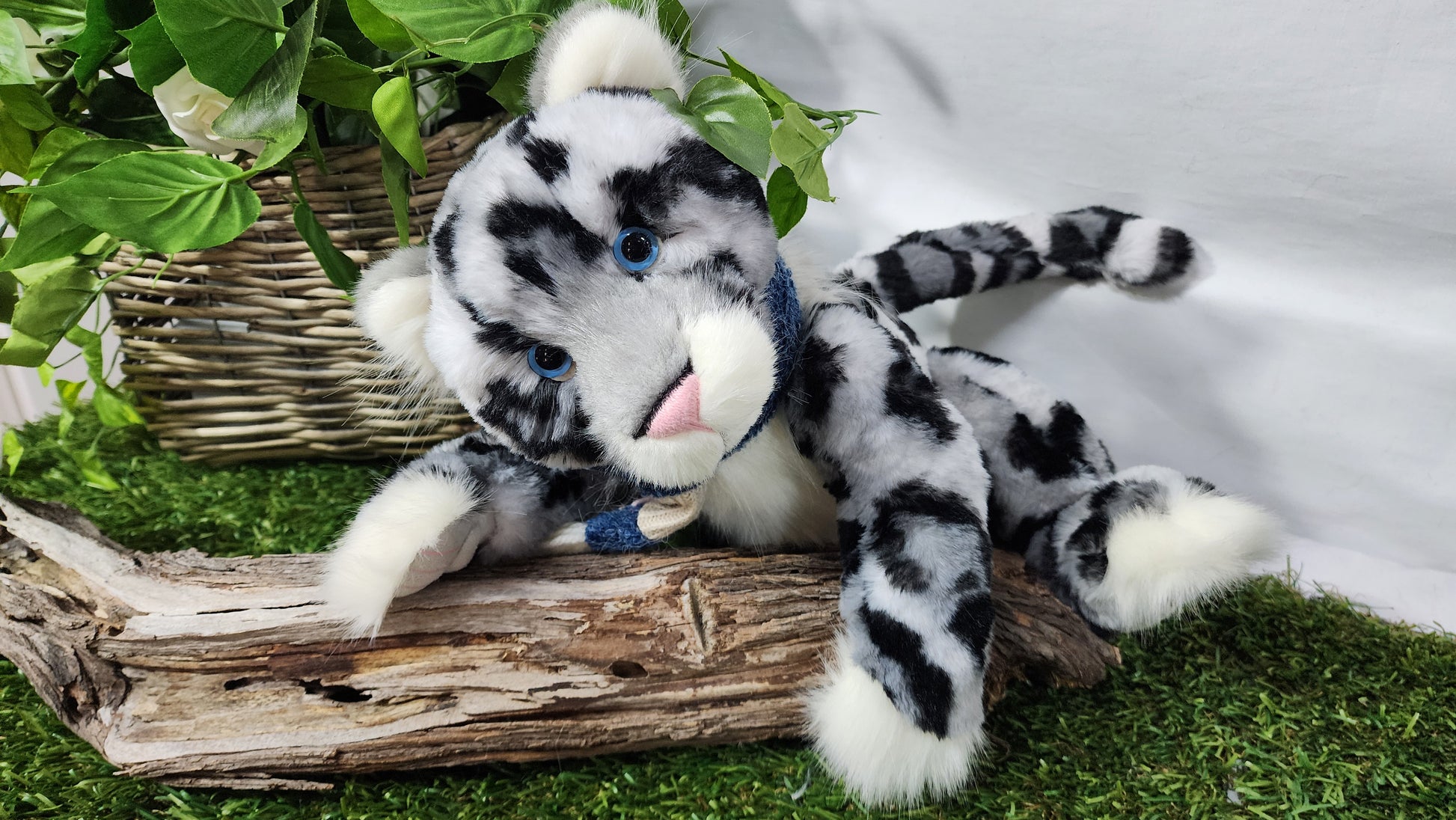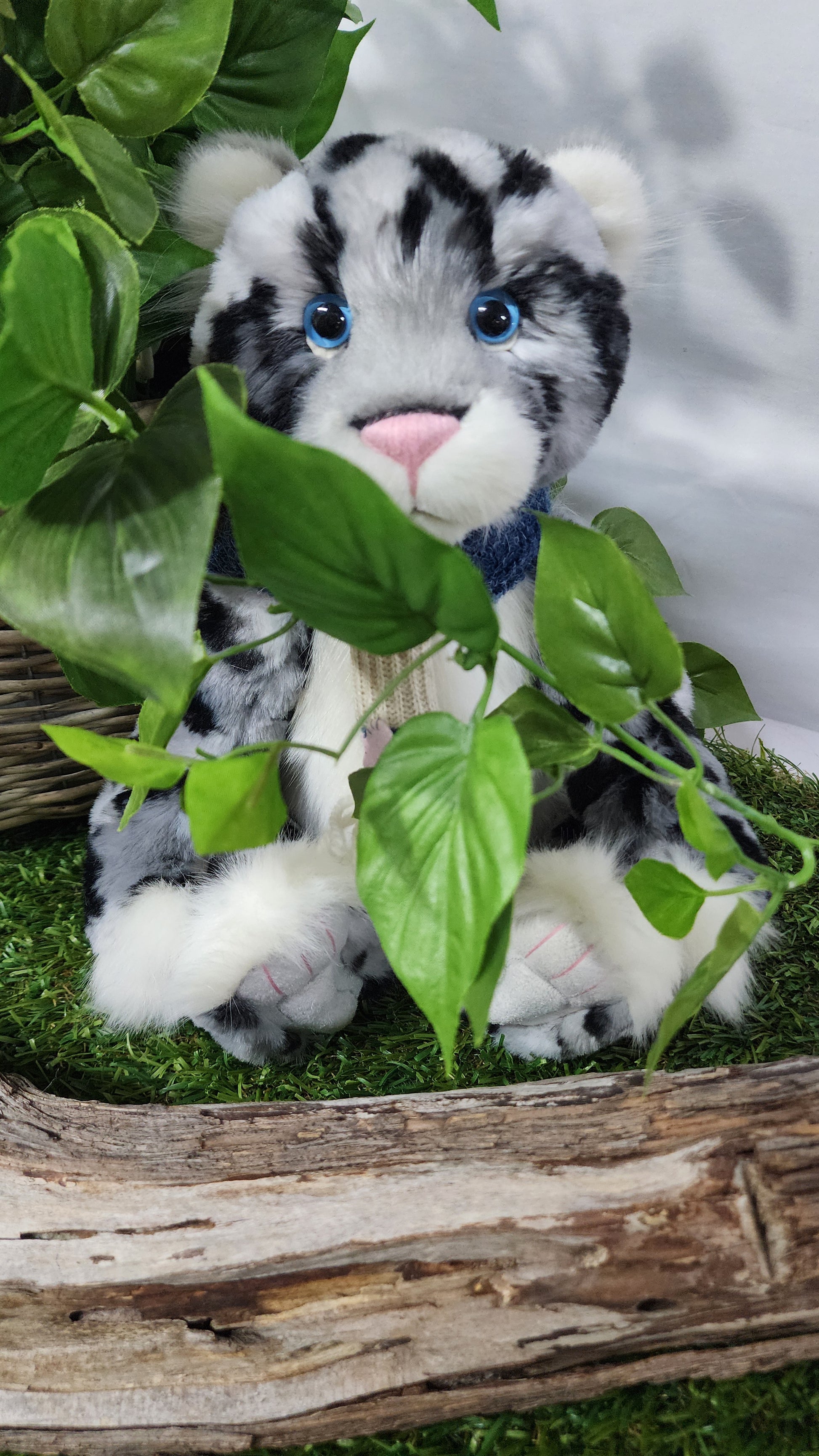 Meet Babbledy, a Paw Store Exclusive leopard. With his colours of silvery grey, cream and black his pattern and palette are that of the graceful and stunning Snow Leopards. To keep him warm in the snow he features a knitted scarf with a very sweet heart detail. His swishy tail, bright blue eyes and fluffy sculpted toes showcase Charlie Bears fine attention to detail and live up to their phrase, 'bears with personality'.
