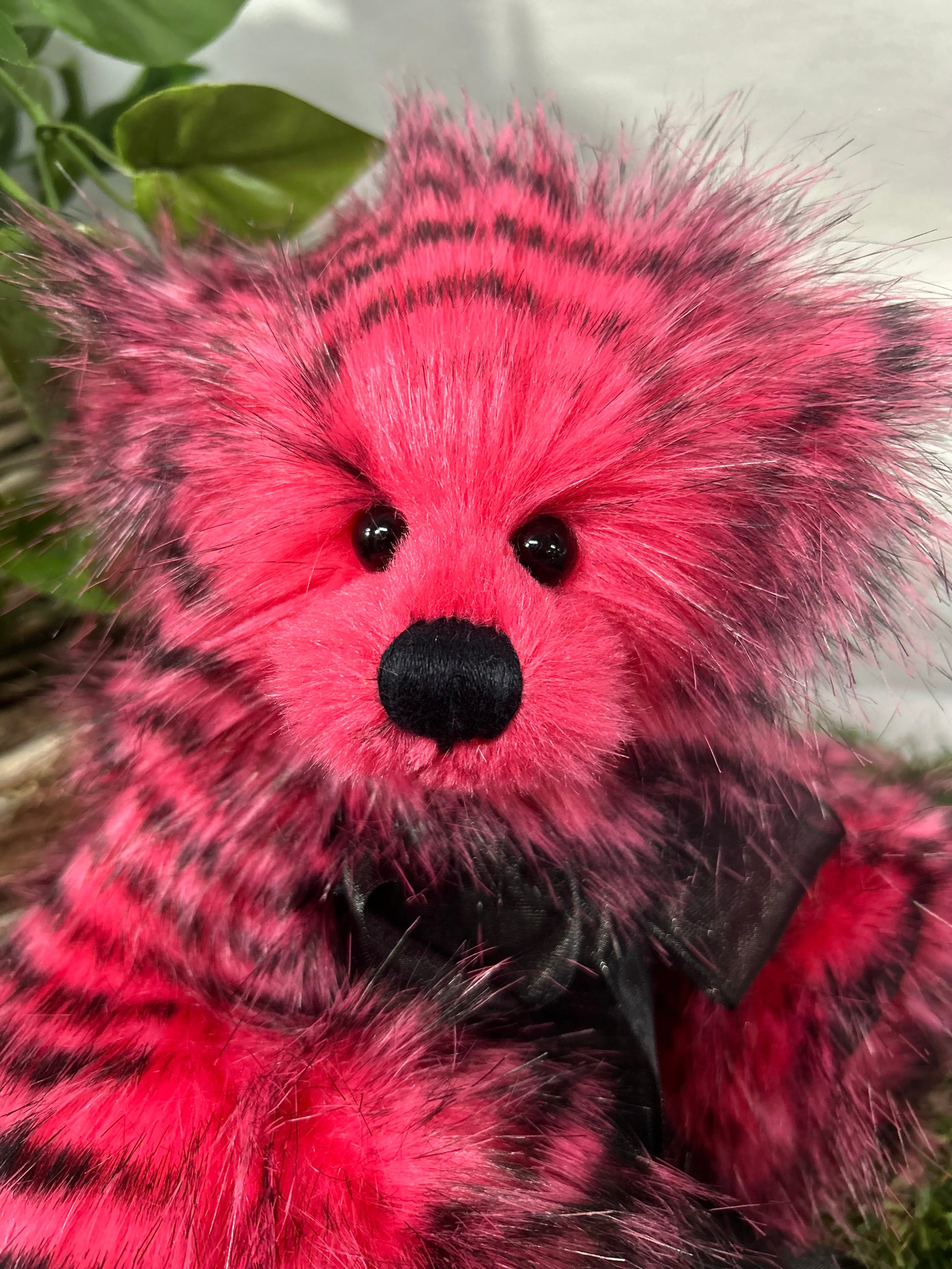 As his name suggests, Cherry Pip here is a delightfully sweet 28cm bear. Reminiscent of a Cherry Ripe, his colours are a juicy hue of raspberry with dark streaks across his long pile plush fur. Complementing his colour palette is a black organza bow and soft black feet. His stunning and unusual colour, not quite red or pink, make him a unique character to add to your hug!