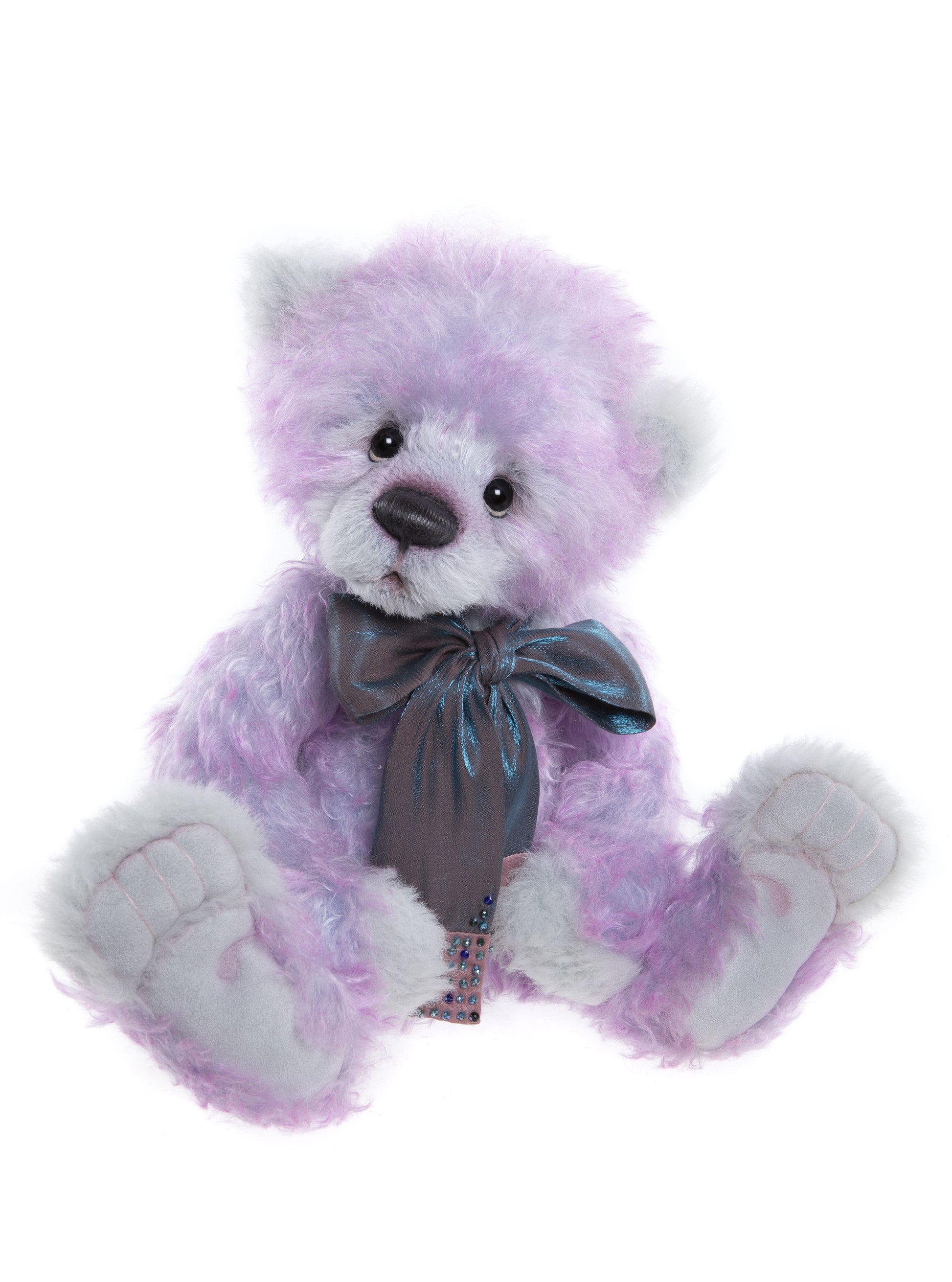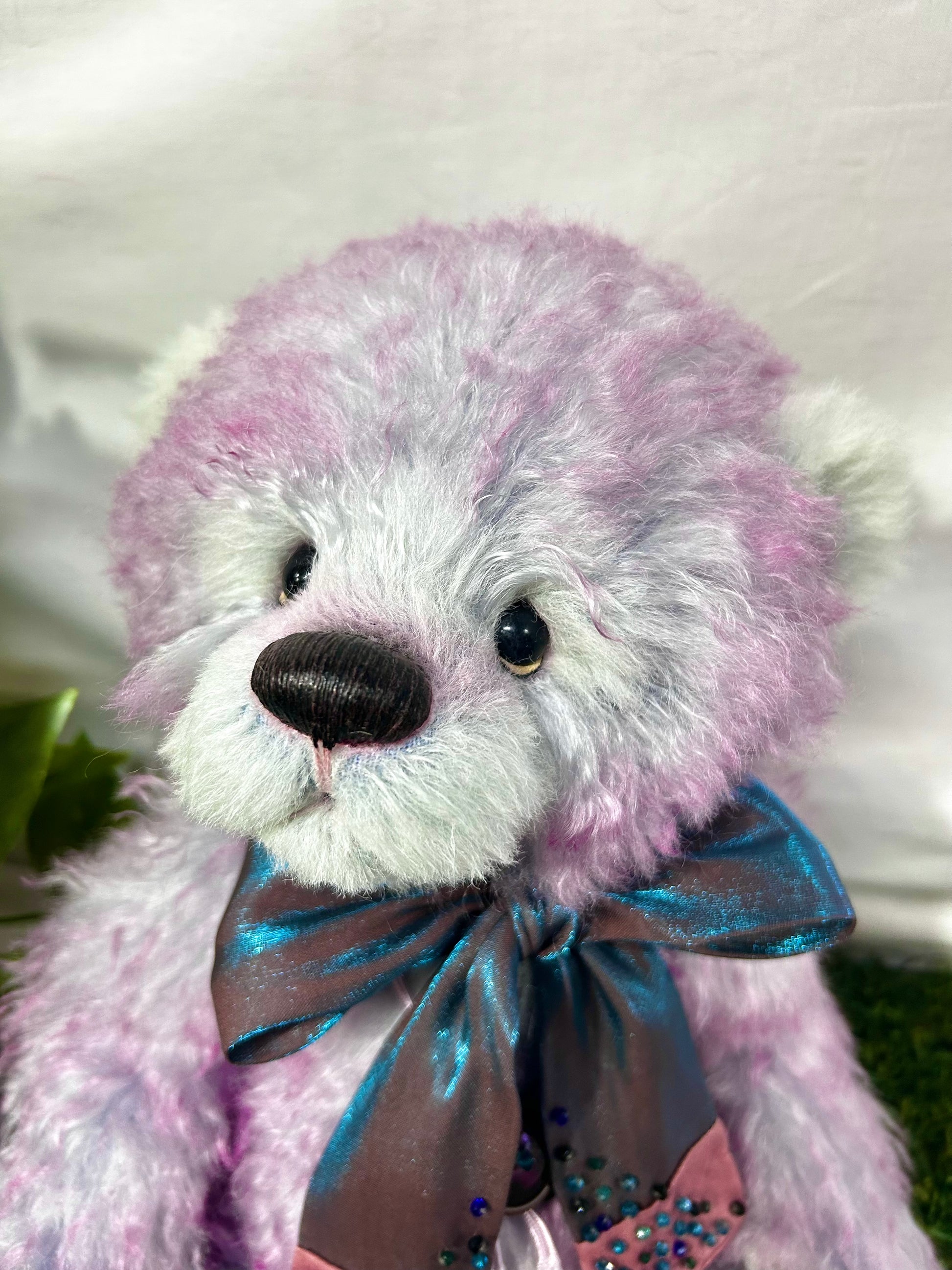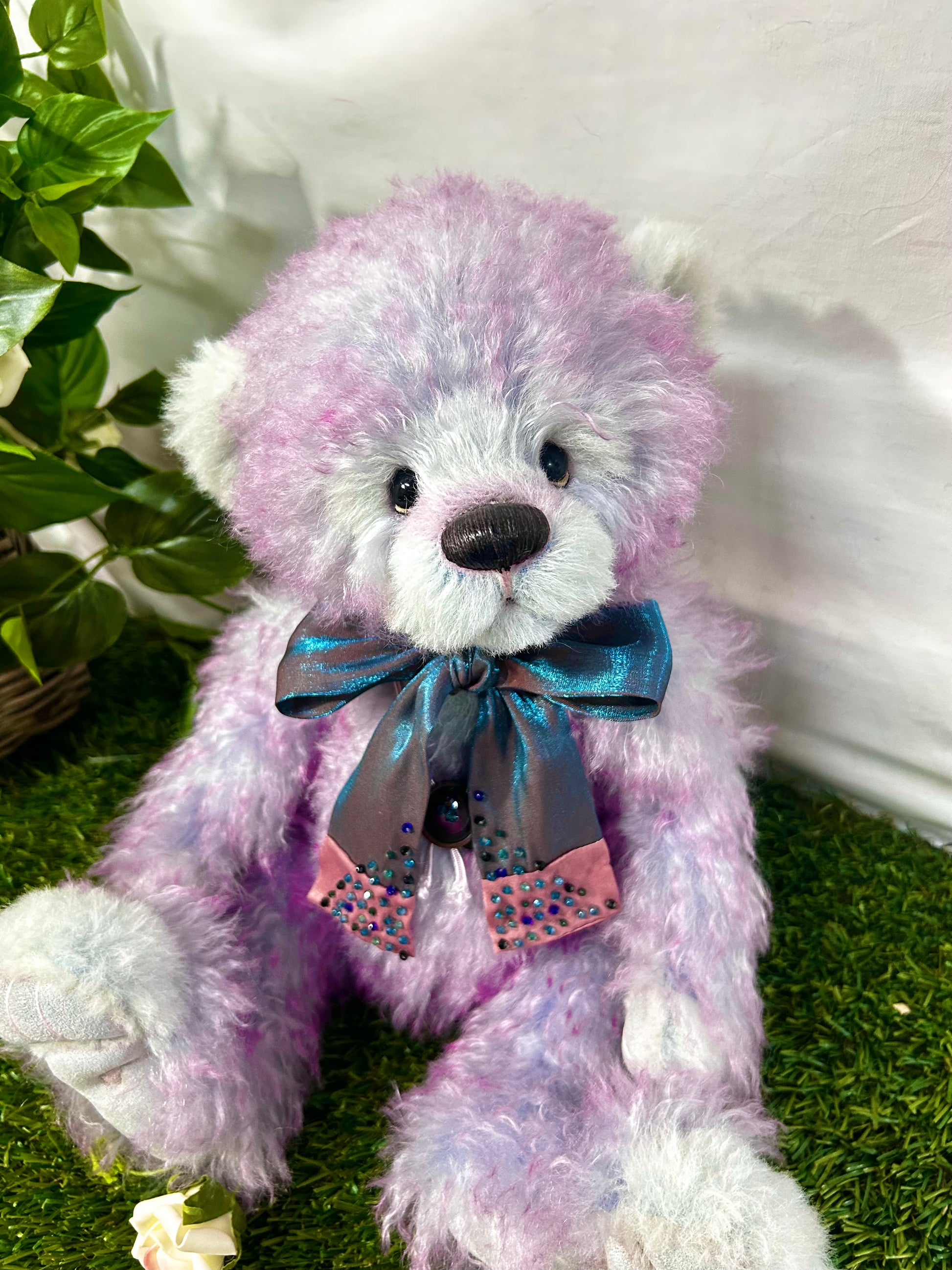 In a colour palette of purple and light grey Alpaca and Mohair fibres, Juliet is a gorgeous soft pop of colour, and with her sophisticated appearance she will elevate your collection! Adding to her elegance is a unique colour changing bow that shifts from peacock blue to deep plum, and bejewelled beadwork for added sparkle!
