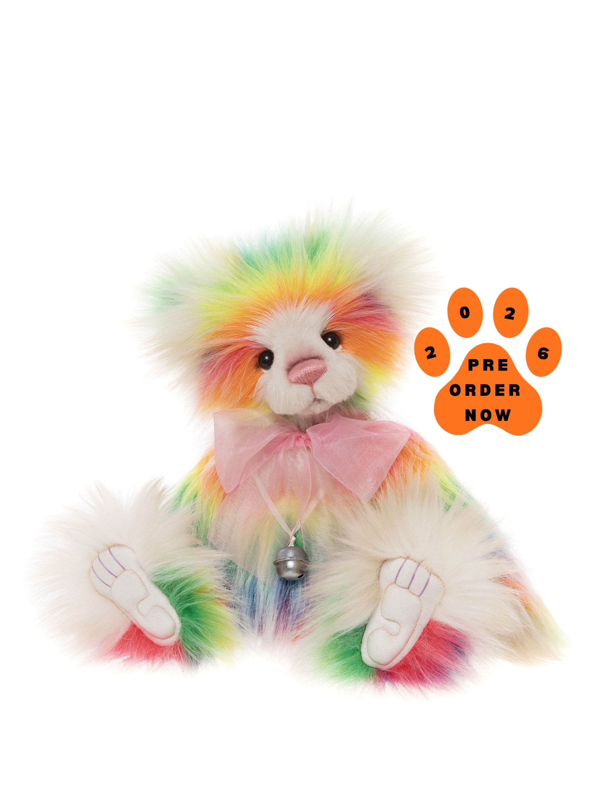 Meet Rivendell, the rebel of the Charlie Bear family! This vibrant little troublemaker bursts with punchy brightness—think popping candy orange, sun-bright yellow, lollypop pink, lush greens, and bold blues all dancing across her fur. Her face practically grins at you, daring you to look away. She's the wild child who thrives on colour and chaos. Pair her with her complete opposite, the serene Arendelle in soft pastels, and you've got the ultimate sibling duo that brings balance, mischief, and endless personality to any collection!