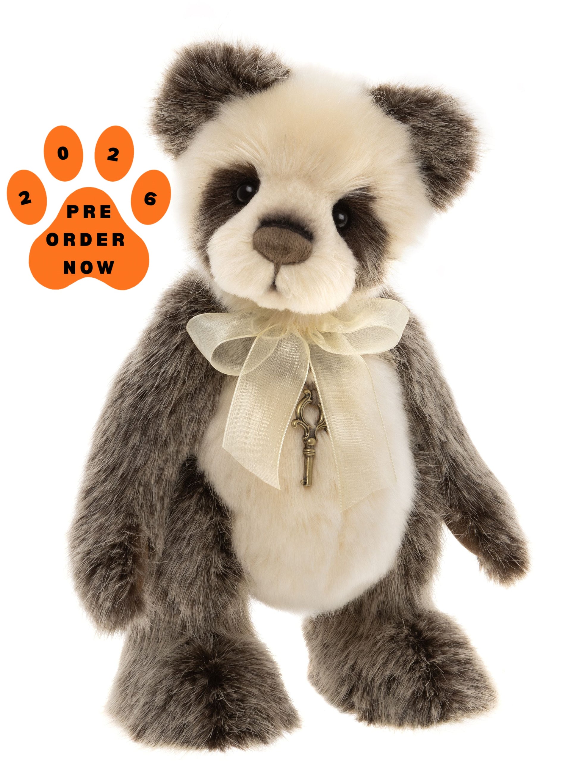Meet Ticklish, the delightfully chubby panda of our Feelings collection! This standing plush Charlie Bear is dressed in the most scrumptious chocolate and cream tones—so yummy you'll want to take a bite! With a tummy that tells tales of indulgence, Ticklish wears a precious key around his neck, symbolising the way straight to your heart. Part of our special set of five bears celebrating unique emotions, Ticklish brings giggles, warmth, and sweet affection to every cuddle.