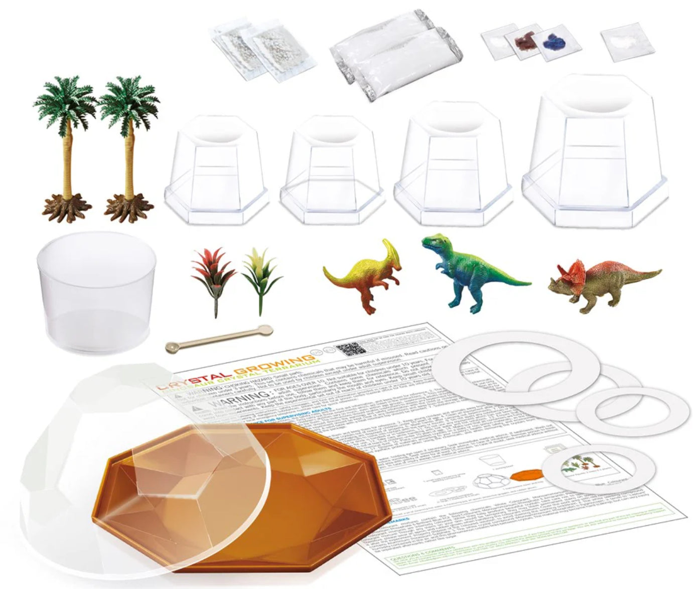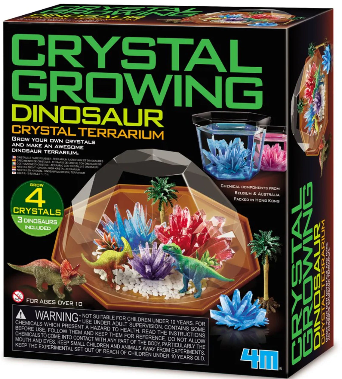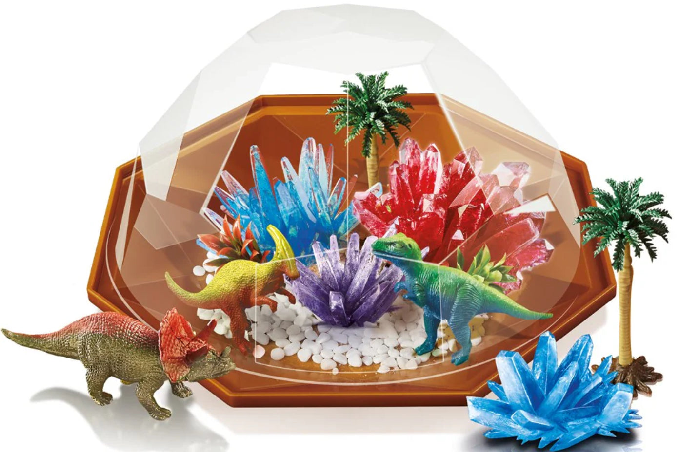 Includes 4 crystal growing compounds and 3 dinosaurs, plus your very own terrarium case.