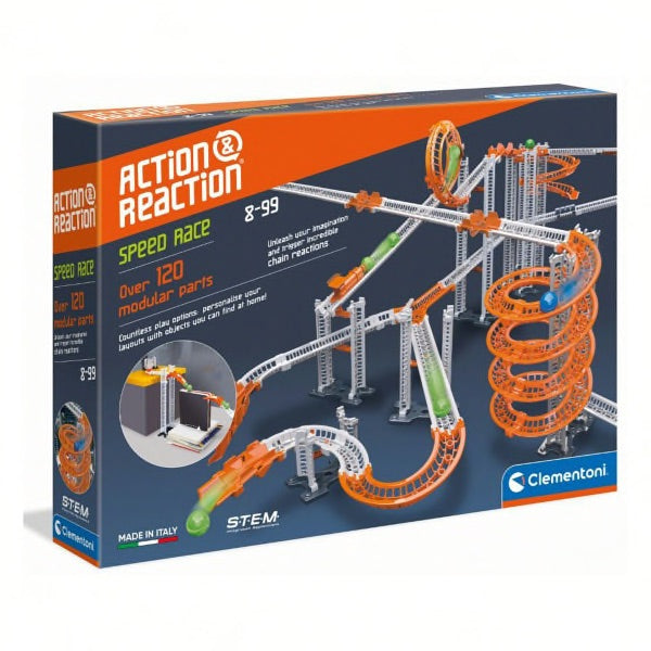 - Includes a Clementoni Science Museum Action and Reaction Speed Race set with over 120 interchangeable parts