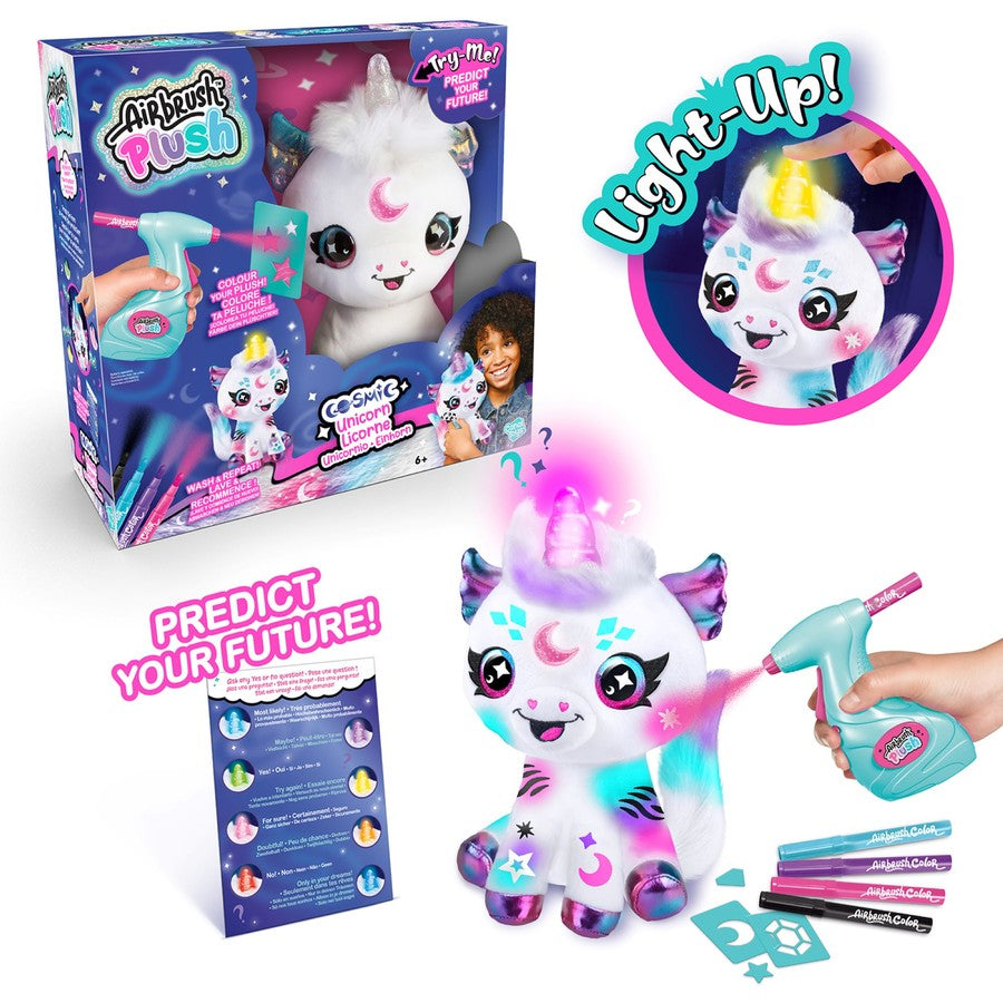 Customize your plush with your spray, your markers, and your stencils. Wash your plush and do it again! Ask a question to your Cosmic Unicorn and press its horn: it lights up! Decode the answer to your question with the fortune-telling guide.