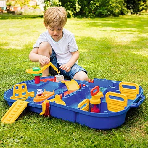 Meet AquaPlay's bestseller, the portable LockBox! Let Wilma the Hippo take the container boat out for a journey through the popular lock system by using the pump. In the harbour the crane will assist you to load the container on the truck. By turning the paddle wheel the water flows through the canals, a playful way of educating how water moves. There are endless of playtime and once ready - it's easy to fold the set together to a suitcase and stove away.