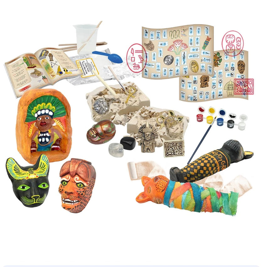 Secrets of the Pyramid Builders’ kit is a unique and exciting Forensic Archaeology Kit like no other. Use forensic techniques to explore the scientific genius of the Ancient Mayans and Egyptians. Who showed who how to build pyramids? Crack secret inscriptions on Coins, a golden Ankh, a Sacred Scarab, Sacred Turtles and more. Crime Scene investigation: did a beautiful mineral really kill the Pharaohs? Use ancient casting mix to make realistic Egyptian and Mayan amulets. Learn the ancient skill of wrapping and preserving a life-size mummy of a Sacred Kitten. Make an eye-boggling spooky Corn God carving that ‘impossibly’ comes to life in darkness. Use modern technology to reveal the disappearing messages on the ‘Rosetta’ Papyrus and Secret Codex. And so much more…