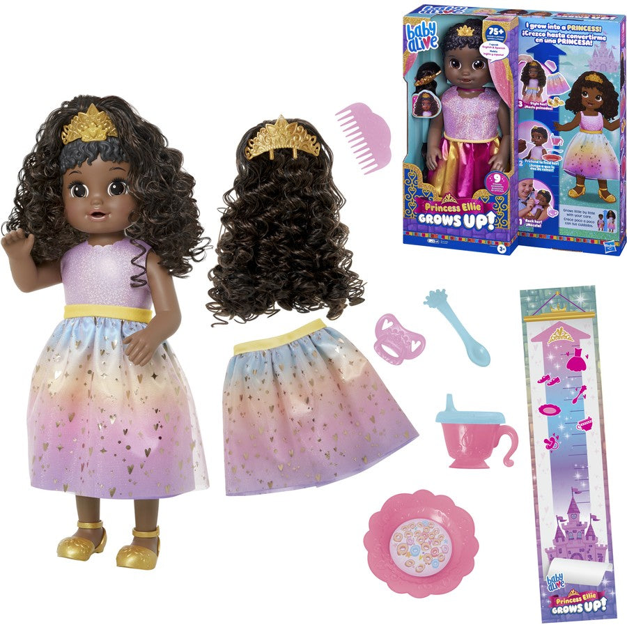When will she grow into a gorgeous princess? Baby Alive Princess Ellie Grows Up! talking doll grows little by little with kids’ care and responds with 75+ sounds and phrases. A twinkly chime plays whenever she grows! As a baby, she slowly grows with rocking, giving her a pacifier and pretending to feed her with her sippy cup and bowl/spoon. Bouncing movements and pretend feeding/drinking will help her keep growing as she gets taller. Kids ages 3 and up will have fun tracking her height with the included growth chart and styling her with dress-up baby doll accessories! Place her brushable tiara hair extension on her head and put the princess skirt over her outfit to complete her royal look. Instructions and quickstart guide help kids care for their growing doll and reset her to play again! This 18-inch (45 cm) Baby Alive doll that grows up is an exciting toy for girls and boys, and a great gift for birthdays and holidays.
