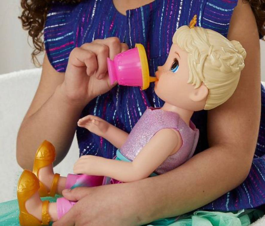When will she grow into a gorgeous princess? Baby Alive Princess Ellie Grows Up! is a Baby Alive doll that grows up! Fantastic baby dolls for 3 year old girls and boys and up! This talking doll grows little by little with kids’ care and responds with 75+ sounds and phrases. A twinkly chime plays when she grows! As a baby, she slowly grows with rocking, using pacifier and pretend feeding with her sippy cup and bowl/spoon. Bouncing movements and pretend feeding/drinking help her keep growing! Kids will have fun tracking her height with the included growth chart and styling her with Baby Alive doll clothes and Baby Alive accessories! Place her brushable tiara hair extension on her head and put the princess skirt over her outfit to complete her royal look! Instructions and quickstart guide help kids care for their growing doll and reset her to play again! These Baby Alive grows up dolls are exciting princess toys for 3 year old girls and boys and up, and make great gifts for kids!