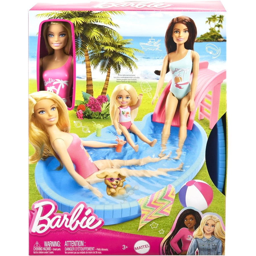 Slide into summer fun with Barbie doll and her pool! It's easy to fill and empty for an instant pool party. Help Barbie climb the ladder and go down the slide, then relax in the water with a refreshing drink!