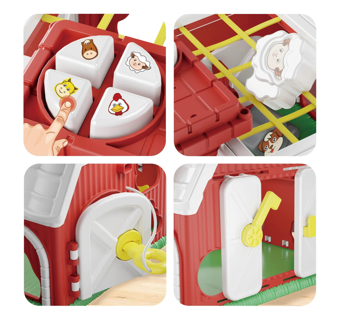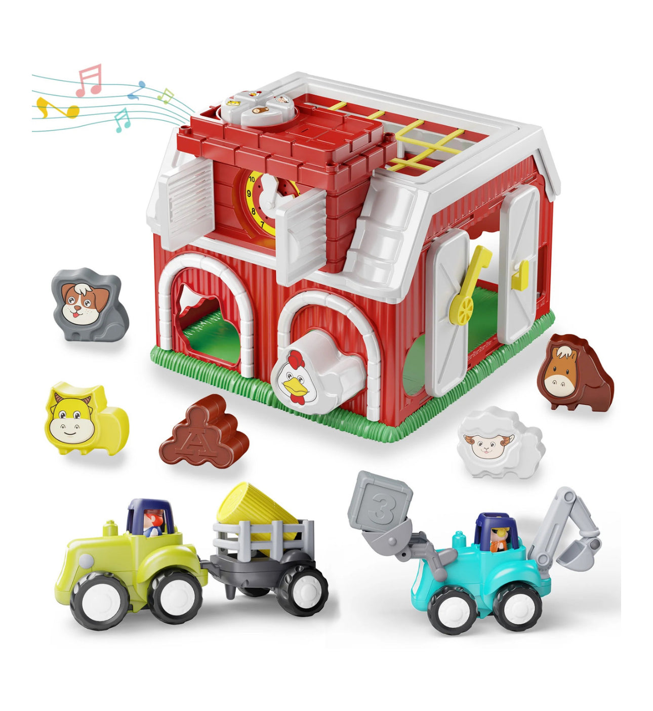 The Farm Animal Barn Playset includes a farm house, tractor, excavator, 5 animal figurines, and shape sorter blocks.