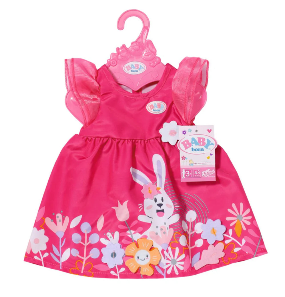 - Includes pink dress with bunny-and-flowers print and a hanger.