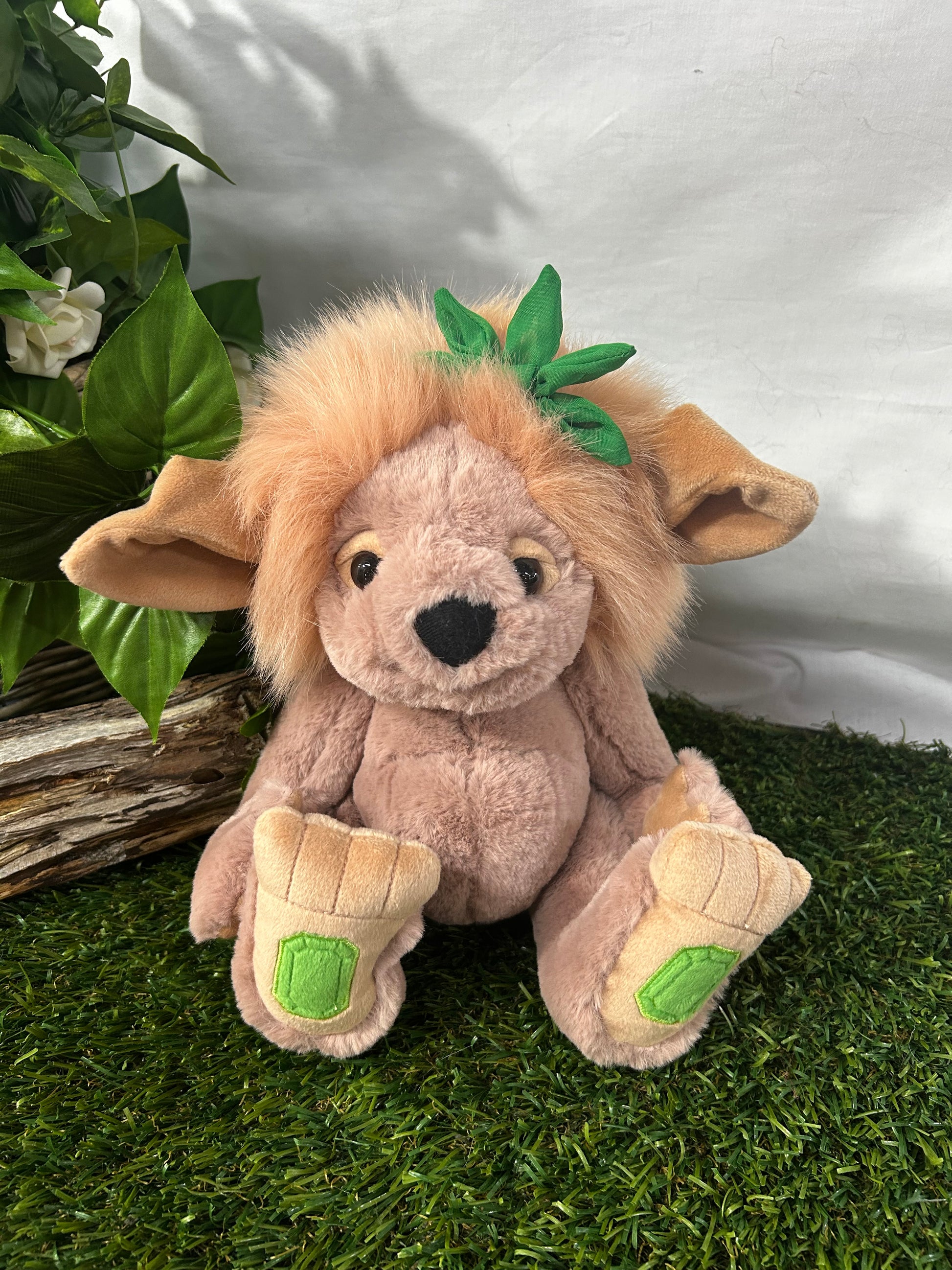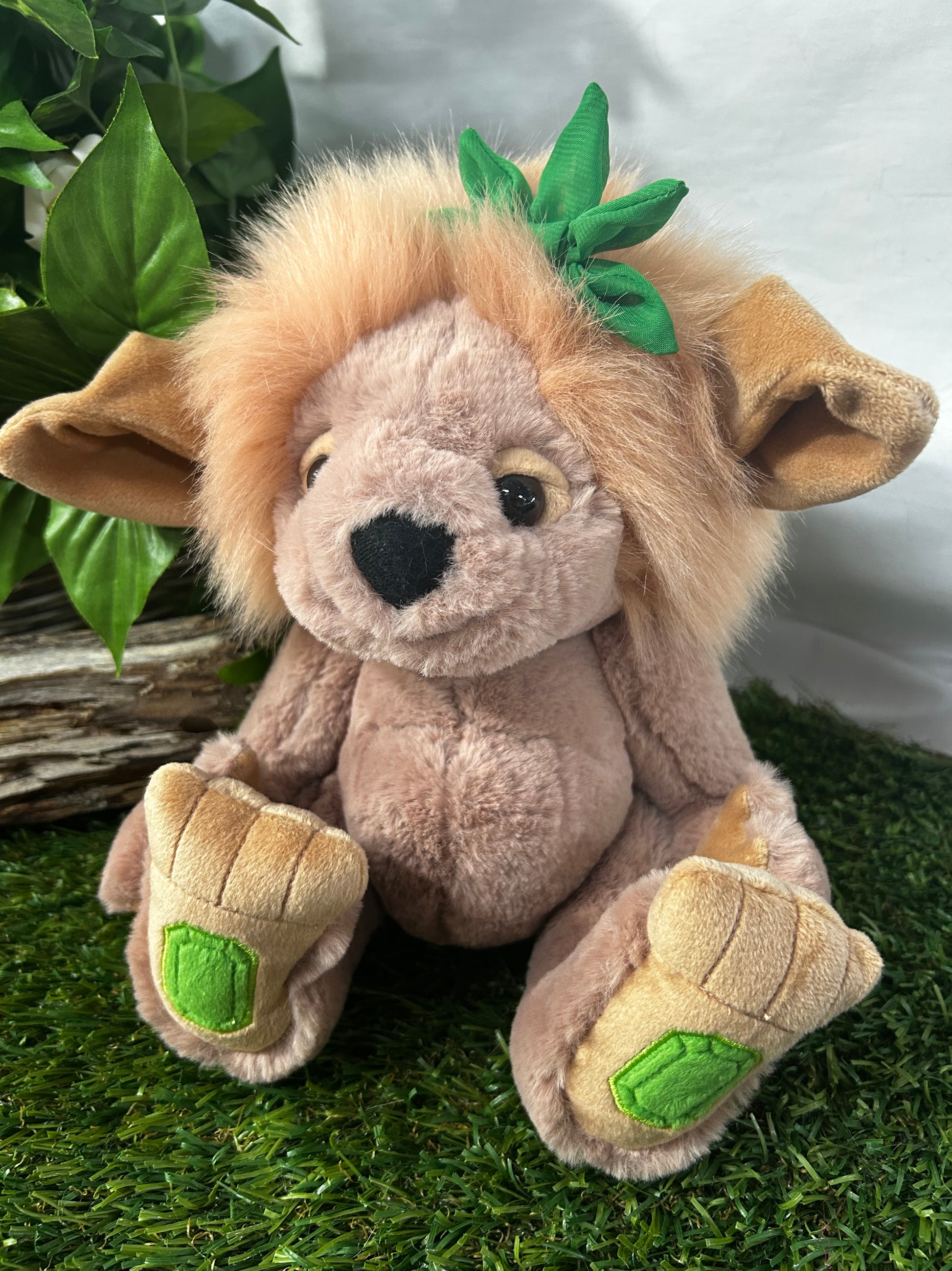 Meet our new range of trolls, unlock the magic with Emerald Lou! This ginger coloured troll has the cheekiest smile, made from luxuriously soft plush fur with floppy pointed ears and long-pile hair. Adorning her mane of hair is an emerald green pointed bow and each foot pad has a gem shaped pattern in her signature colour.