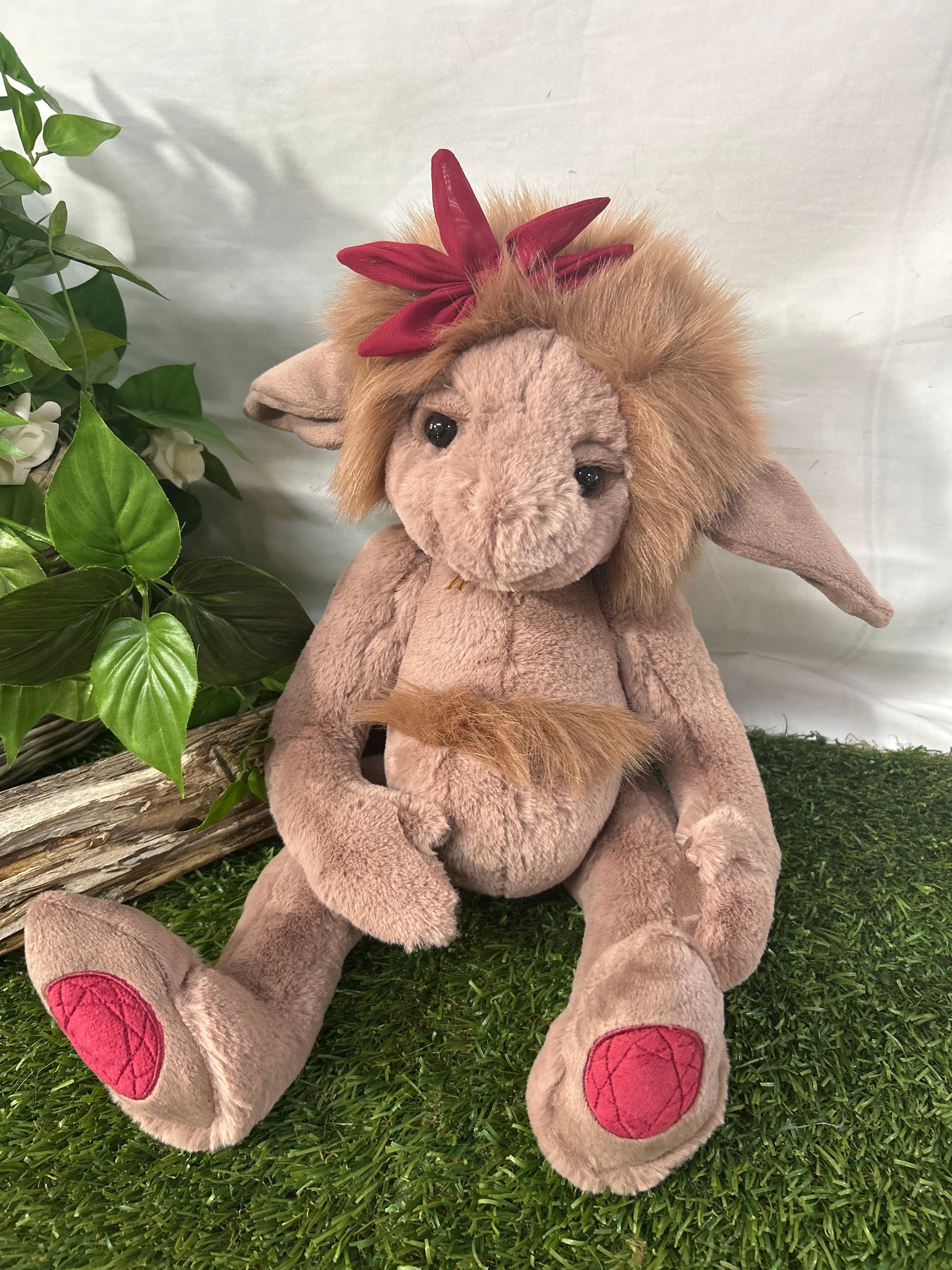 Meet our new range of trolls, unlock the magic with Ruby Roo! This mushroom brown coloured troll has a mischievous smile and big round eyes. She is made from luxuriously soft plush fur with long floppy pointed ears and long-pile hair. Adorning her mane of hair is an deep red pointed bow and each foot pad has a gem shaped pattern in her signature colour.