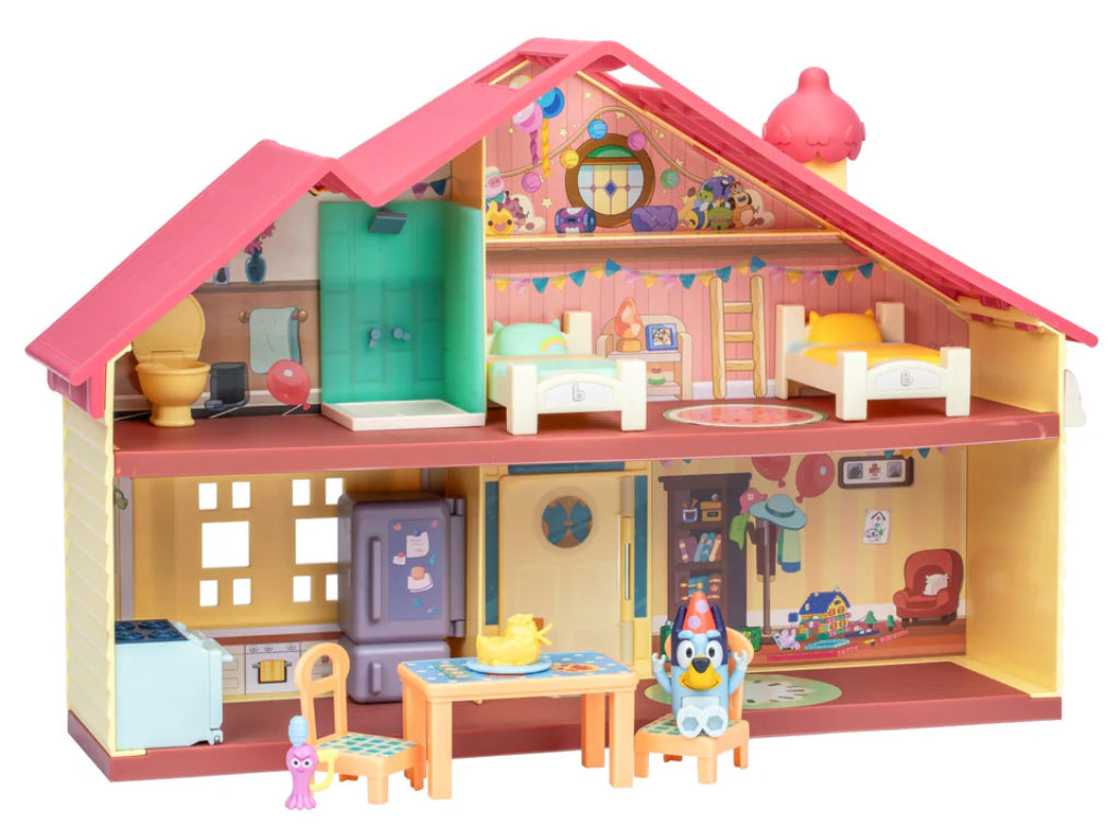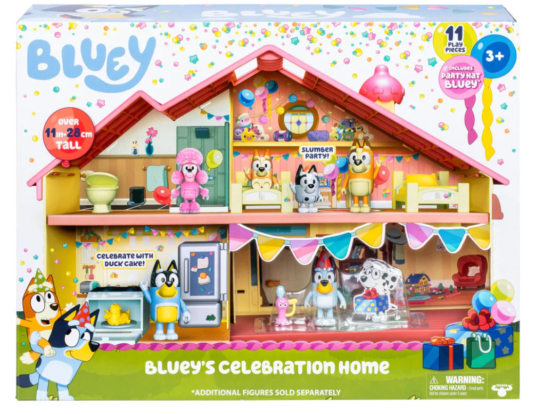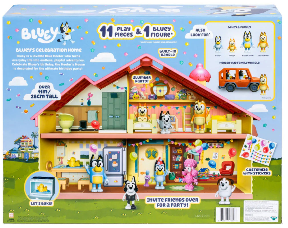 The playset comes with 11 play pieces, including two beds, dining table with chairs, a fridge, and an oven with your very own Duck Cake! Use the sticker sheet to decorate the house before your guests arrive. The playset comes with an exclusive 2.5"" Bluey figure wearing a party hat! Bluey's Celebration Home even has a convenient built-in carry handle so you can take the party on the go.