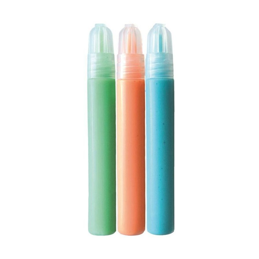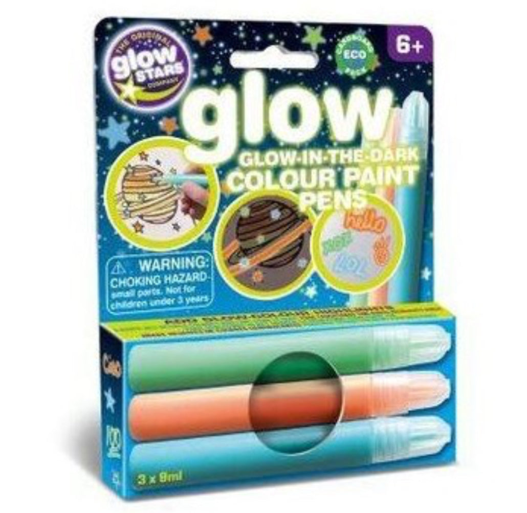 Glow-in-the-dark colour paint pens can be used to add glow-in-the-dark highlights to art and craft projects. Create your own glow-in-the-dark features on drawings, stickers, posters and books with these easy to use glow-in-the-dark paint pens by The Original Glowstars Company. Adds that special touch to party and Halloween decorations! In the pack you will receive three 9ml glow in the dark paint pens. Gently squeeze the pen as you write or draw pictures for your bedroom walls, charge them up in the light and then watch them glow at bedtime. The glow-in-the-dark paint pens give an embossed, colour finish when applied. Your creations should be left to dry overnight. We recommend that you protect surfaces and wear some old clothing whilst using the pens, as the colour does not wash out of clothing. Any spillages should be wiped up straight away with a damp cloth.
