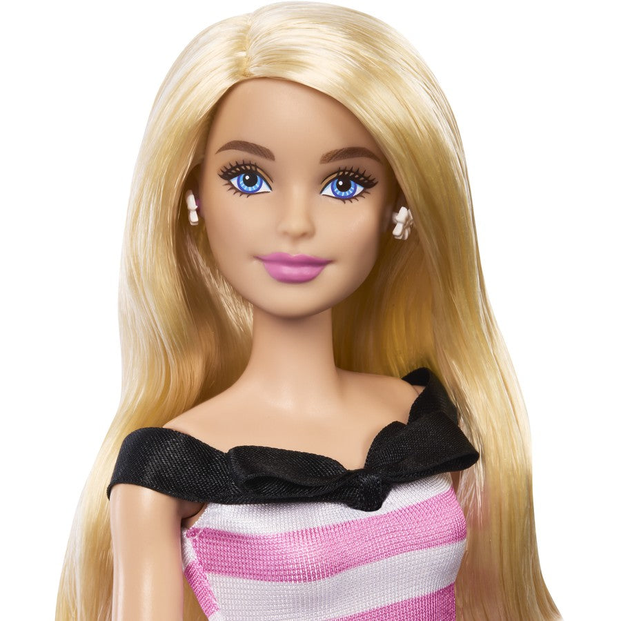 Celebrate the 65th anniversary of Barbie with this commemorative Barbie doll! She rocks a pink and white striped dress accented by a black bow detail at the neckline. Pearly earrings and pink heels complete her classic look! This doll makes a lovely gift for both kids and Barbie fans of any age. Doll cannot stand alone. Colors and decorations may vary.