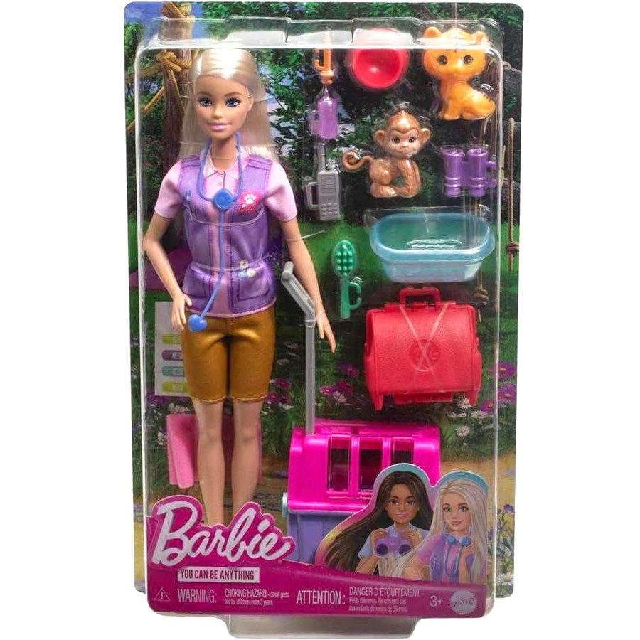 The Barbie Animal Rescue and Release doll and playset let kids bring the outdoors in and explore exciting career possibilities! Barbie animal rescuer doll has two adorable patients to rescue and care for -- a baby monkey and tiger -- and lots of accessories to help. With items like an animal carrier, doctor's bag and more, Barbie doll takes kids on wild adventures and encourages young minds to dream big.