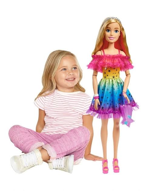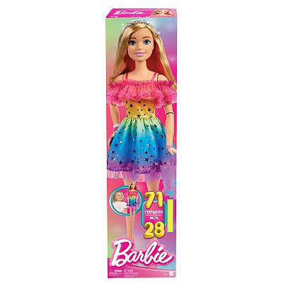 This poseable, large Barbie doll has the same Barbie charm that kids know and love, but expanded to a 71cm tall frame. After all, more Barbie means even more fun! She rocks a rainbow dress that shines with stars, and carries a purple purse that can store her included headband and bracelet accessories.
