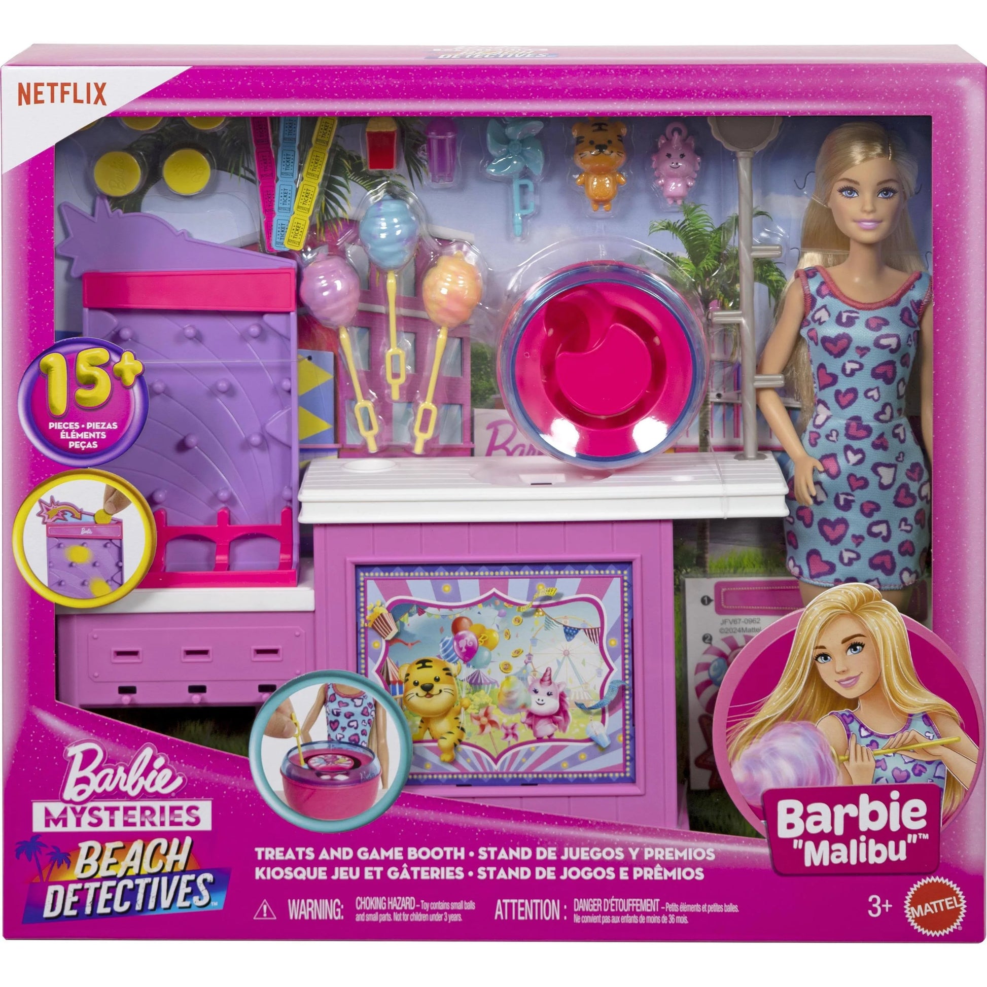 Children can drop a token into the game booth and try their luck at winning adorable prizes, including a pig, tiger, and pinwheel. The cotton candy machine adds a sweet touch, allowing kids to swirl up colourful treats with three sticks and three cotton candy colours. Complete with Barbie ‘Malibu’ dressed in a stylish heart-print dress and white sneakers, this set is packed with storytelling fun for young detectives and Barbie fans alike.