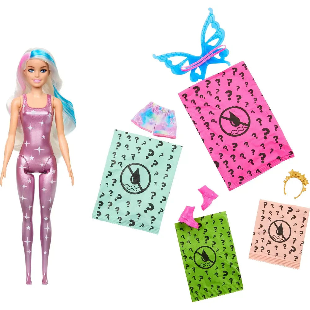 Barbie Color Reveal dolls deliver an unboxing experience full of surprises -- six of them! With the Barbie Rainbow Galaxy Series, these dolls let kids explore the galaxy in style. Inspired by the wonder of the moon and sparkly stars, each Barbie doll comes with long hair with bright-colored streaks and shimmer-molded legs. Accessories include a star-shaped sponge, galactic headpiece, holographic print shorts or skirt, iridescent wings, boots and color-change celestial makeup.
