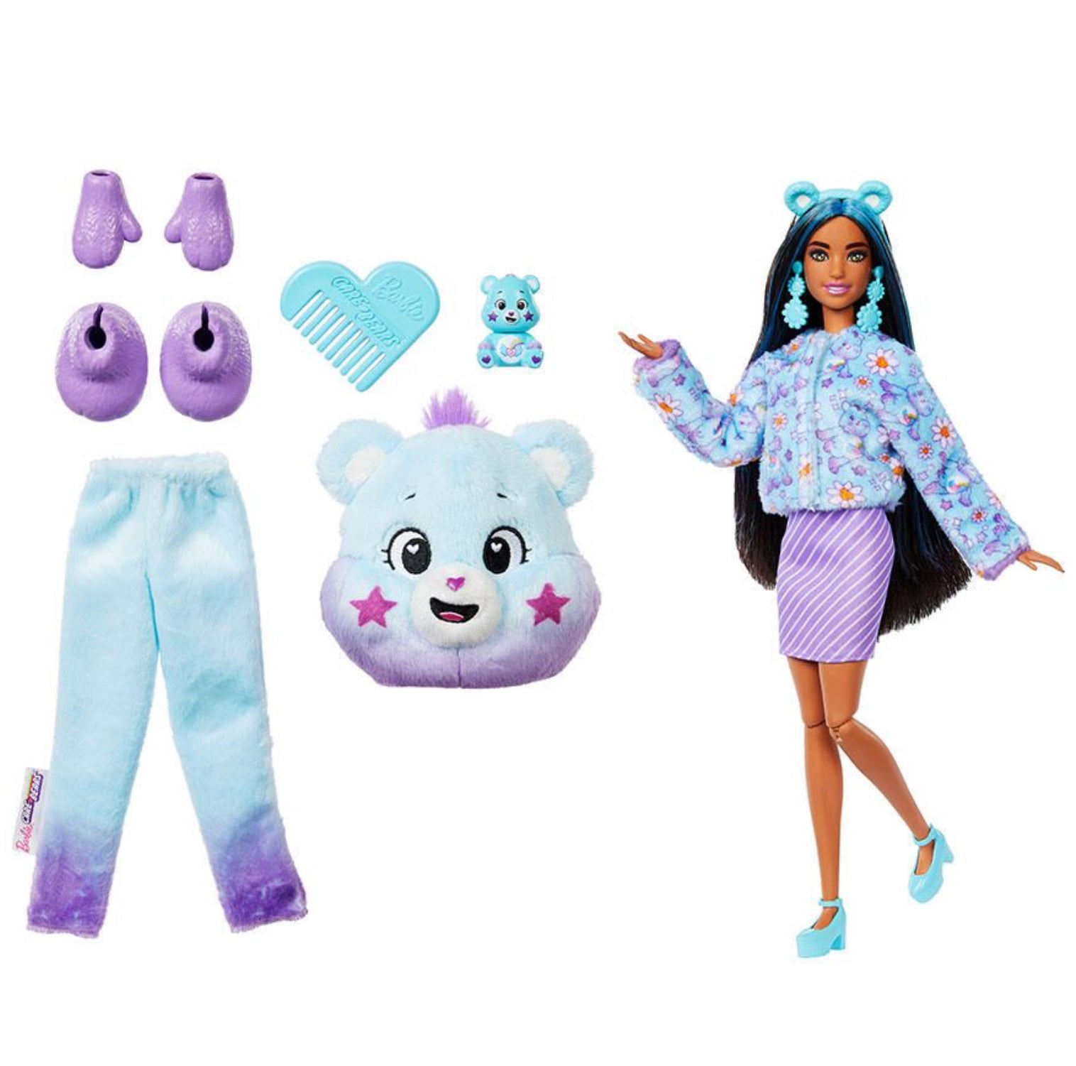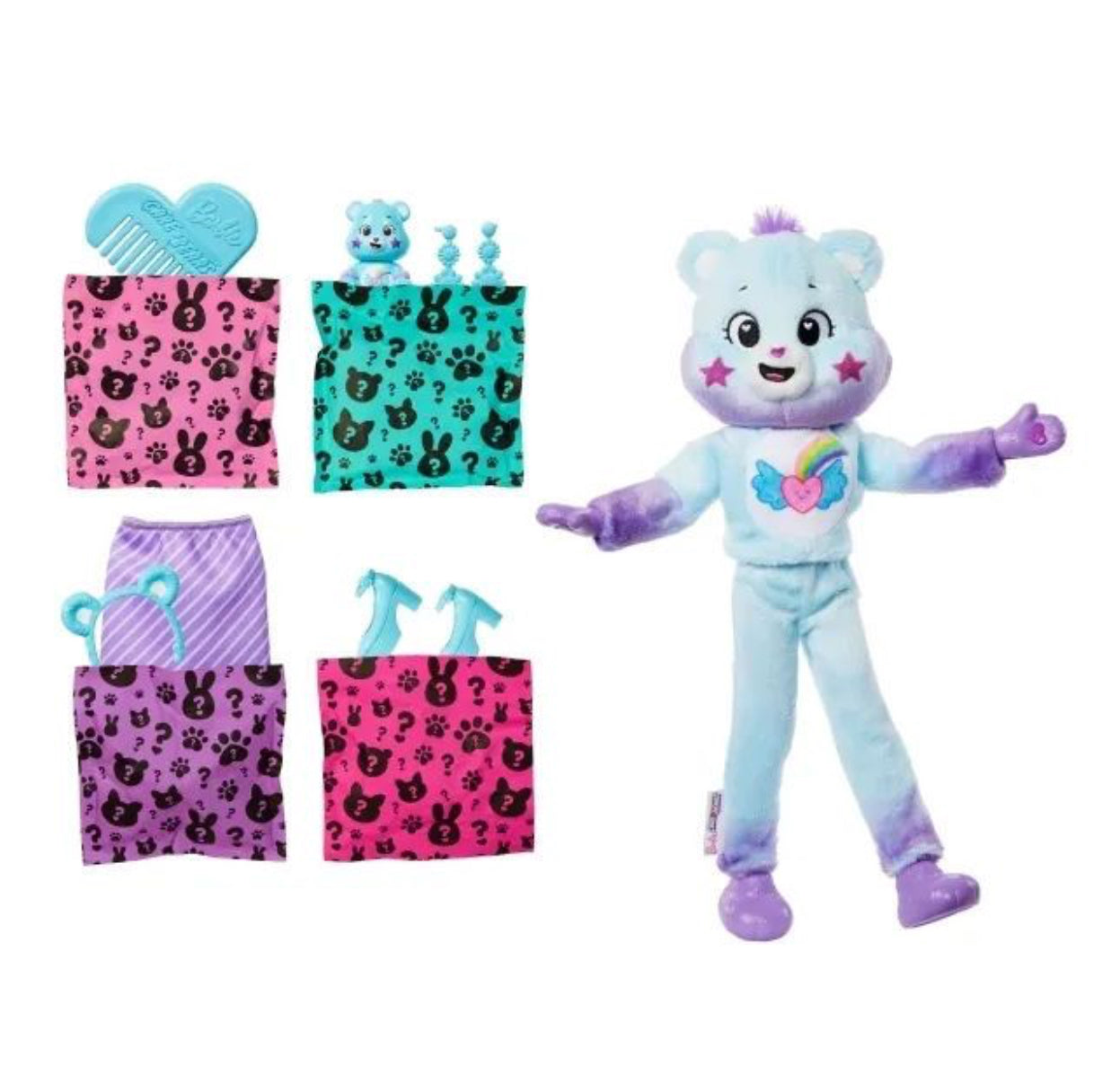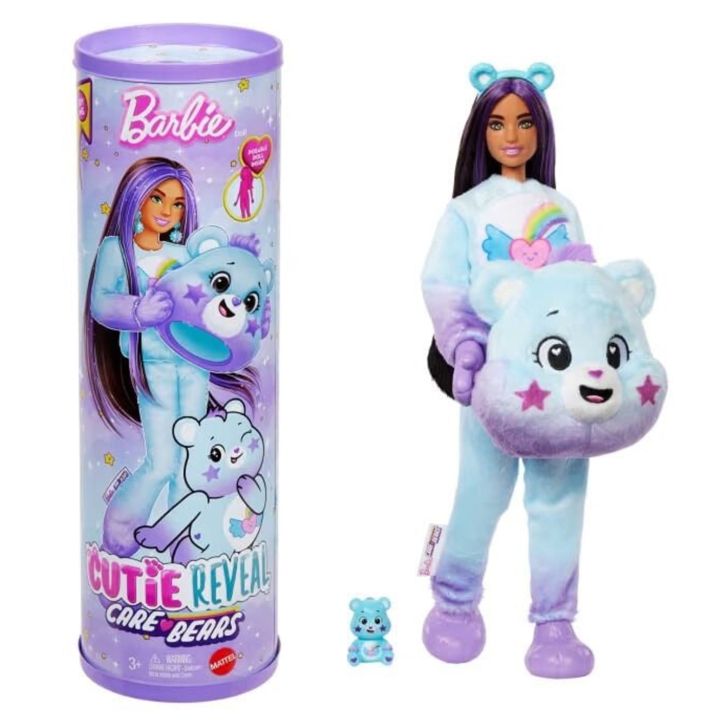 Barbie Cutie Reveal Care Bears dolls offer the cutest wow moments as kids open the package to find 10 surprises! Discover one of three different Care Bears characters in the line's second series -- Meet Dream Bright Bear! Remove the adorable plush costume to reveal a posable Barbie doll. Which doll will you reveal? Then find more surprises like a skirt, headband, earrings, a pair of boots or shoes, sponge-comb and matching mini Care Bear! Reverse the plush top for a fleece jacket and flip the costume head for a pet bed. Use water for even more cuteness with repeat colour-change transformation on the doll's face! Kids will love discovering all the cute surprises in this lovable series.