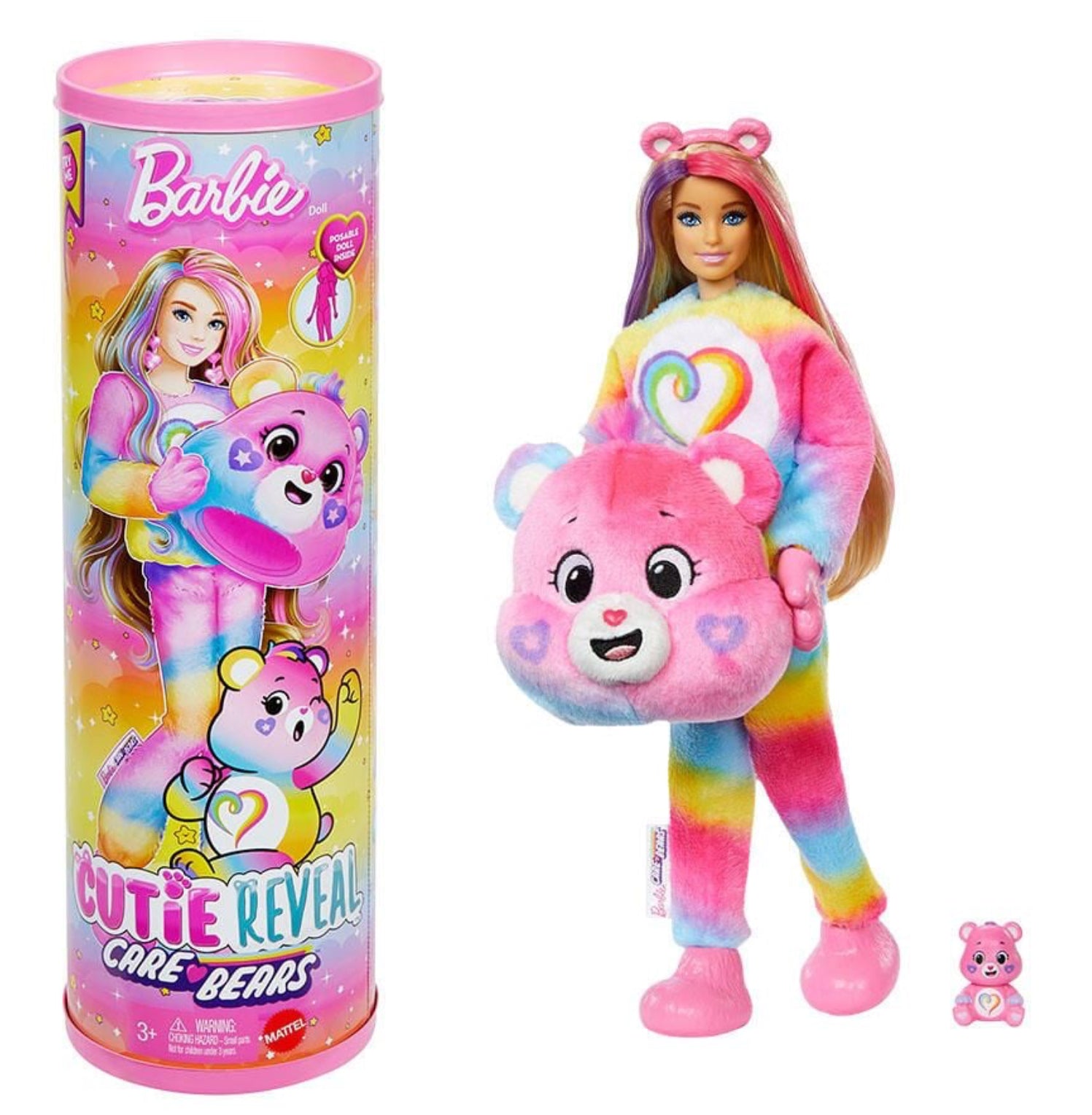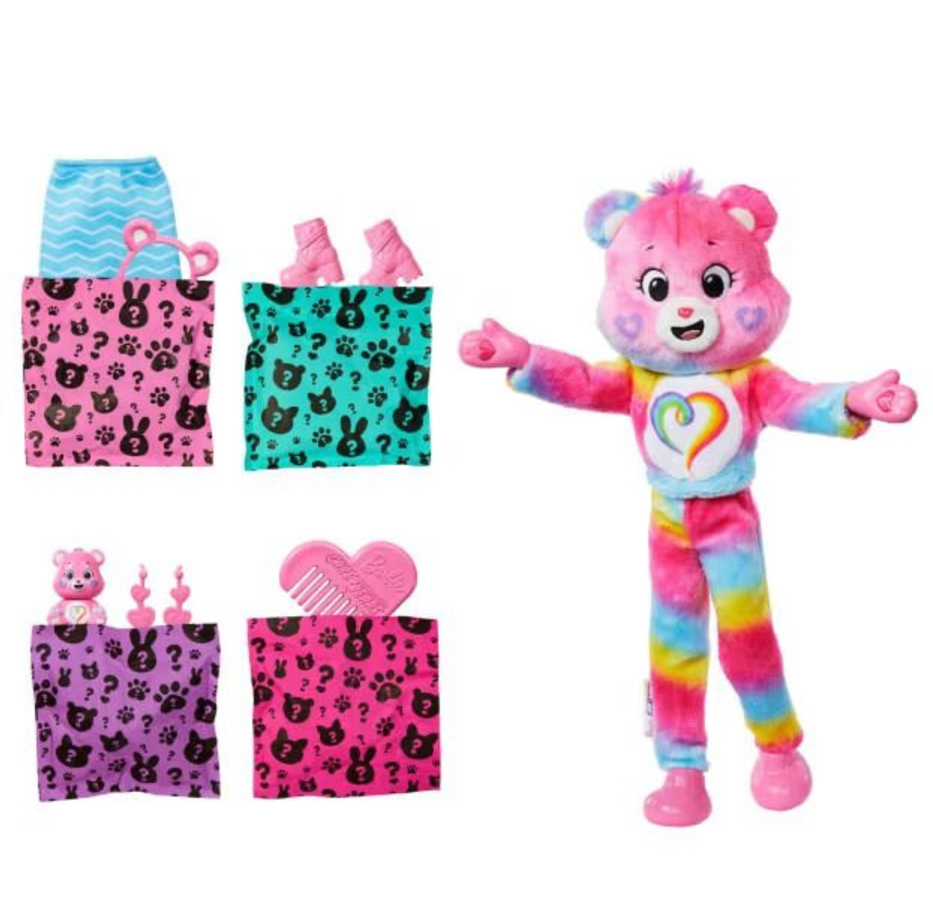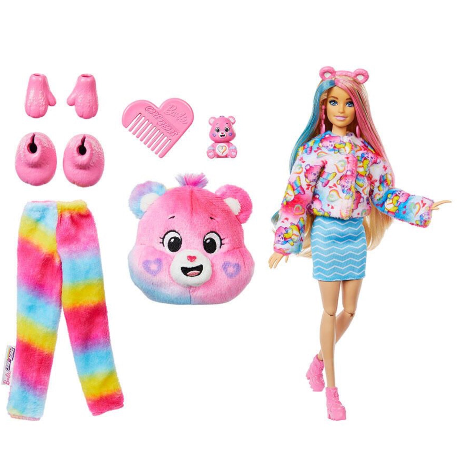 Barbie Cutie Reveal Care Bears dolls offer the cutest wow moments as kids open the package to find 10 surprises! Discover one of three different Care Bears characters in the line's second series -- Meet Togetherness Bear! Remove the adorable plush costume to reveal a posable Barbie doll. Which doll will you reveal? Then find more surprises like a skirt, headband, earrings, a pair of boots or shoes, sponge-comb and matching mini Care Bear! Reverse the plush top for a fleece jacket and flip the costume head for a pet bed. Use water for even more cuteness with repeat colour-change transformation on the doll's face! Kids will love discovering all the cute surprises in this lovable series.