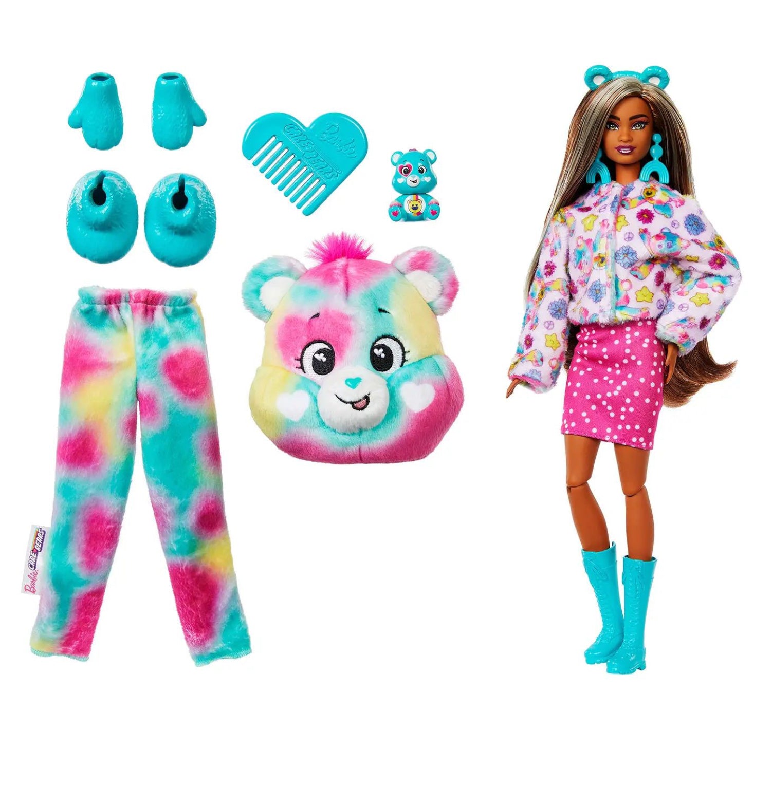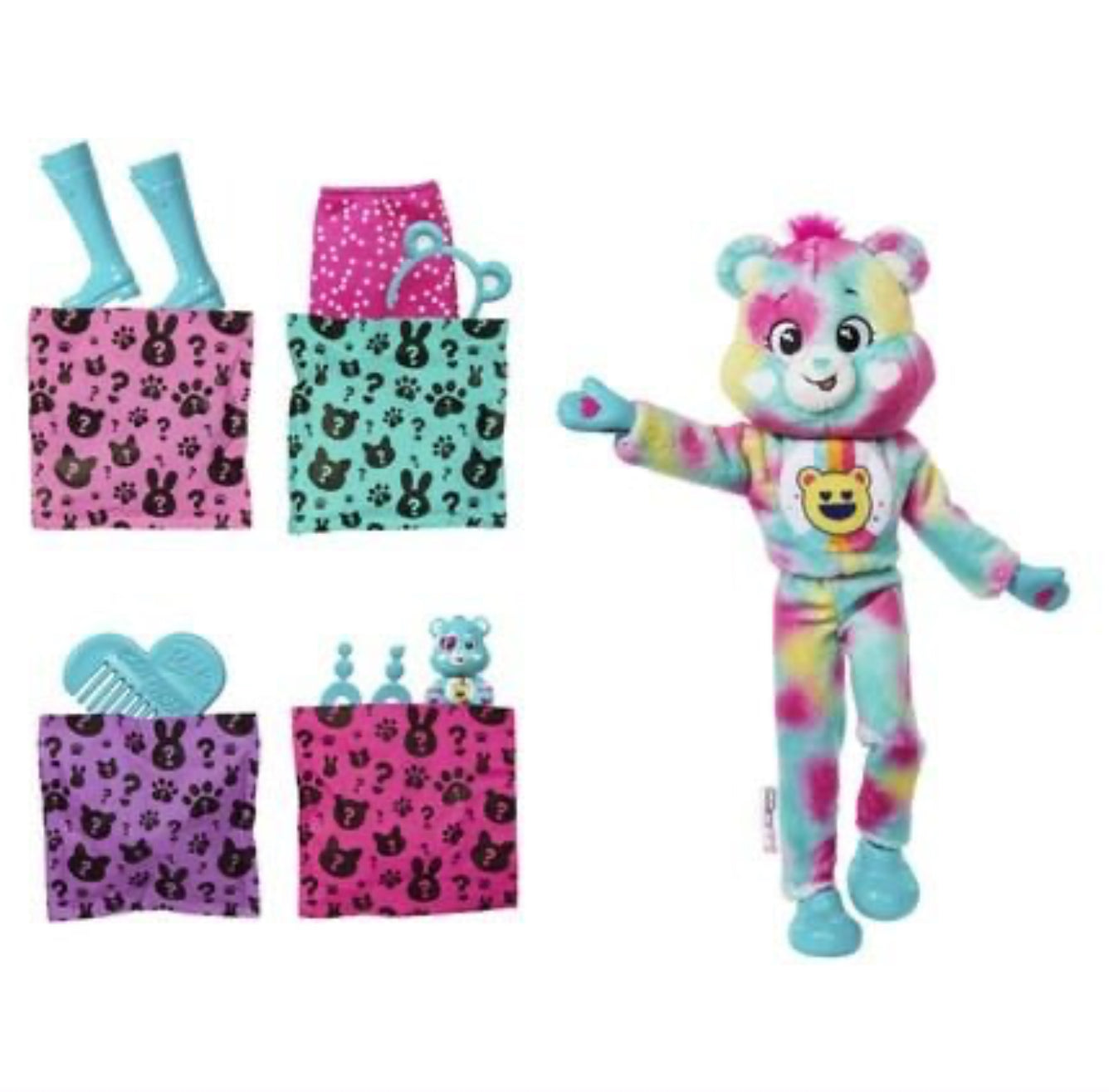 Barbie Cutie Reveal Care Bears dolls offer the cutest wow moments as kids open the package to find 10 surprises! Discover one of three different Care Bears characters in the line's second series -- Meet Good Vibes Bear! Remove the adorable plush costume to reveal a posable Barbie doll. Which doll will you reveal? Then find more surprises like a skirt, headband, earrings, a pair of boots or shoes, sponge-comb and matching mini Care Bear! Reverse the plush top for a fleece jacket and flip the costume head for a pet bed. Use water for even more cuteness with repeat colour-change transformation on the doll's face! Kids will love discovering all the cute surprises in this lovable series.