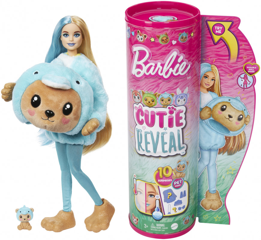 Remove the plush costume to reveal a posable Barbie doll with long, colourful hair. Discover more surprises to open like a pair of shoes, a purse and a matching mini pet. Reverse the plush top for a fleece jacket and flip the costume head for a pet bed. Icy cold water adds even more cuteness with colour-change transformations on the doll's face and mini pet; warm water changes them back for repeat fun.