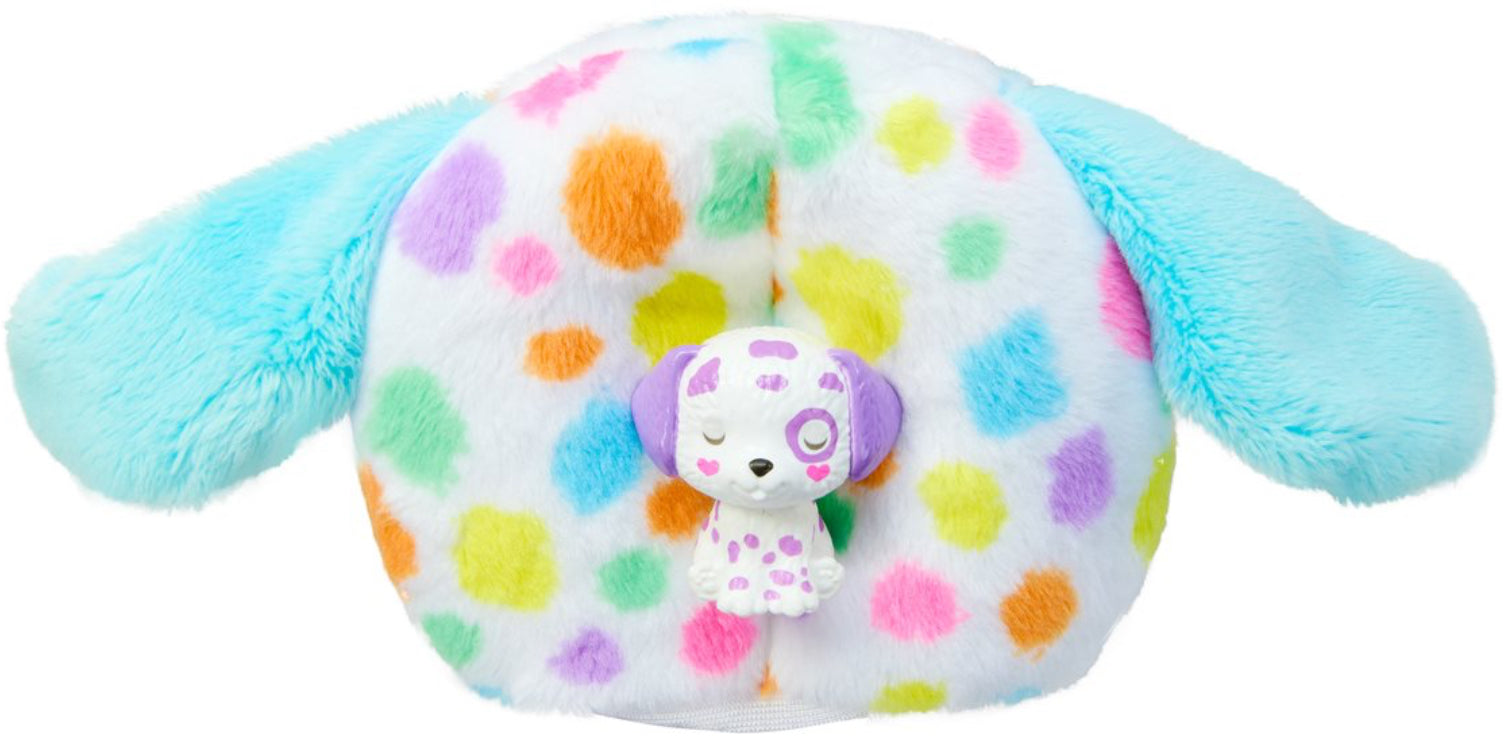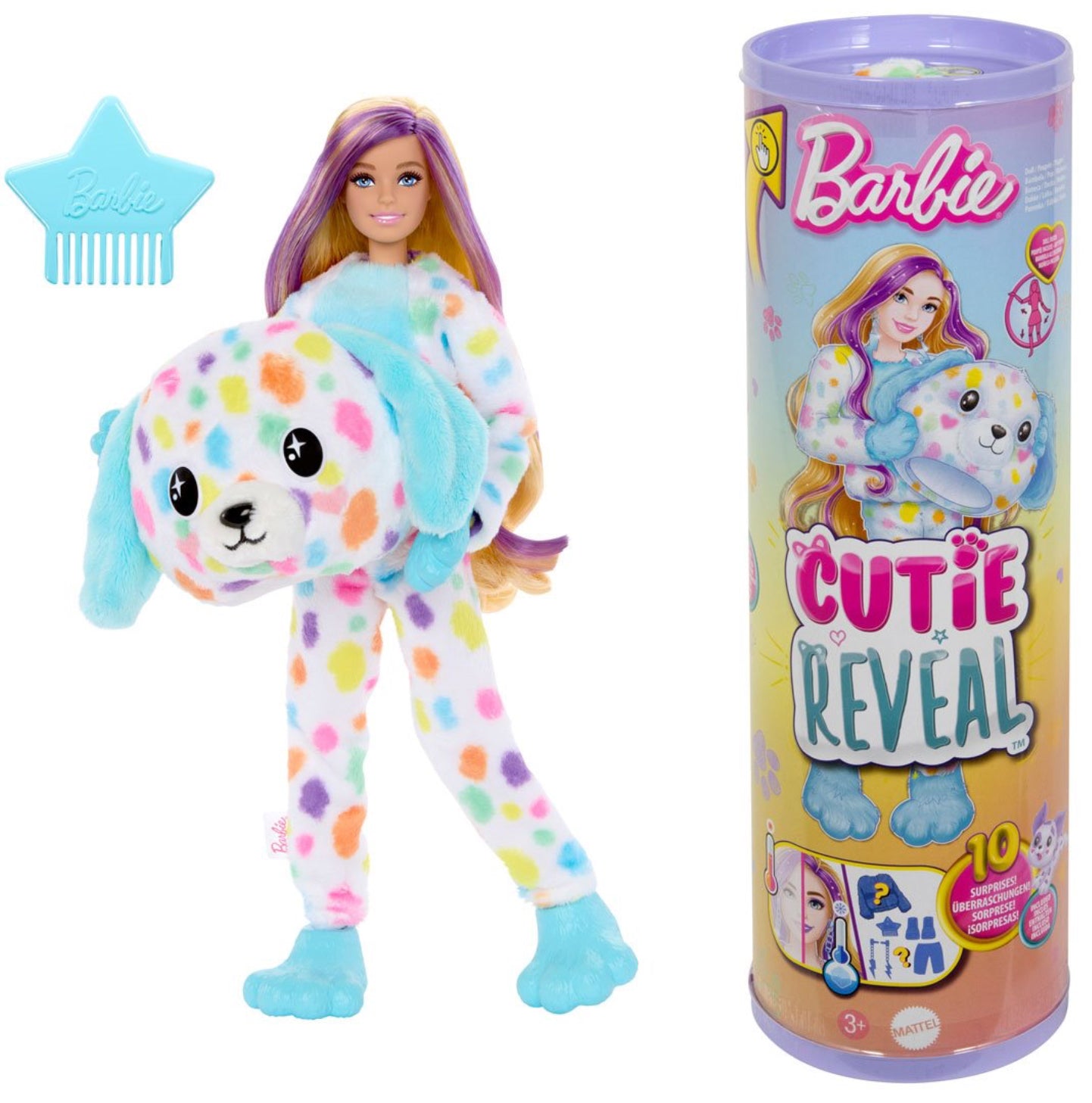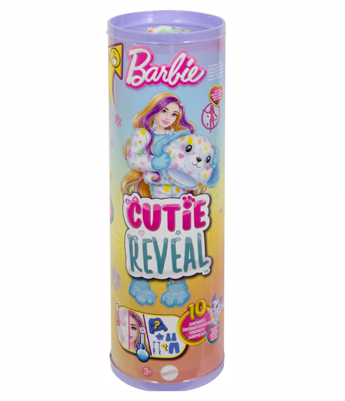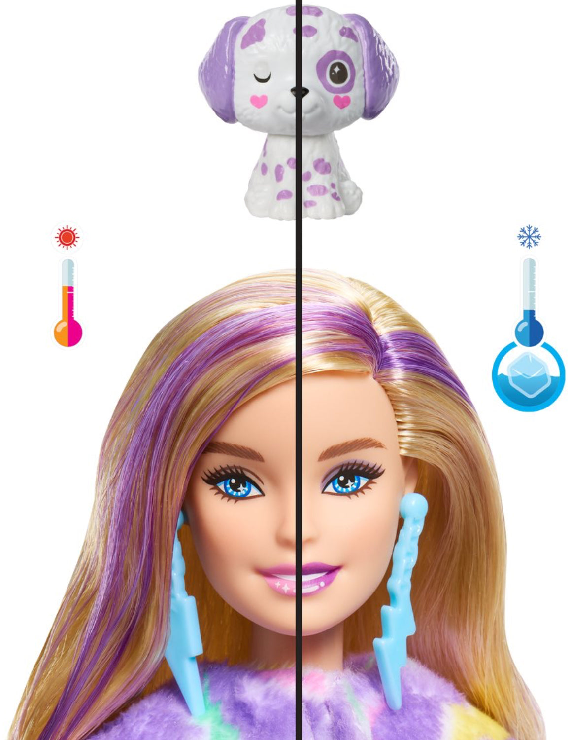 Barbie Cutie Reveal Color Cream Series dolls offer the cutest unboxing experience with 10 surprises! Which doll will you find? There's a Bunny, Zebra, Penguin or Dalmatian -- transformed from black and white to a dreamy rainbow colored-pattern on their fur and hiding a fashion doll inside. Remove the plush costume to reveal a posable Barbie doll with long, colorful hair. Discover more surprises to open like a skirt or shorts, a pair of shoes, earrings, a star-shaped comb and a matching mini pet. Reverse the plush top for a fleece jacket and flip the costume head for a pet bed. Icy cold water adds even more cuteness with color-change transformations on the doll's face and mini pet; warm water changes them back for repeat fun! Kids will love discovering -- and collecting -- all the cute surprises in this adorable Barbie Cutie Reveal Color Dream Series.