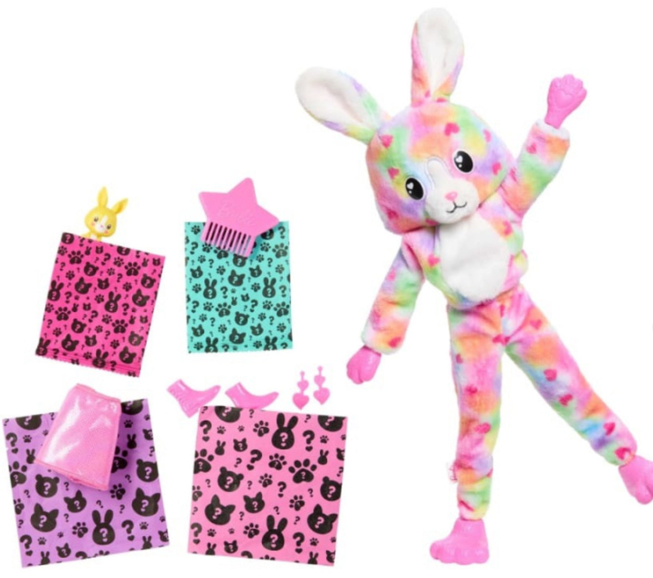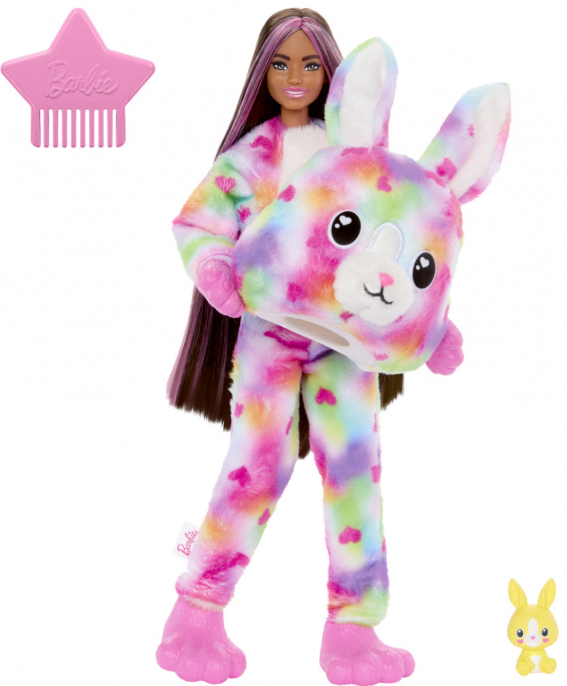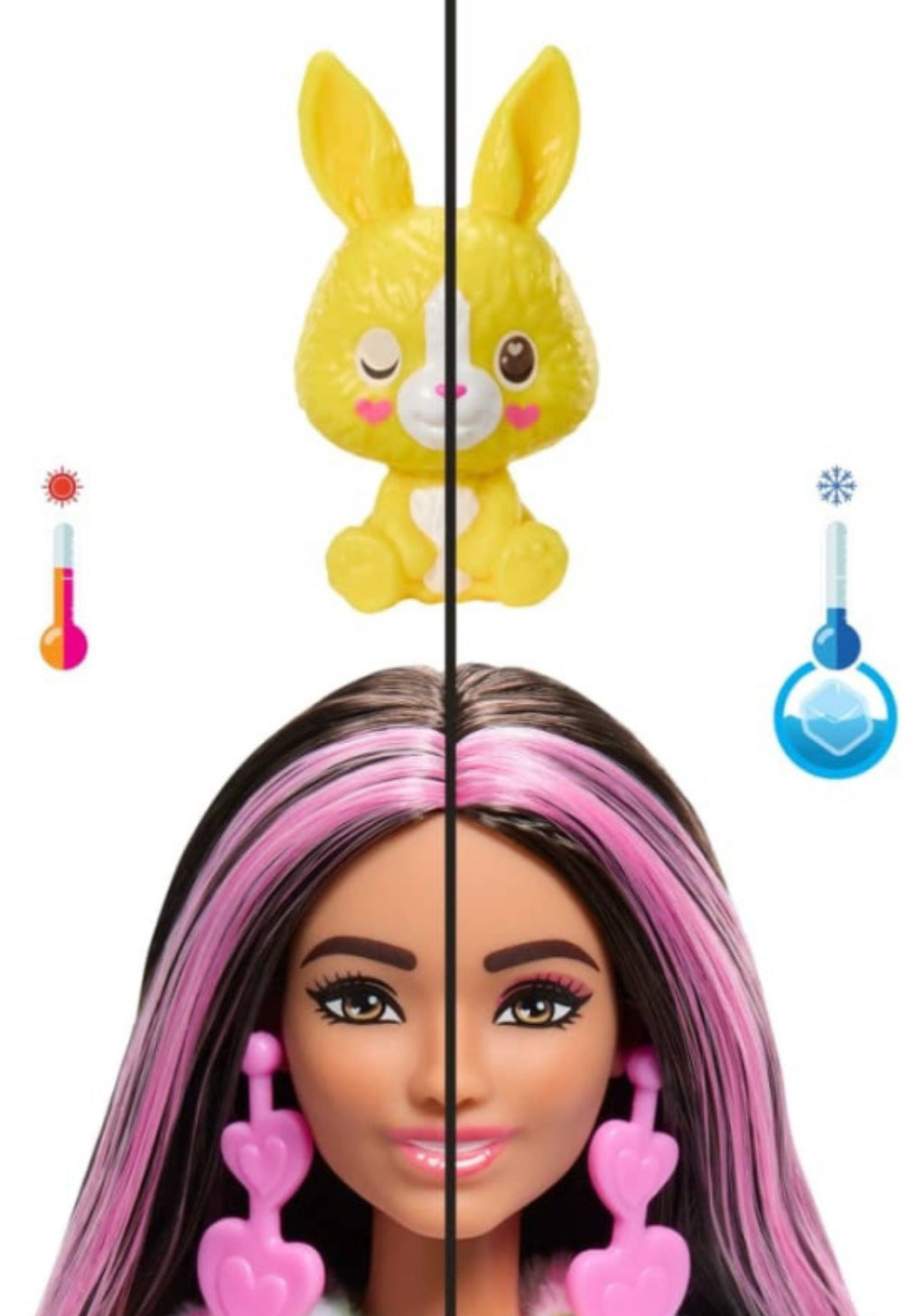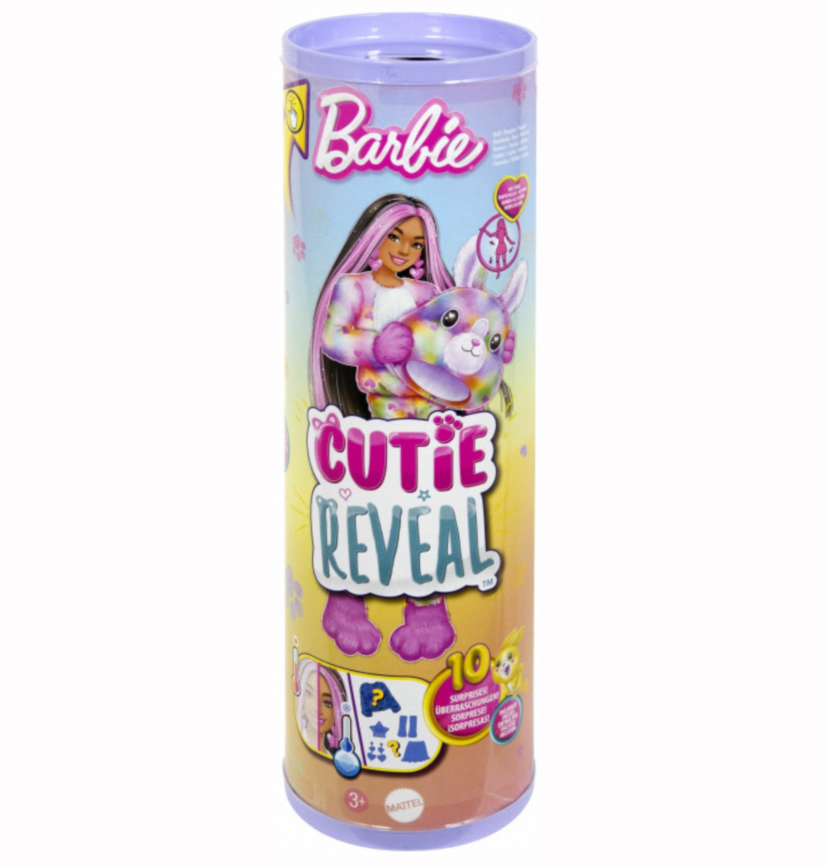 Barbie Cutie Reveal Color Cream Series dolls offer the cutest unboxing experience with 10 surprises! Which doll will you find? There's a Bunny, Zebra, Penguin or Dalmatian -- transformed from black and white to a dreamy rainbow colored-pattern on their fur and hiding a fashion doll inside. Remove the plush costume to reveal a posable Barbie doll with long, colorful hair. Discover more surprises to open like a skirt or shorts, a pair of shoes, earrings, a star-shaped comb and a matching mini pet. Reverse the plush top for a fleece jacket and flip the costume head for a pet bed. Icy cold water adds even more cuteness with color-change transformations on the doll's face and mini pet; warm water changes them back for repeat fun! Kids will love discovering -- and collecting -- all the cute surprises in this adorable Barbie Cutie Reveal Color Dream Series.