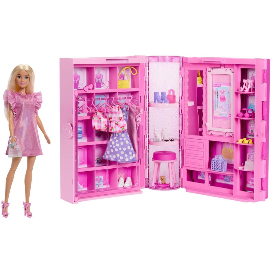 This Barbie Dream Closet is packed with endless styles and stories kids can create for Barbie! Open the glittery pink wardrobe to reveal a 91cm-wide playset with 2 clothing racks, 20+ storage spaces, a fold-down vanity with a pop-up mirror, full-length mirror, and shoe shelf. There's even a pillow for the pet puppy! Kids will love styling the included Barbie fashion doll with 25+ clothes and accessories like dresses, shoes, necklaces, and purses galore. Mix and match 3 complete looks for Barbie to dive into styling and storytelling play! Kids can help Barbie doll choose an outfit on the rack, style and accessorize at the mirror, then finish getting ready at the vanity before she heads out in style with her pet pup for the best day ever! For easy storage, all the pieces fit inside the closet with a pink Barbie handle for on-the-go fun. Doll cannot stand alone. Colours and decorations may vary.