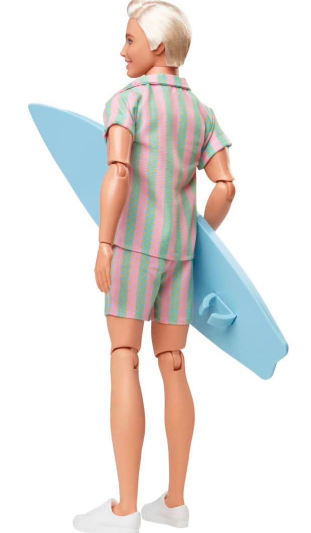 Greetings from Barbie Land! Inspired by Ken’s character in Barbie™ The Movie, this Ken® doll wears a beachy, striped matching set. With a surfboard in tow, he’s having the best day ever in Barbie Land! Celebrating Barbie™ The Movie, this Ken® doll makes a great gift for fans and collectors alike. Doll cannot stand alone. Colors and decorations may vary.