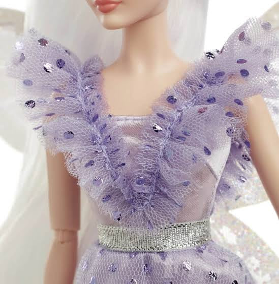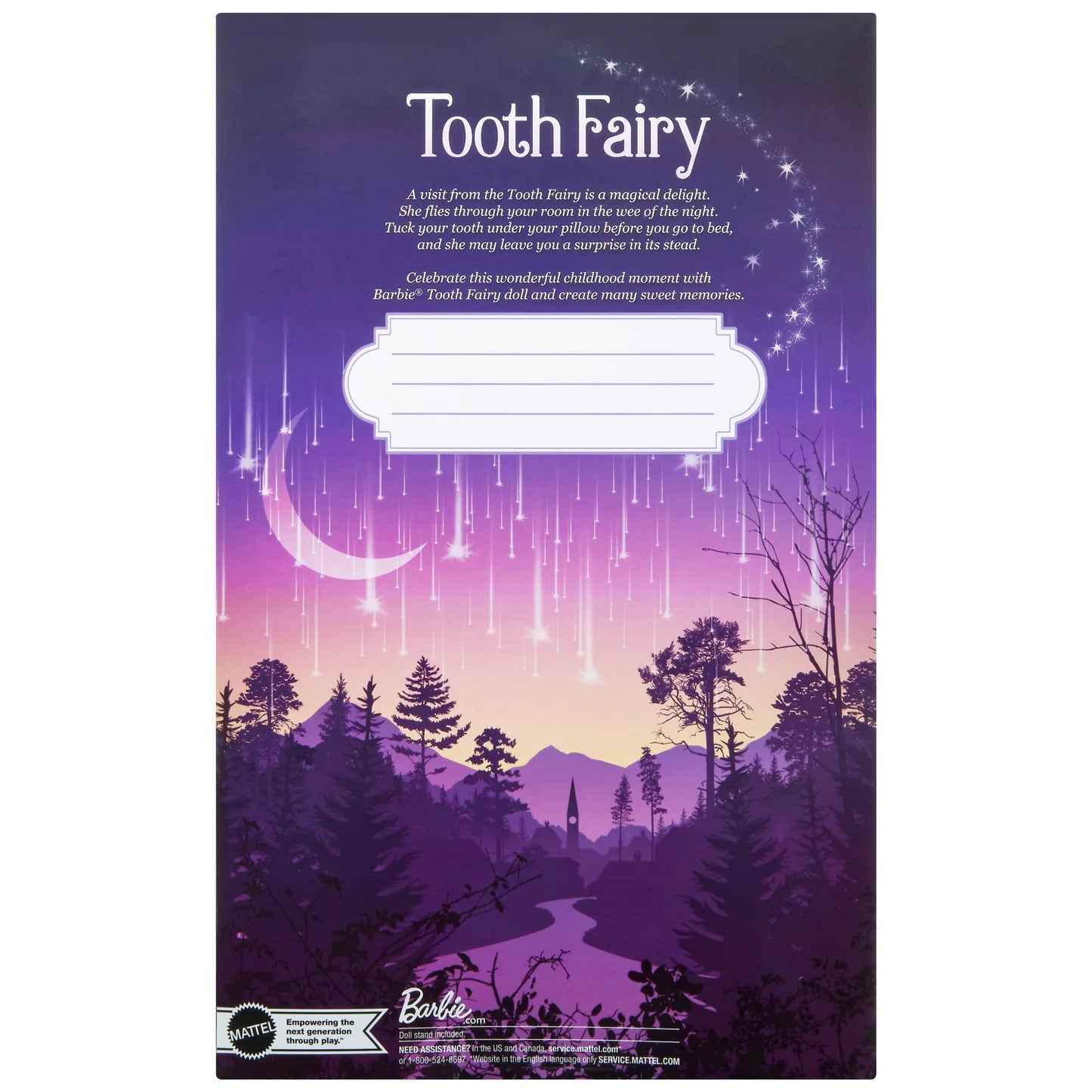 A visit from the tooth fairy is a magical milestone. This collectible Barbie doll commemorates the sweet moment with a fantastical look and accessories. Barbie Tooth Fairy doll wears a pretty, periwinkle dress featuring fluttery ruffles, sparkling polka dots and a beaded belt. Her look is complete with shimmery fairy wings, a silvery wand and a gemstone-encrusted tiara in her whimsical white hair. With a shimmering bag of silvery coins and packaging featuring space to write a personalized message, Barbie Tooth Fairy doll makes the perfect gift to celebrate such a special day. Includes doll stand and Certificate of Authenticity. Doll cannot stand alone.