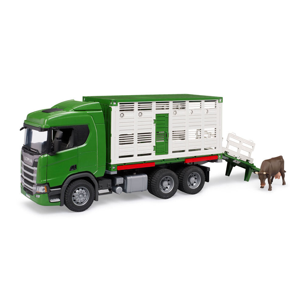 The truck has everything needed for today's transport of animals: Loading and unloading of animals is risk-free, thanks to a foldable and extendable ramp equipped with grates, a mobile internal dividing grate which allows define the right space for all breeds, integrate drinkers and much more. The Scania is supplied together with a perfectly scaled ox